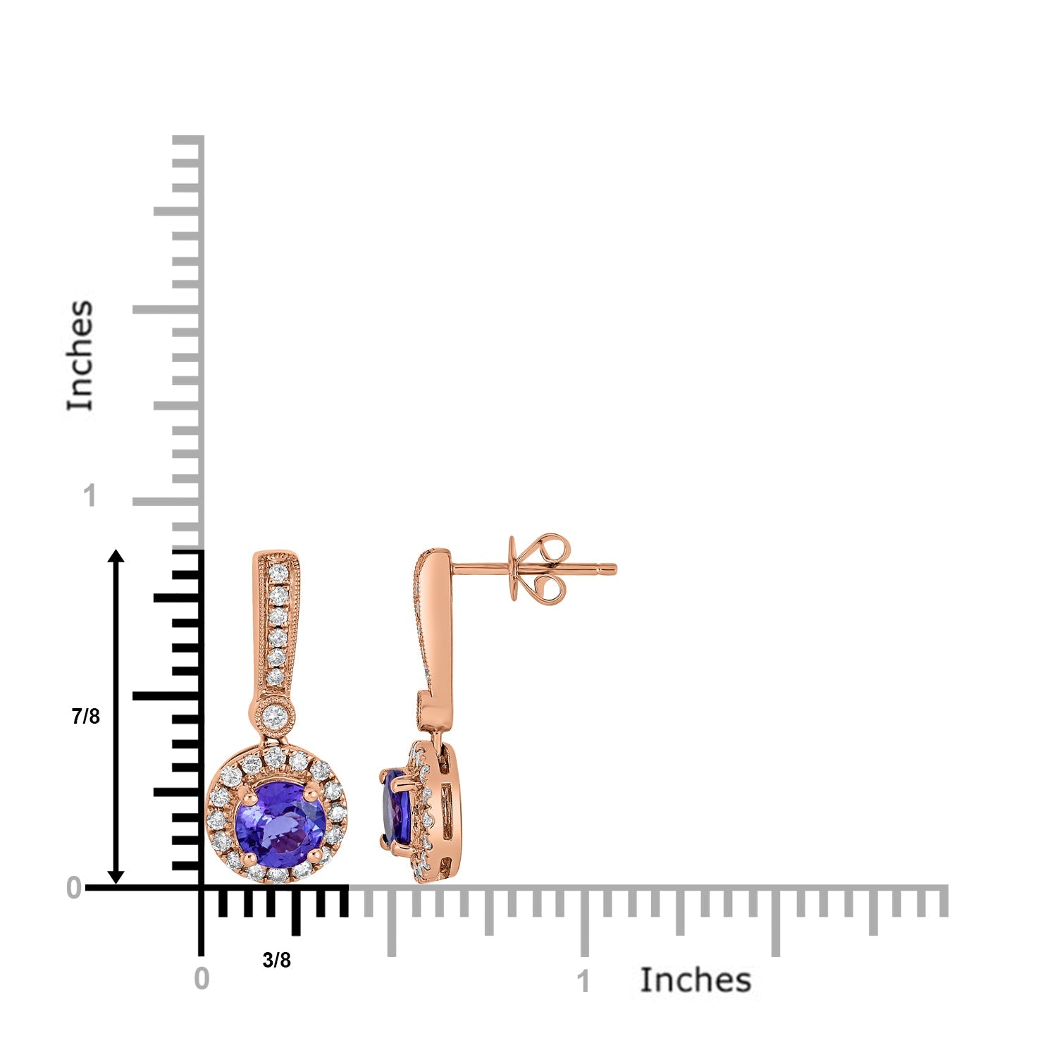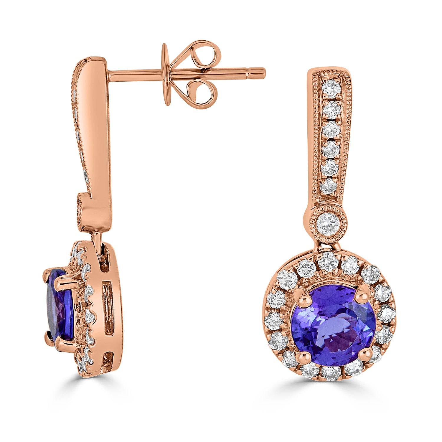 Designed of 14k rose gold, these earrings are a perfect pick for parties and special events. The timeless charm of round-cut Tanzanite manifests in this design. Moreover, the round Diamonds add sparkle to the piece.