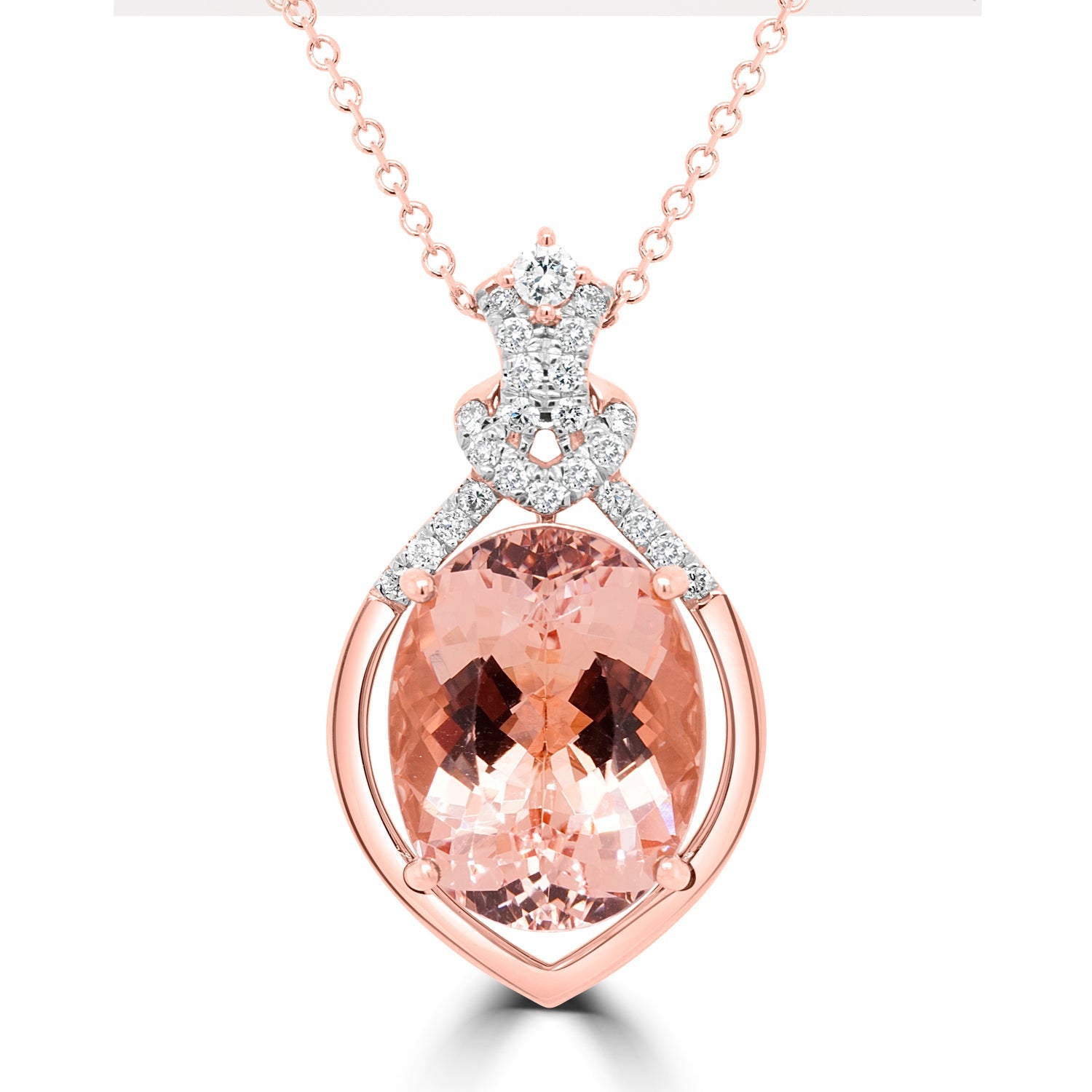 Displaying a marvelous blend of colors, this stunning pendant is designed with 14K rose gold. Set with a striking oval cut Morganite, this exquisite piece of jewelry is bordered by glittering round cut Diamonds for a mesmerizing finish.