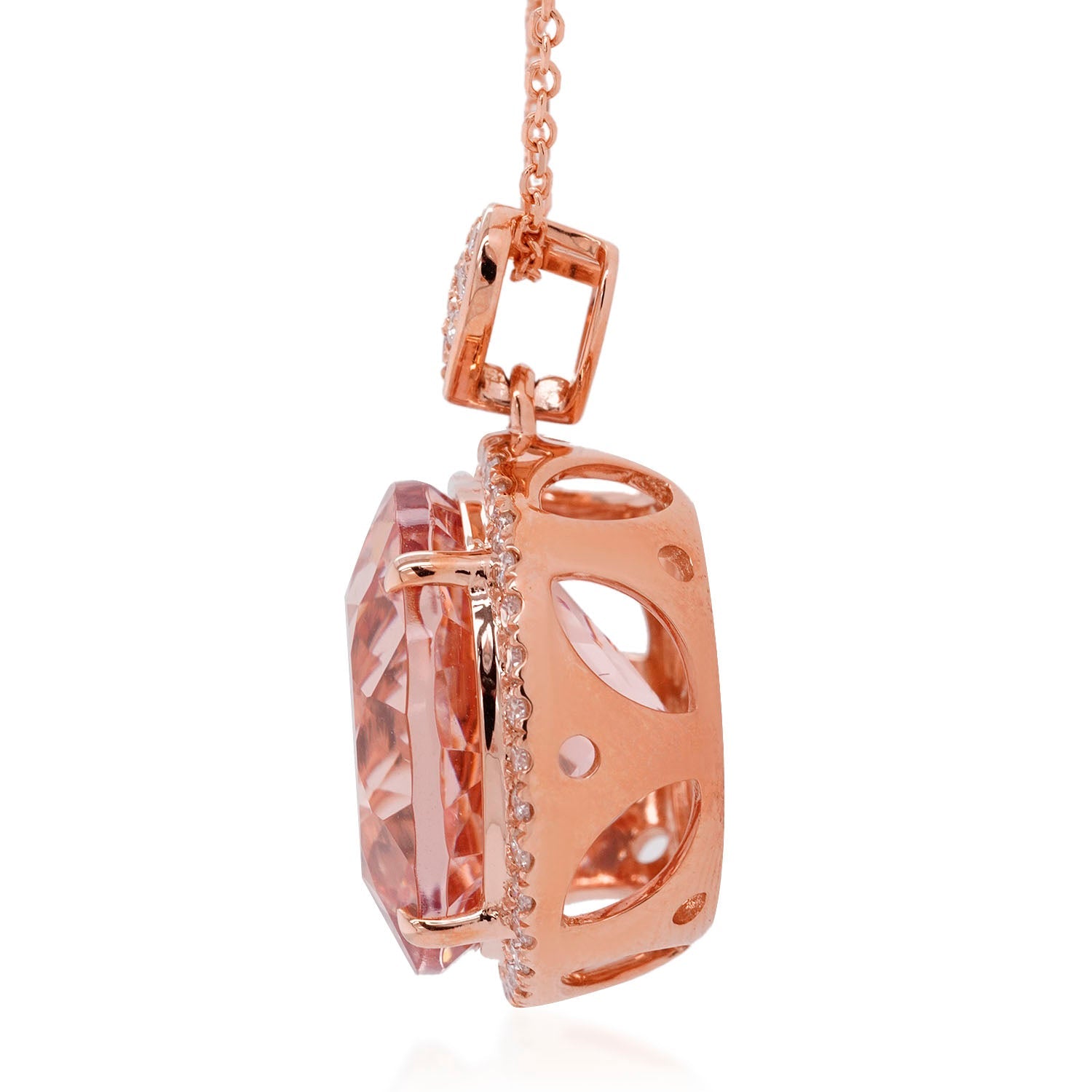 Be enchanted by the artistry and beauty of this pendant that is adorned with a round cut Morganite. This pendant is perfect for any event and can be worn comfortably for hours. On top of that, Diamonds are perfectly accented in 14k rose gold with perfect harmony.