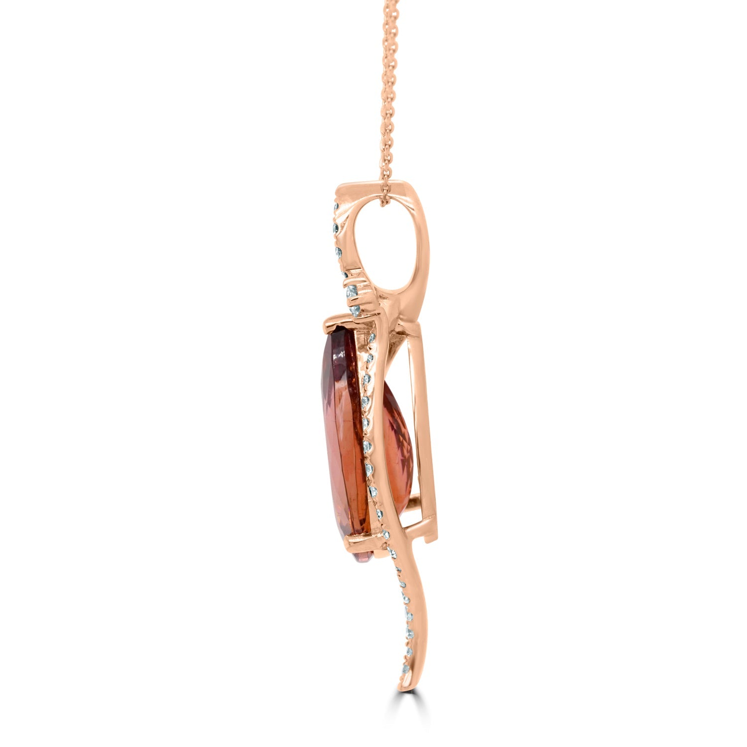 Crafted with 14K rose gold, the charming pendant is set with a pear cut Tourmaline and encircled by glittering round cut Diamonds that are sure to dazzle everyone around.