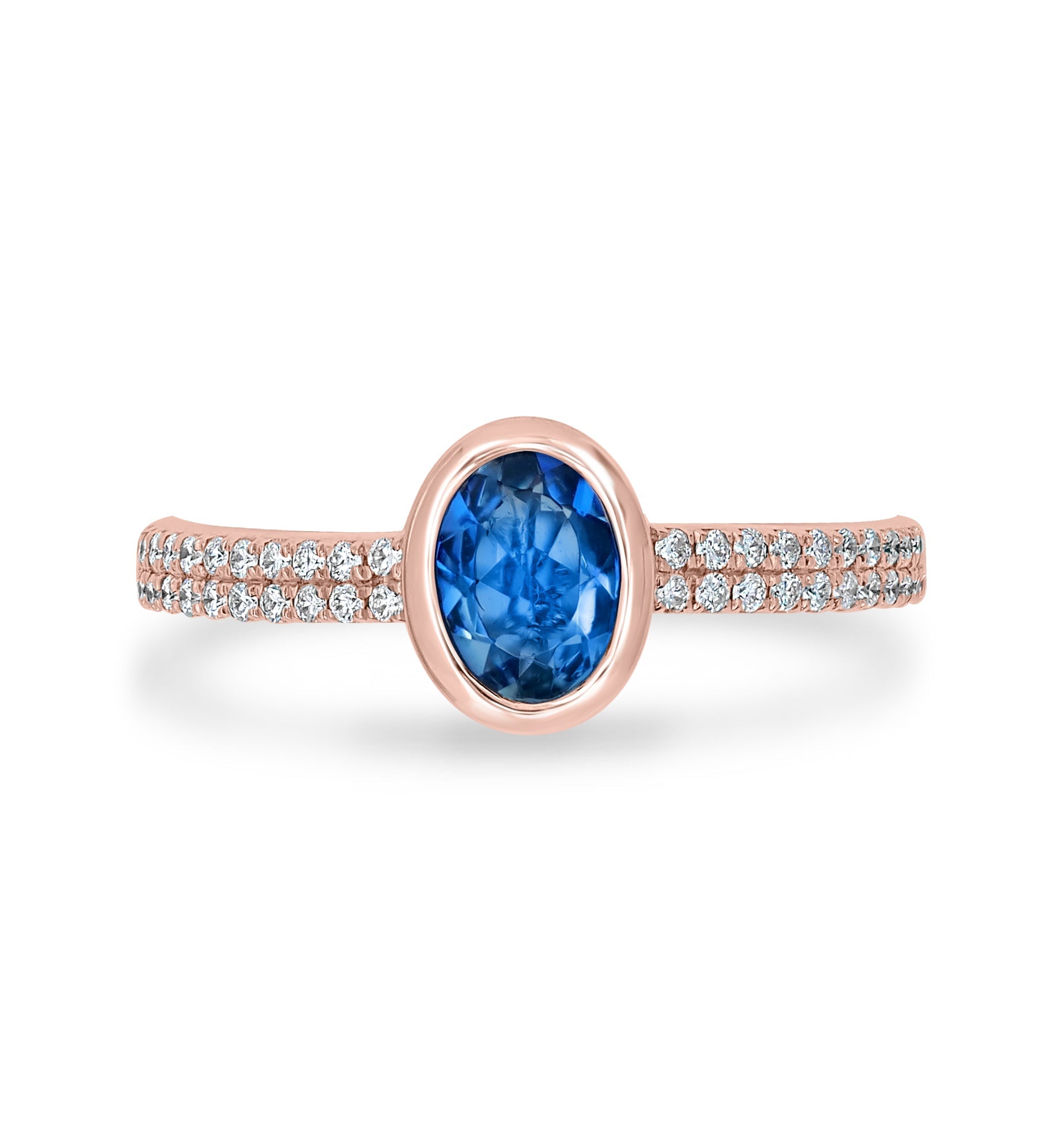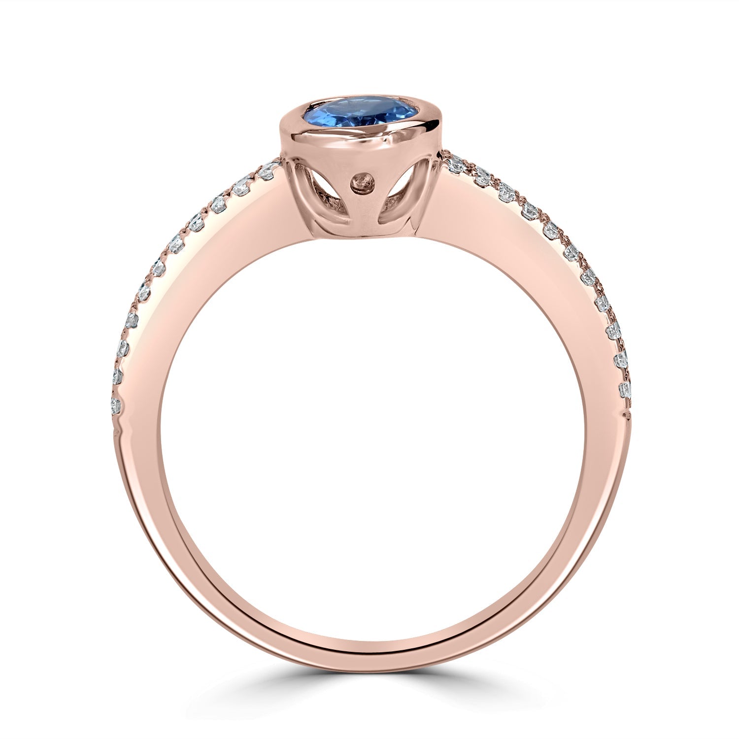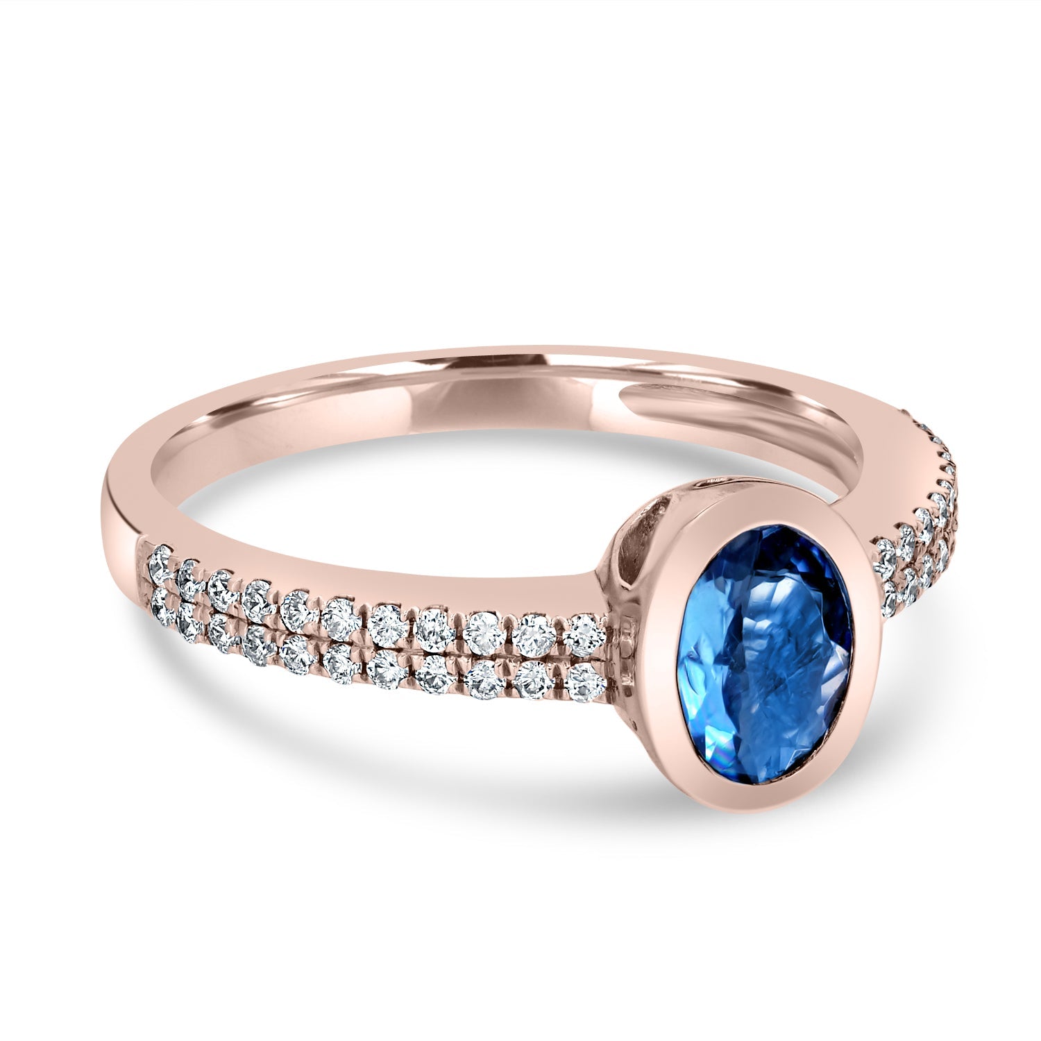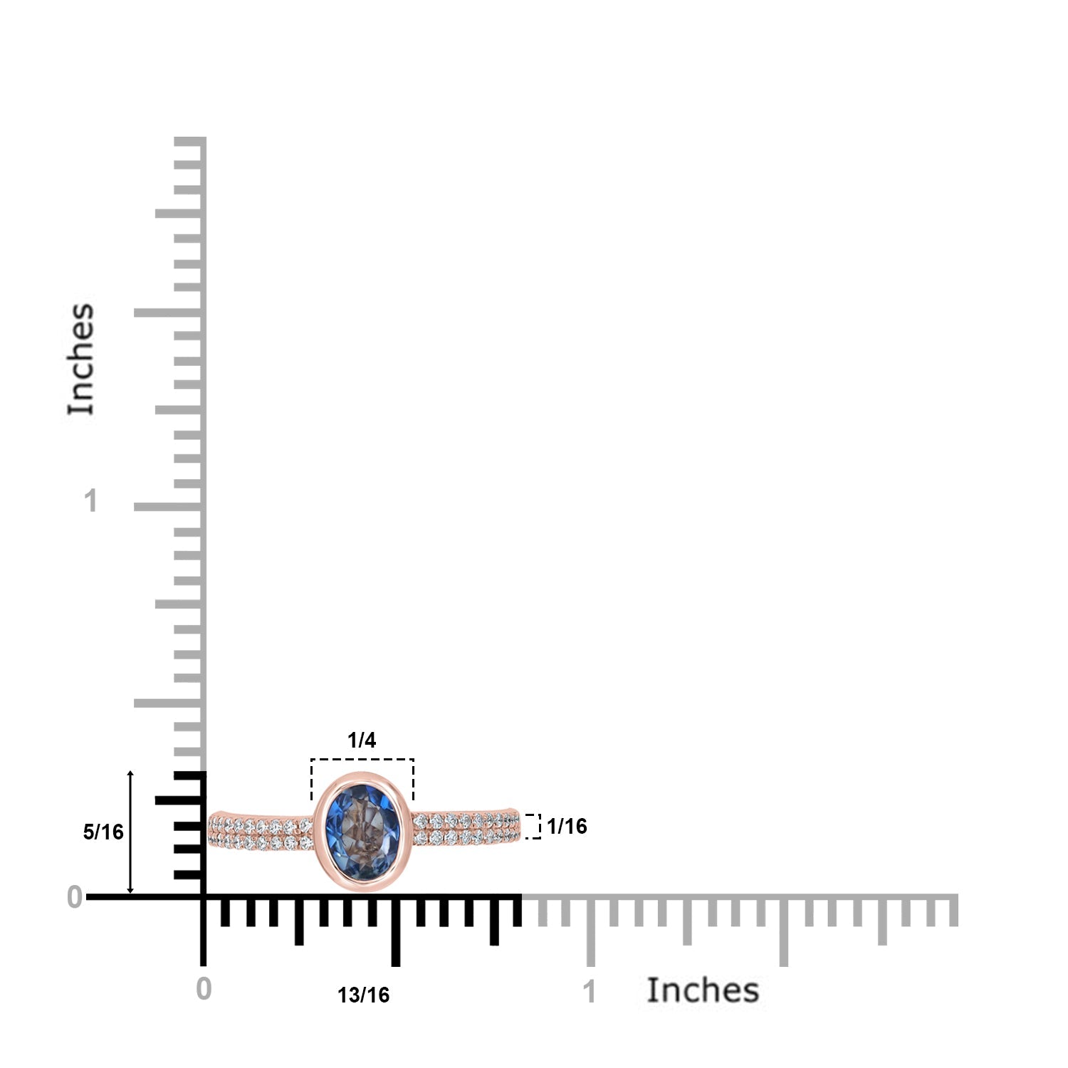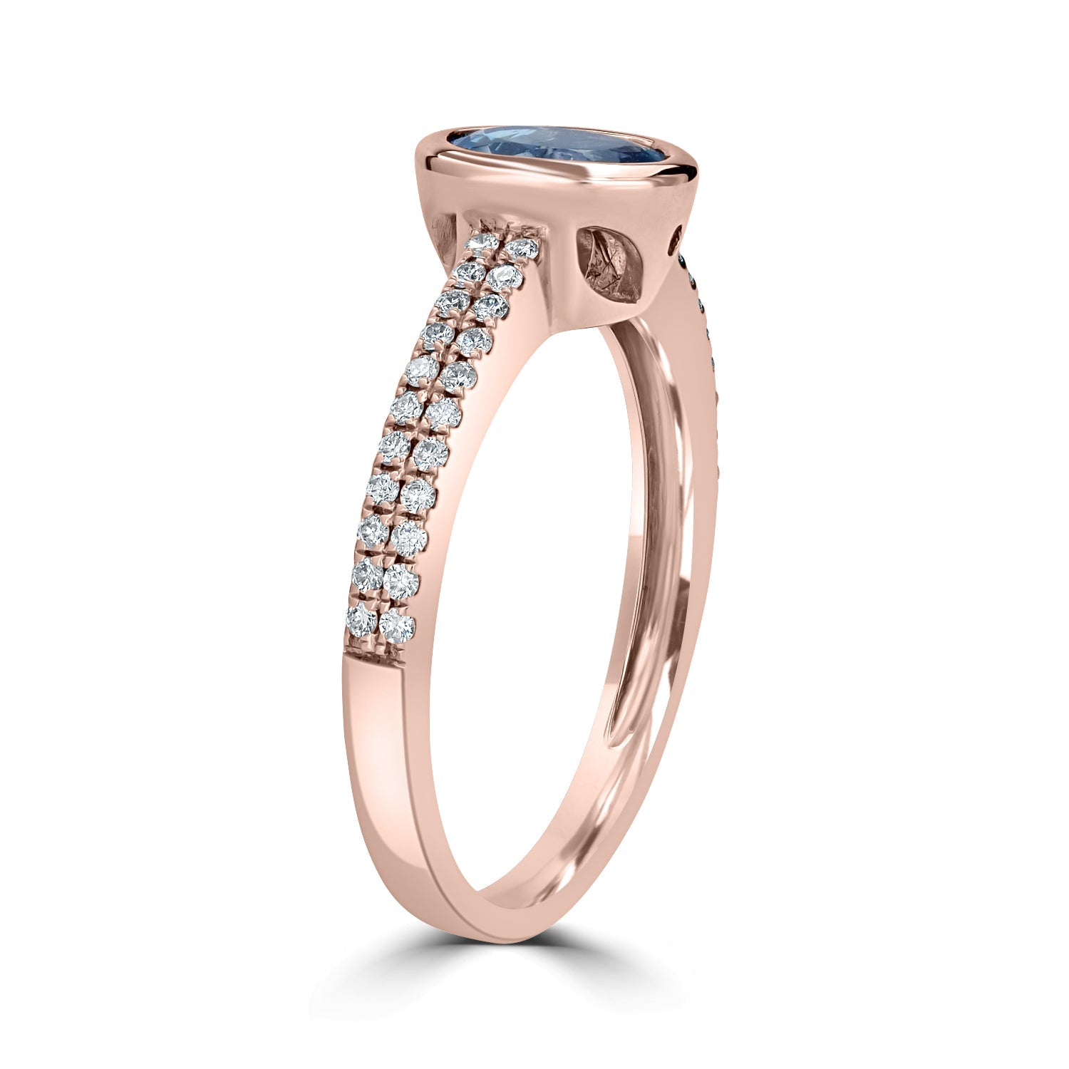 This 14K rose gold ring is set with a spectacular oval-cut Aquamarine and glittering round Diamond. Wear it to make a lasting impression.