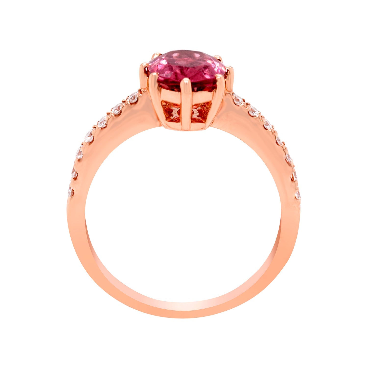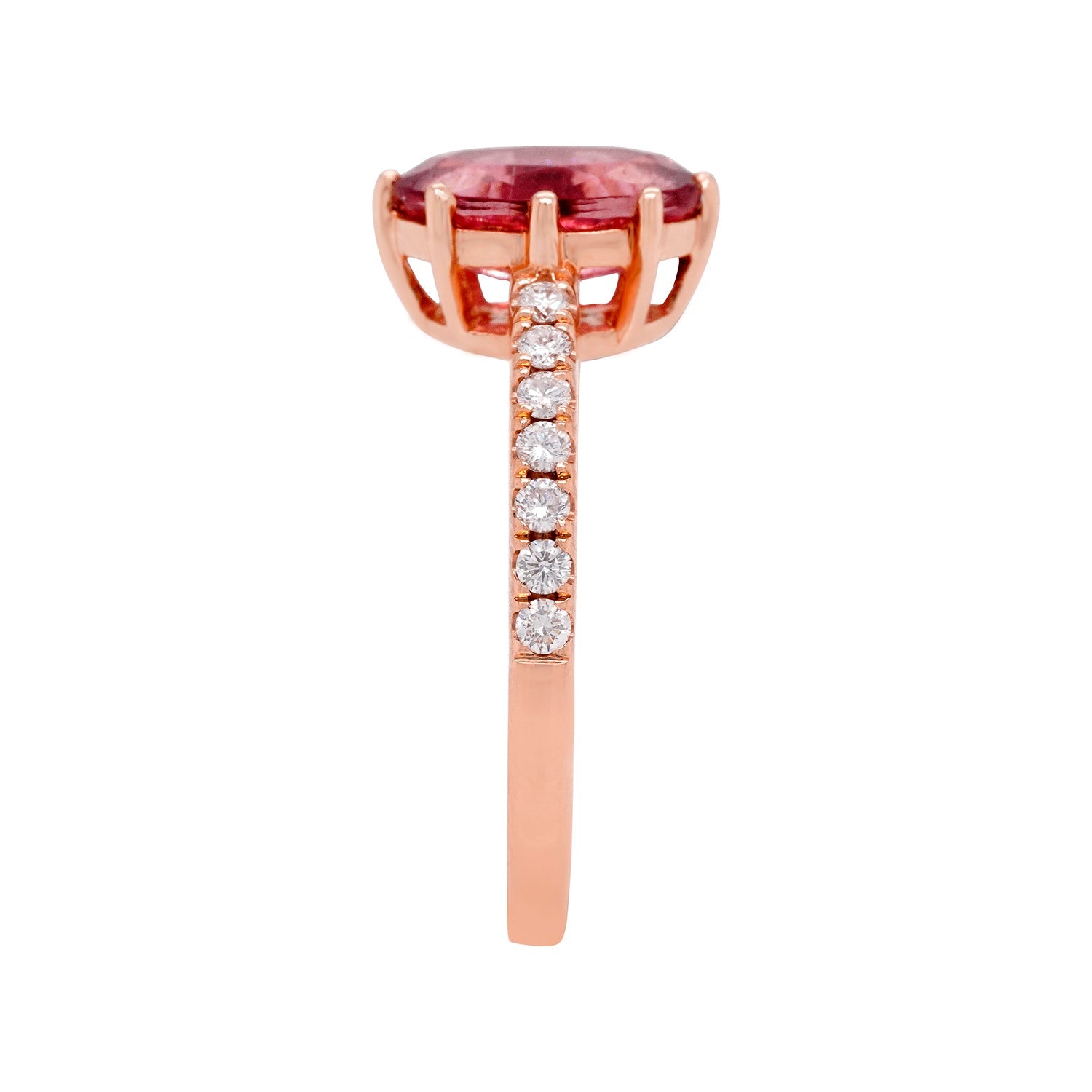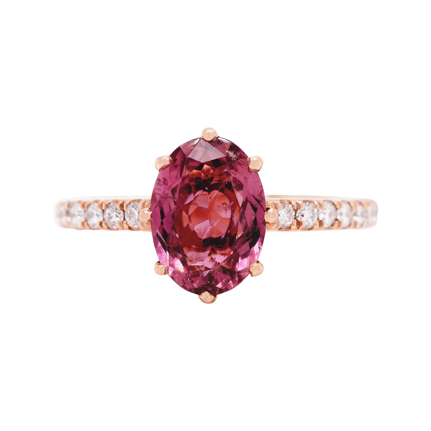 Showing off an excellent quality tourmaline in an oval cut, the elegance of this classy ring is a perfect match for any attire. Accentuated further by round diamonds that surround the stone, it spreads a delicate glitter that adds shine to your daily wear. Crafted in 14K rose gold, the luster of this adorable ring is just what you need to keep smiling!