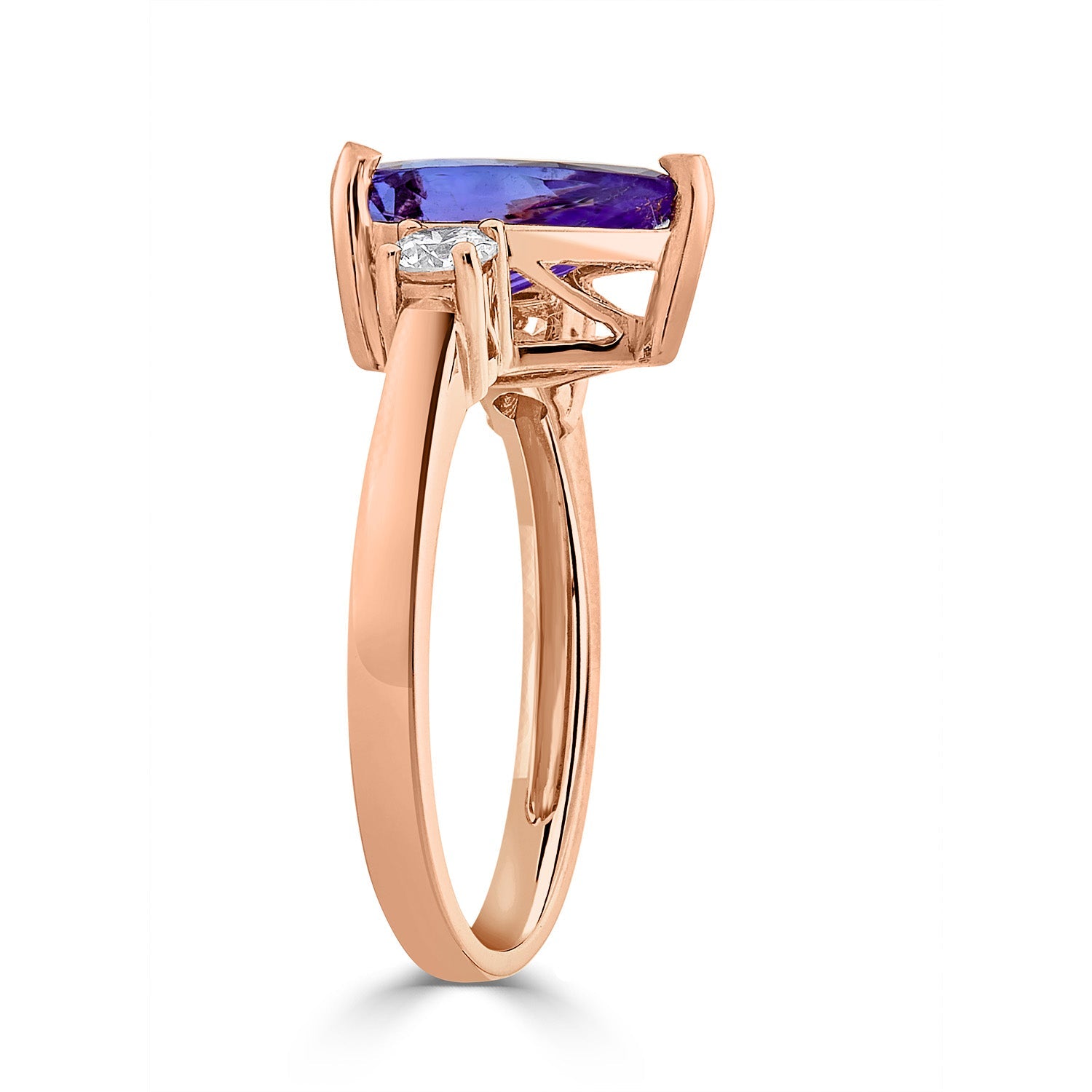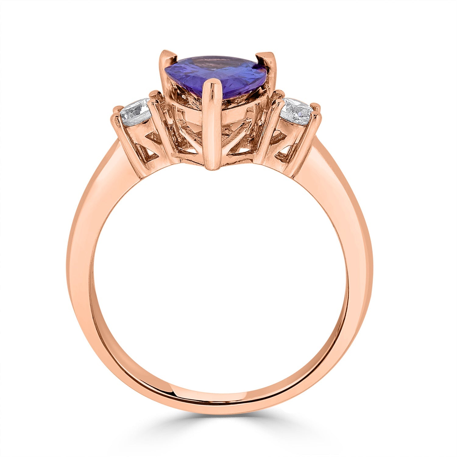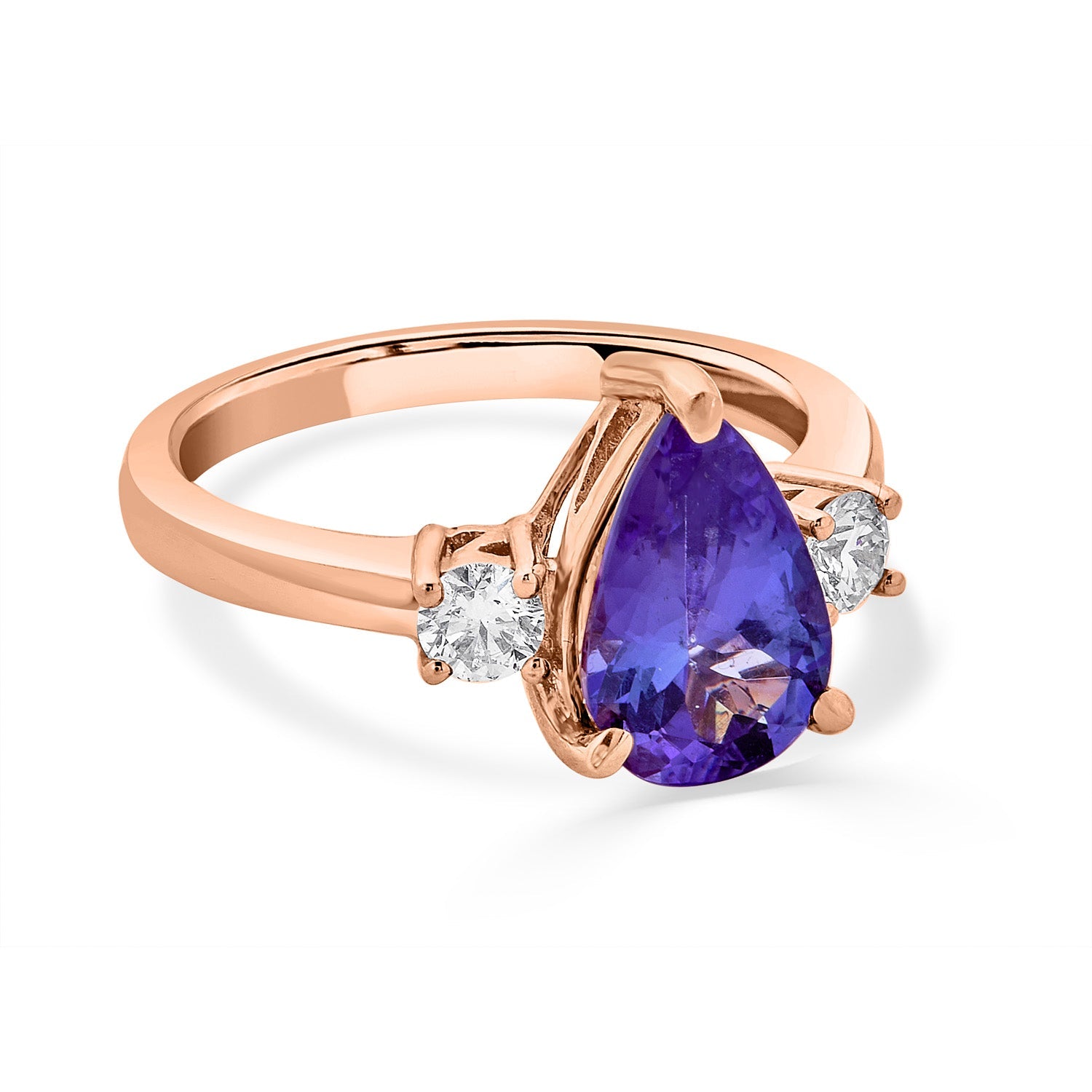 Designed with 14K rose gold, this dazzling ring is set with a striking pear cut Tanzanite. Highlighting the hue of the gemstone are the gorgeous round cut Diamonds around it, which give it an unmatched brilliance.