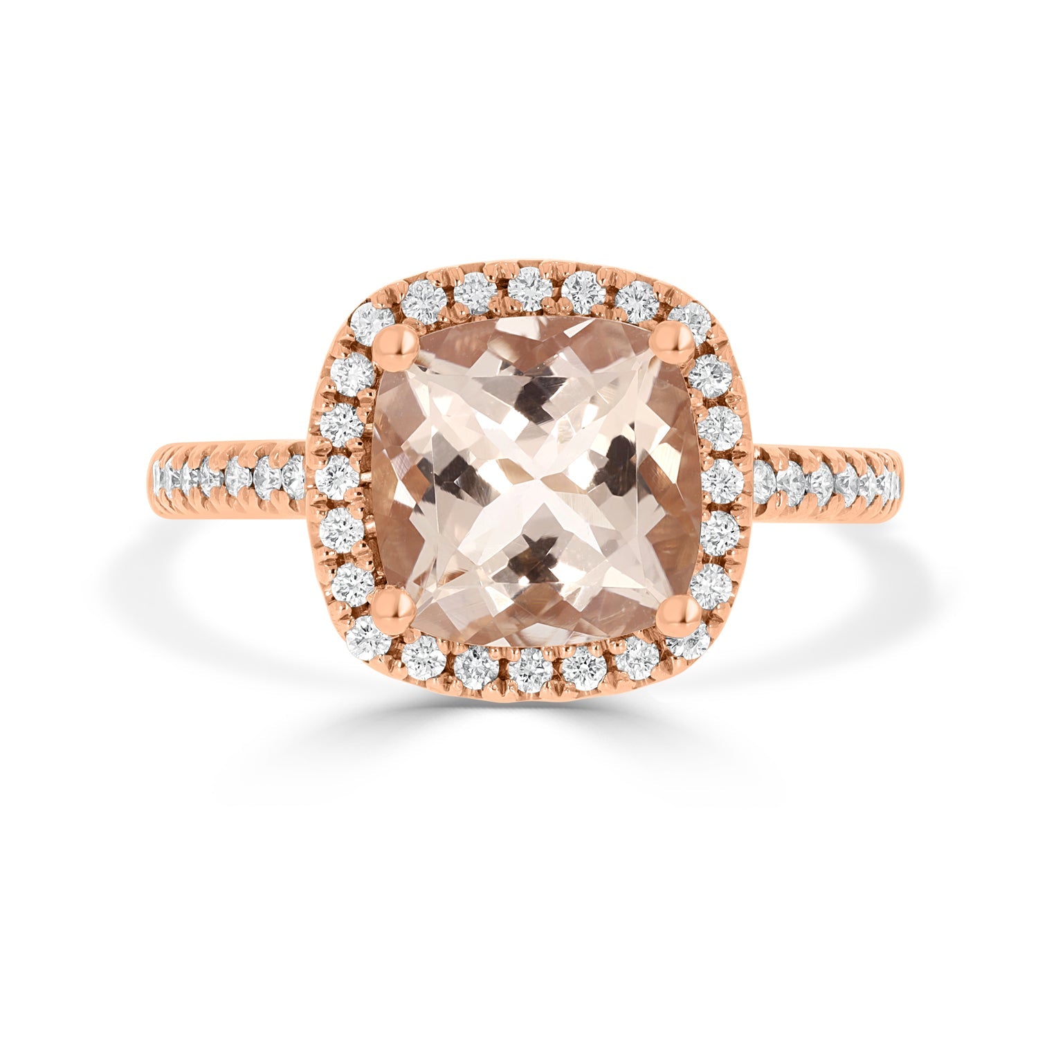 "Designed with 14K rose gold and set with cushion-cut Morganite, this adorable ring is boasts a round Diamond that sparkles."