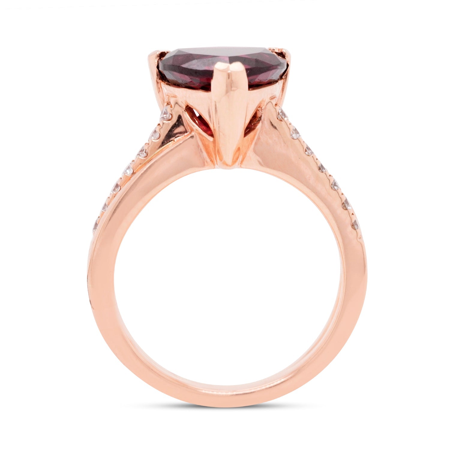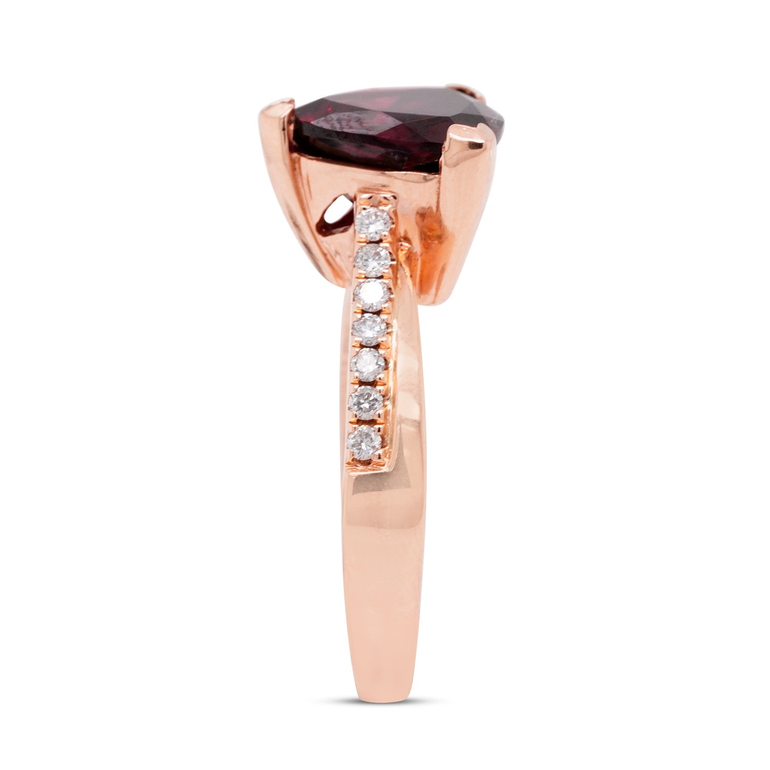 Artistically designed with sparkling trillion Rhodolite Garnet as the primary gemstone and diamonds to add luxury, this 14k rose gold ring is a special piece that attracts women who love to adorn in ultra-modern style.