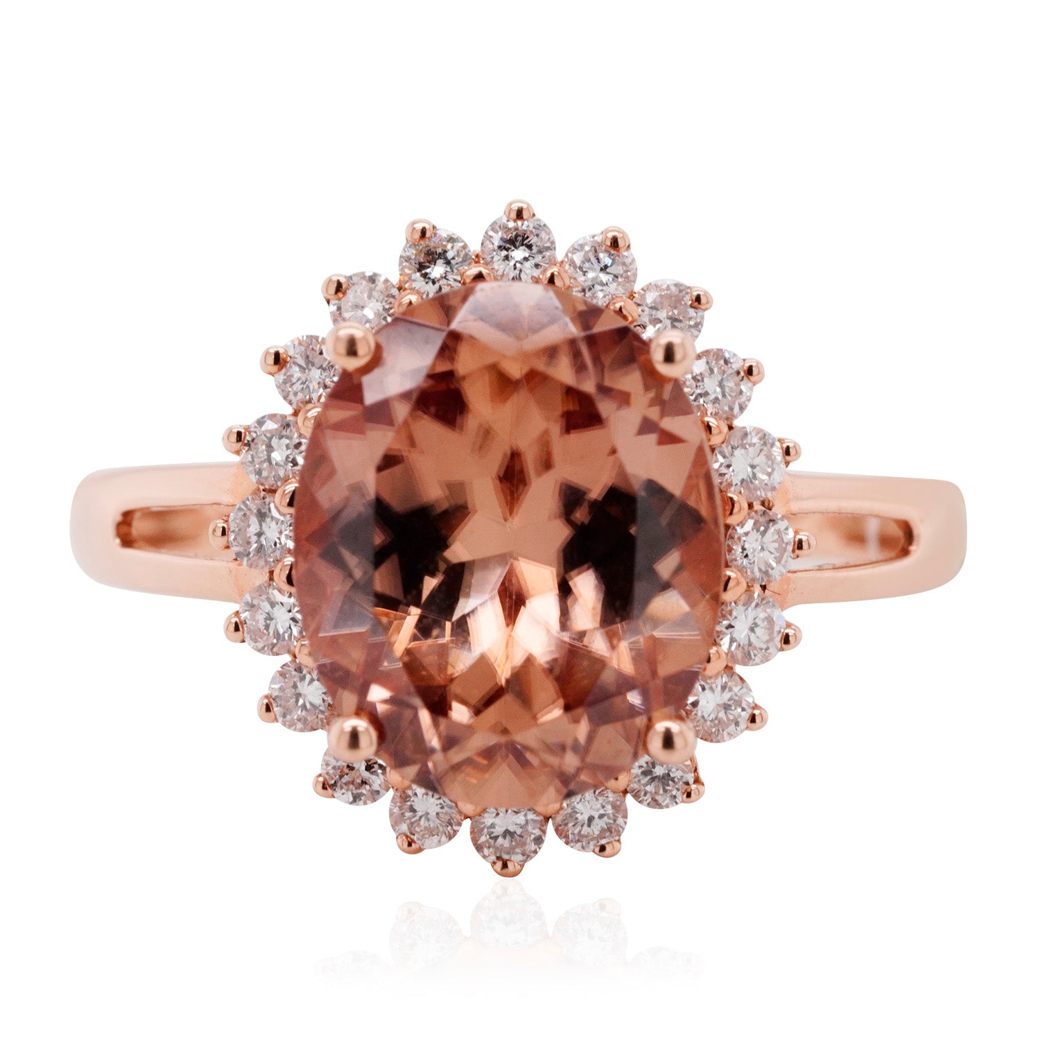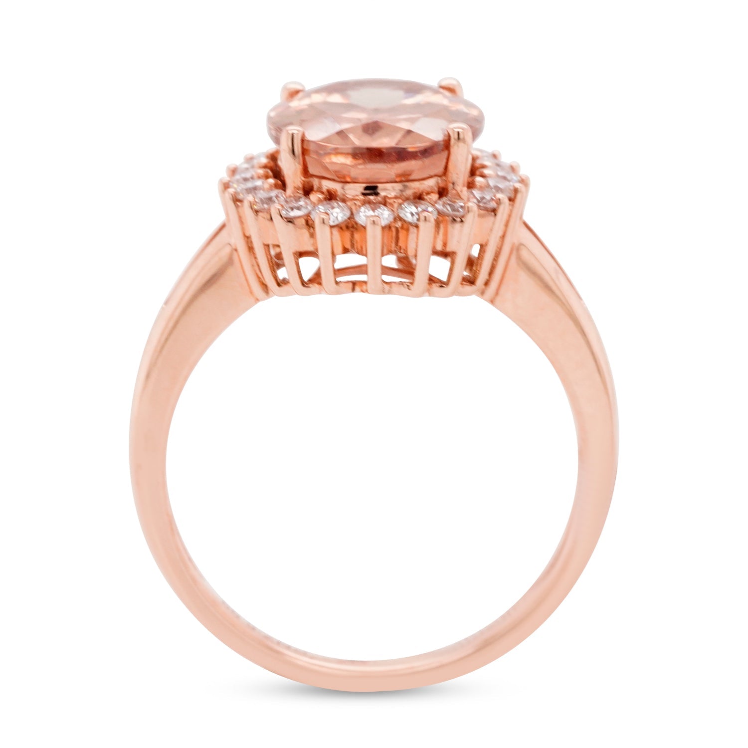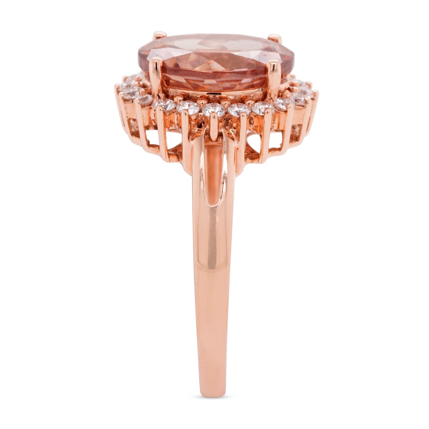 Flaunting a bright glow, the exceptional design of this striking ring gives your ensemble a glamorous look. Crafted in 14K rose gold, it is embellished with a oval cut Pink Zircon for added shimmer. Accentuated by the sparkle of the round cut Diamonds, wear this dazzling ring with confidence to any occasion and revel in the attention you get. Allure and style, this fascinating ring has it all!