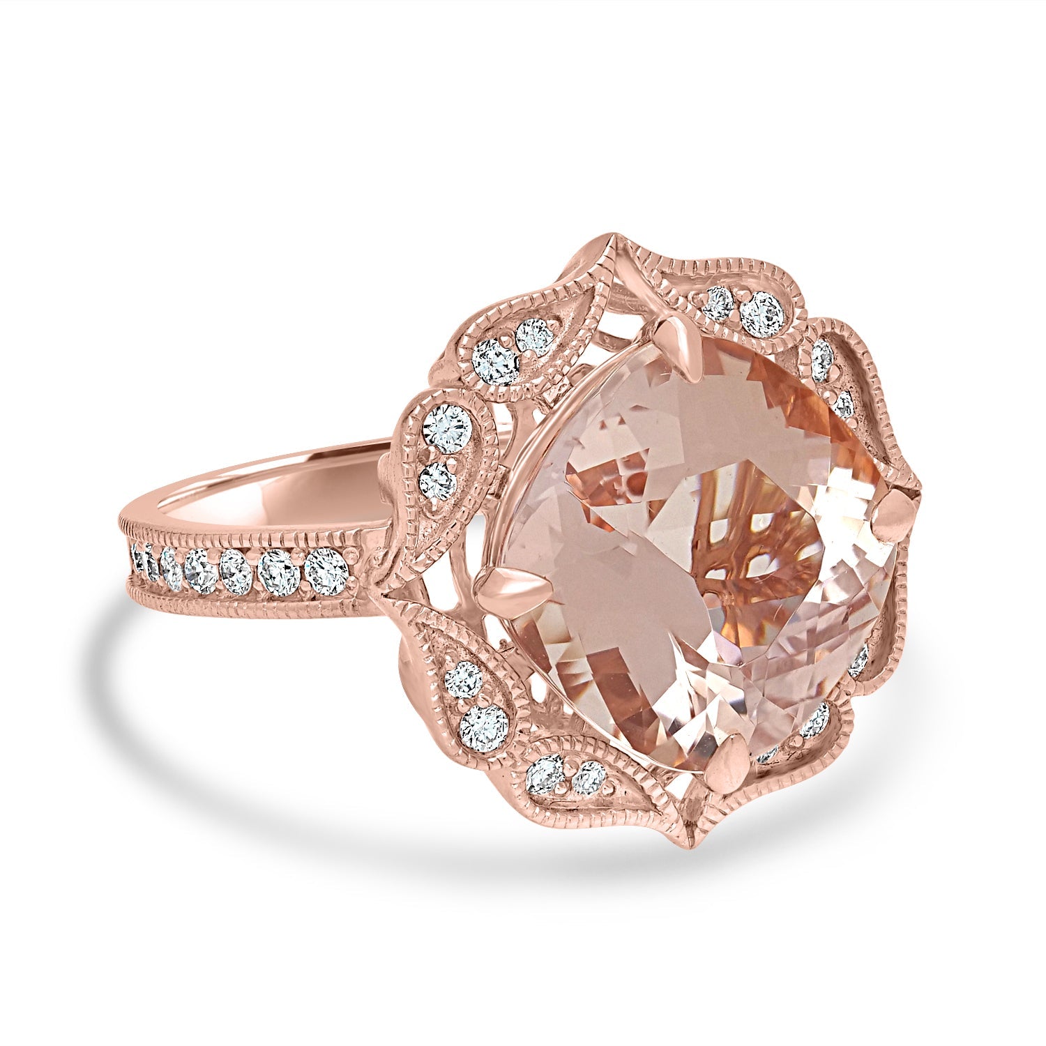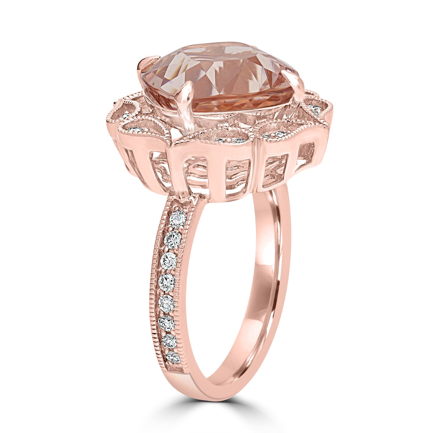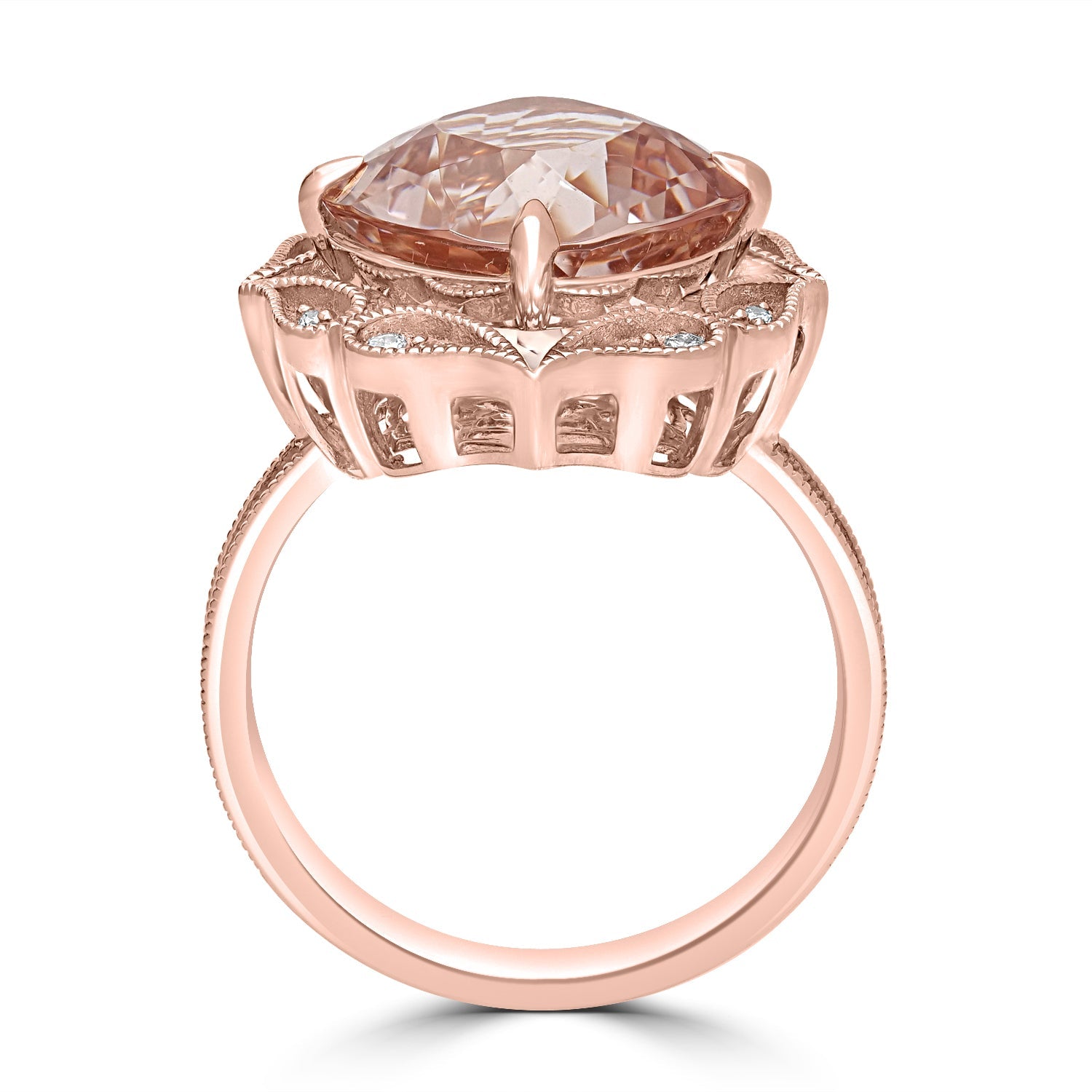 This adorable ring is crafted with 14K rose gold and set with cushion-cut Morganite and round Diamonds in a high-class design for versatile styling.