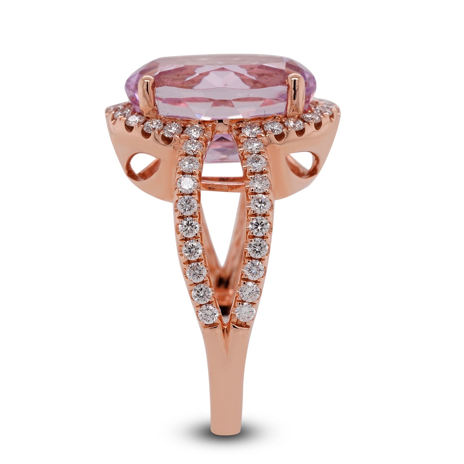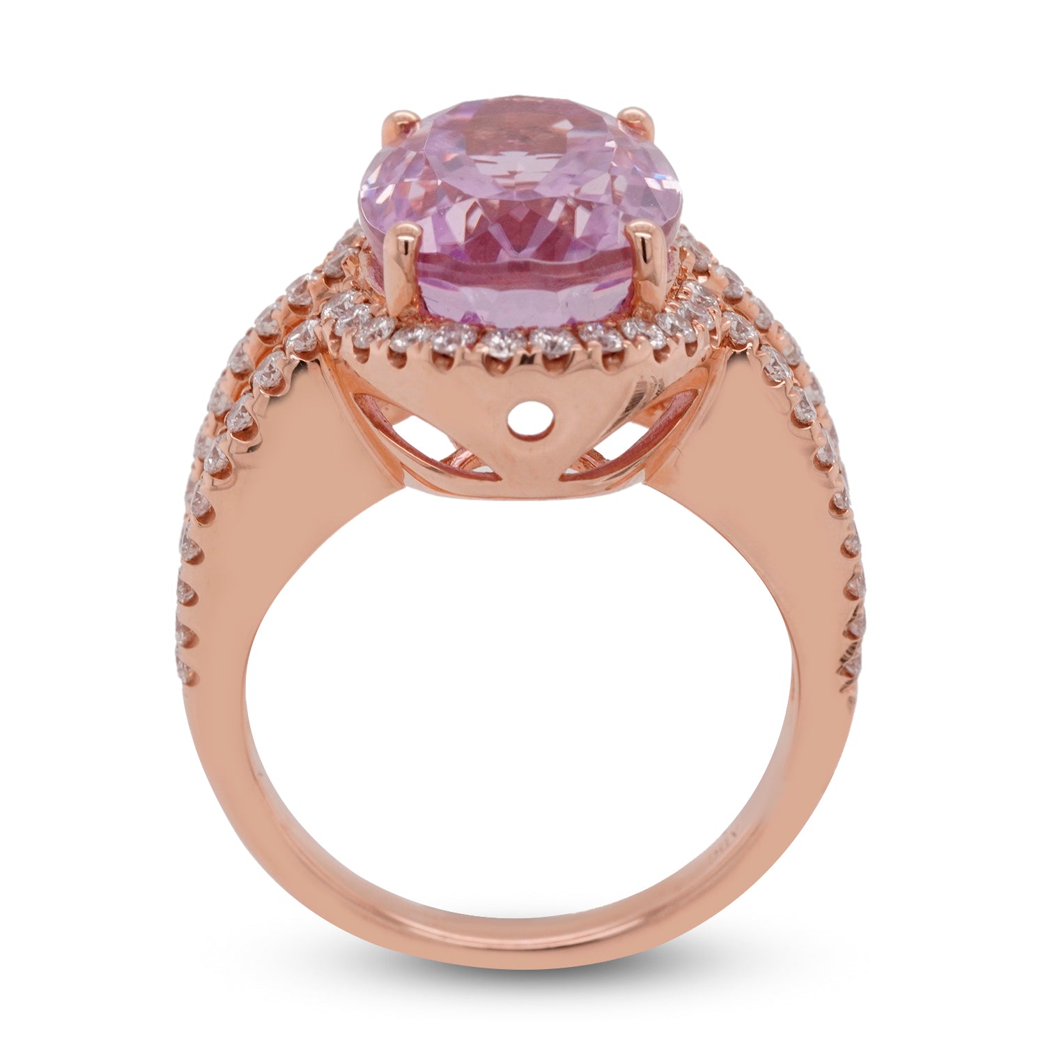 This enchanting ring that is crafted with excellent fashion sense and intricate detailing in 14k rose gold lets you feel confident and adds a style to your look. This ultra-luxury ring is unique with carefully selected oval cut Kunzite and round diamonds that lend a sparkling look to your attire.