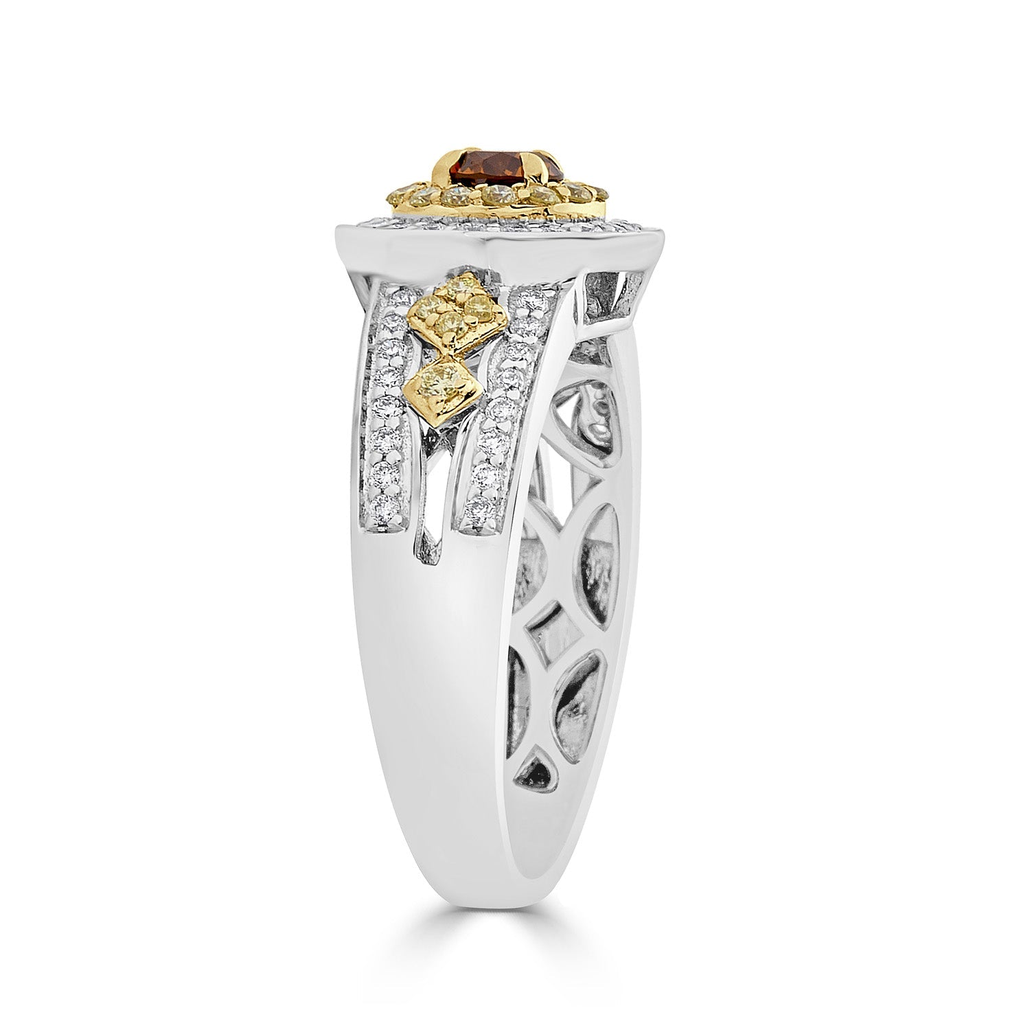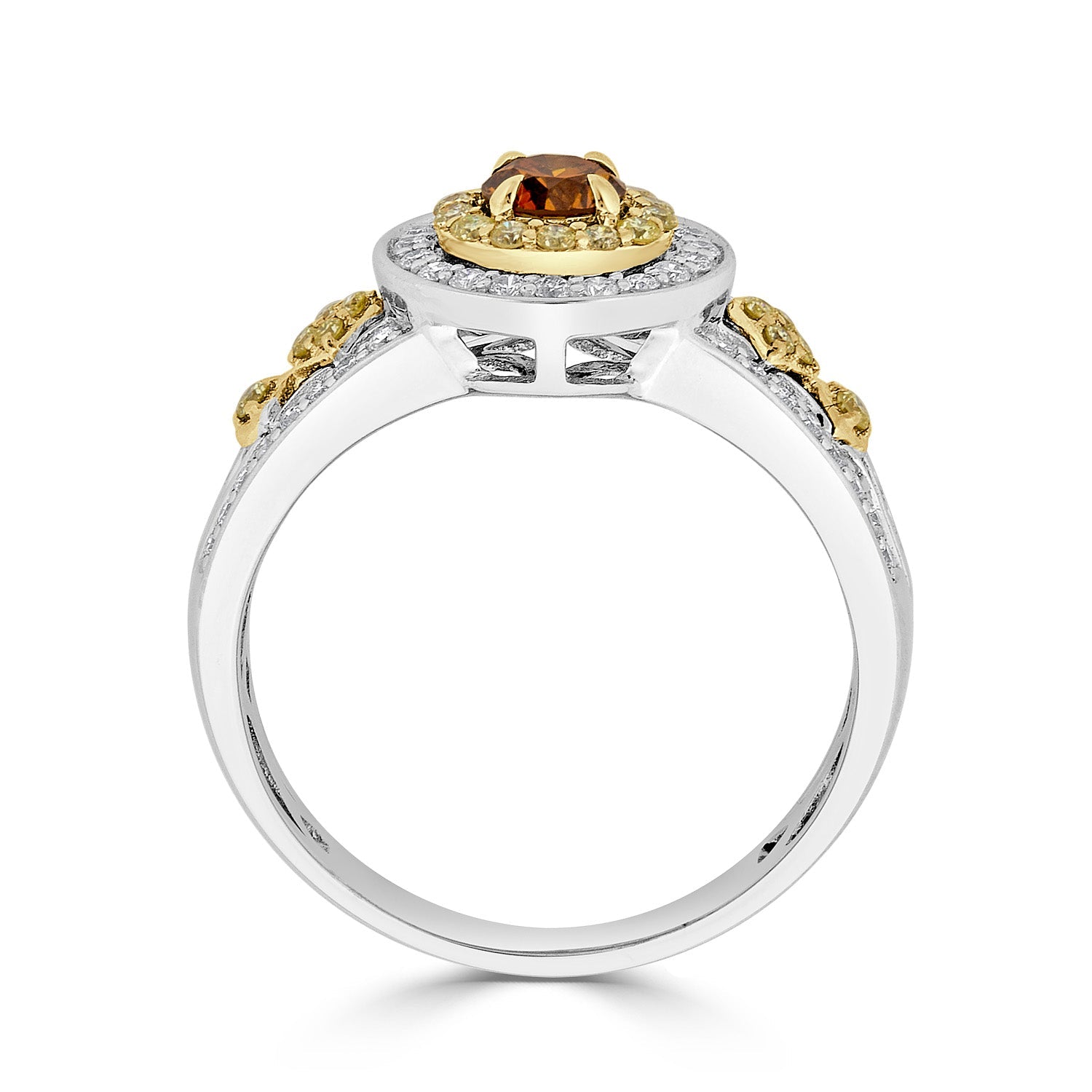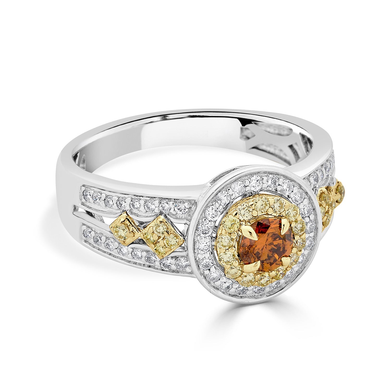 This ring is exciting with the 14k two-tone gold and gives a truly special finish to your look. Designers have set the ring with orange Diamond and round Diamonds.