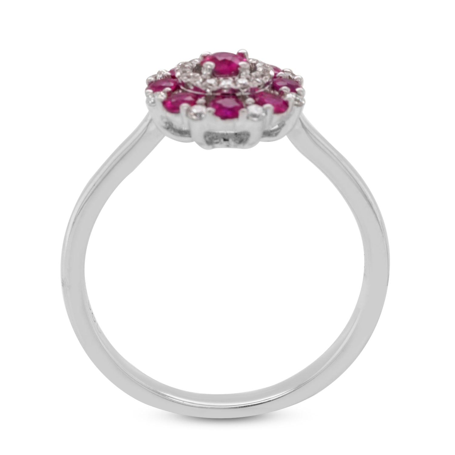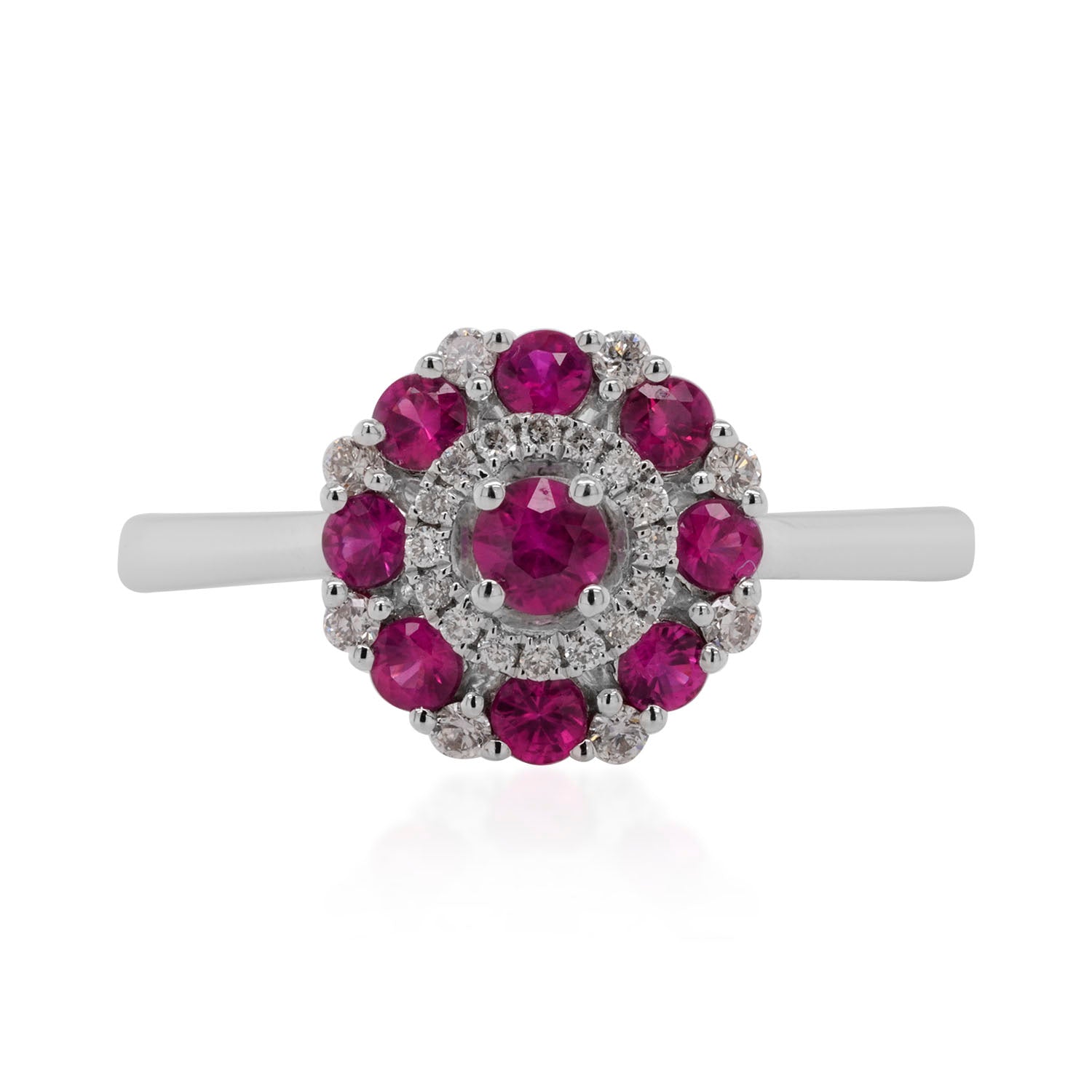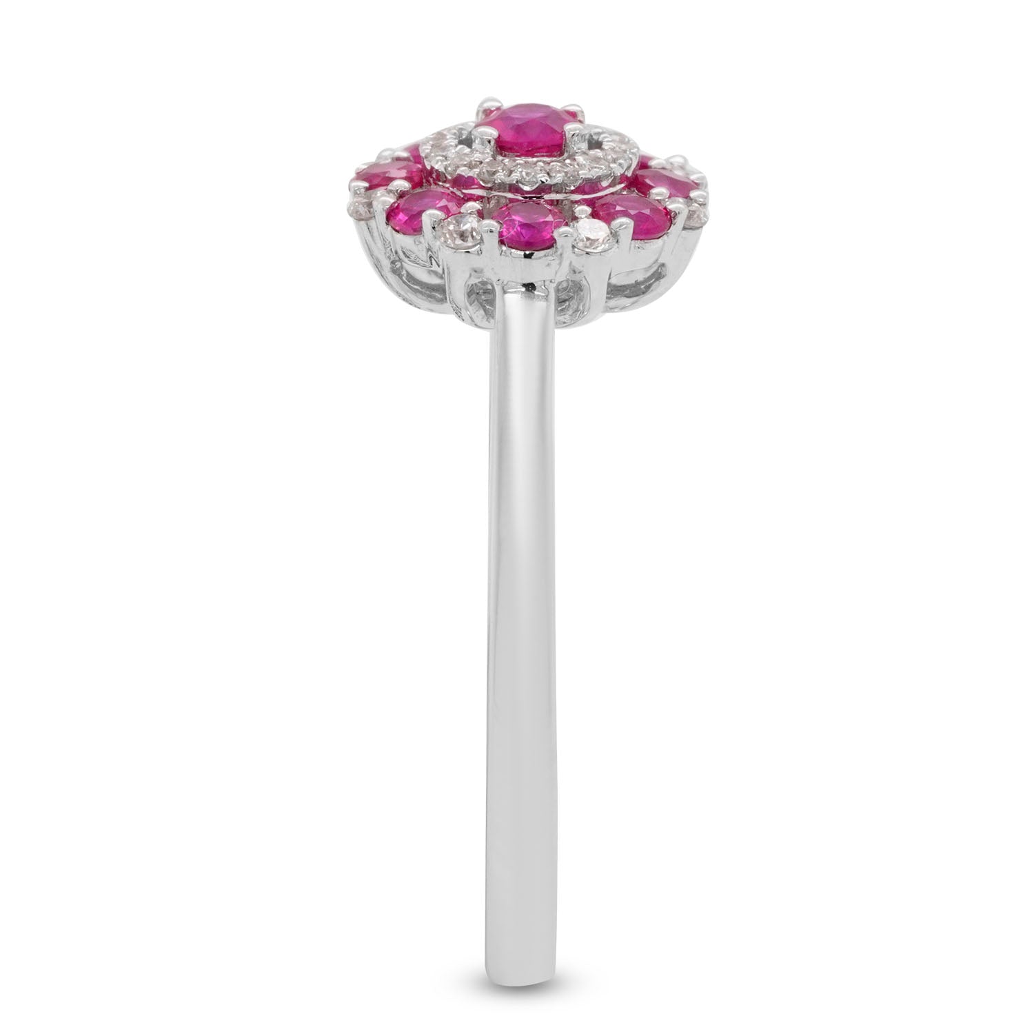 The clever design of this arresting ring highlights the fiery red of the round cut Ruby. Flanked by sparkling round cut Diamonds which add a generous dose of shimmer and shine, this stunning ring is all the jewelry you will need to leave an unforgettable impression. Crafted in 14K two tone gold for an impeccable finish, opt for this appealing ring now!