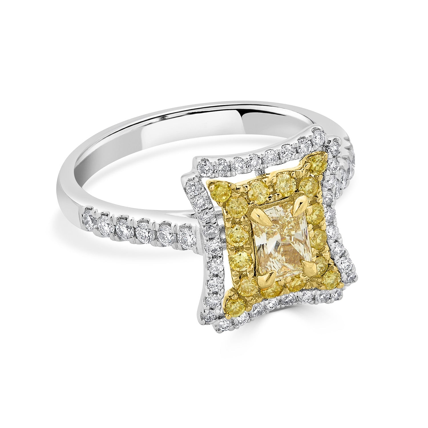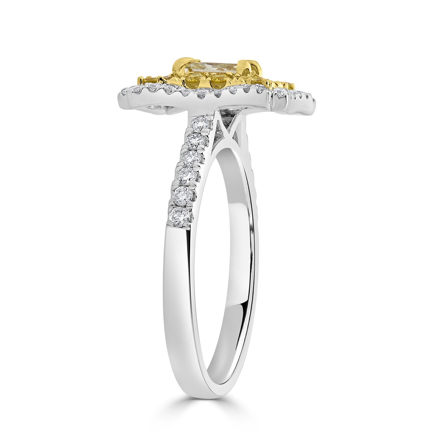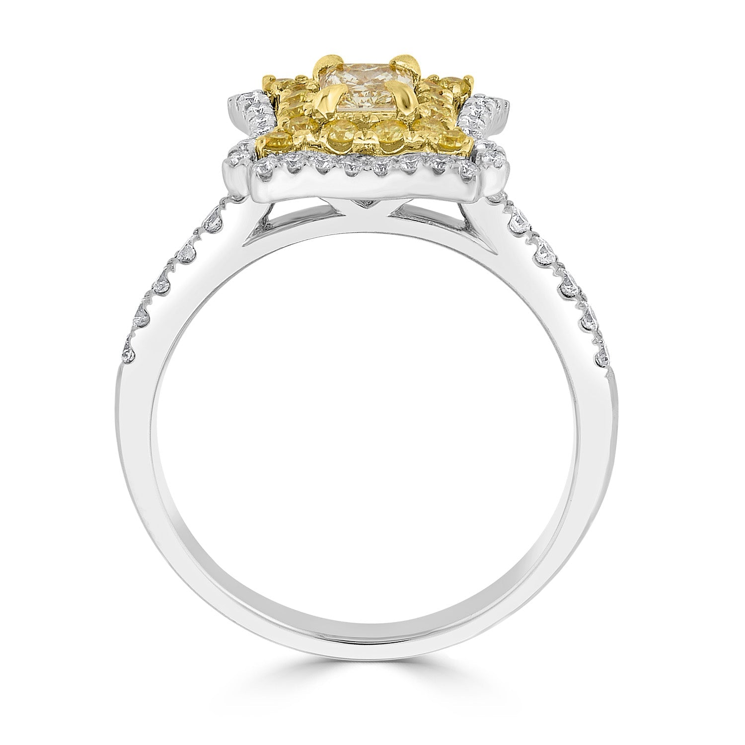 Set With An Exquisite Princess Cut Diamond, This Stunning Ring Proffers An Unmatched Sparkle. Crafted Of Shiny 14k Two-tone Gold, The Dazzling Round Cut Diamonds Around It Are Truly Captivating.