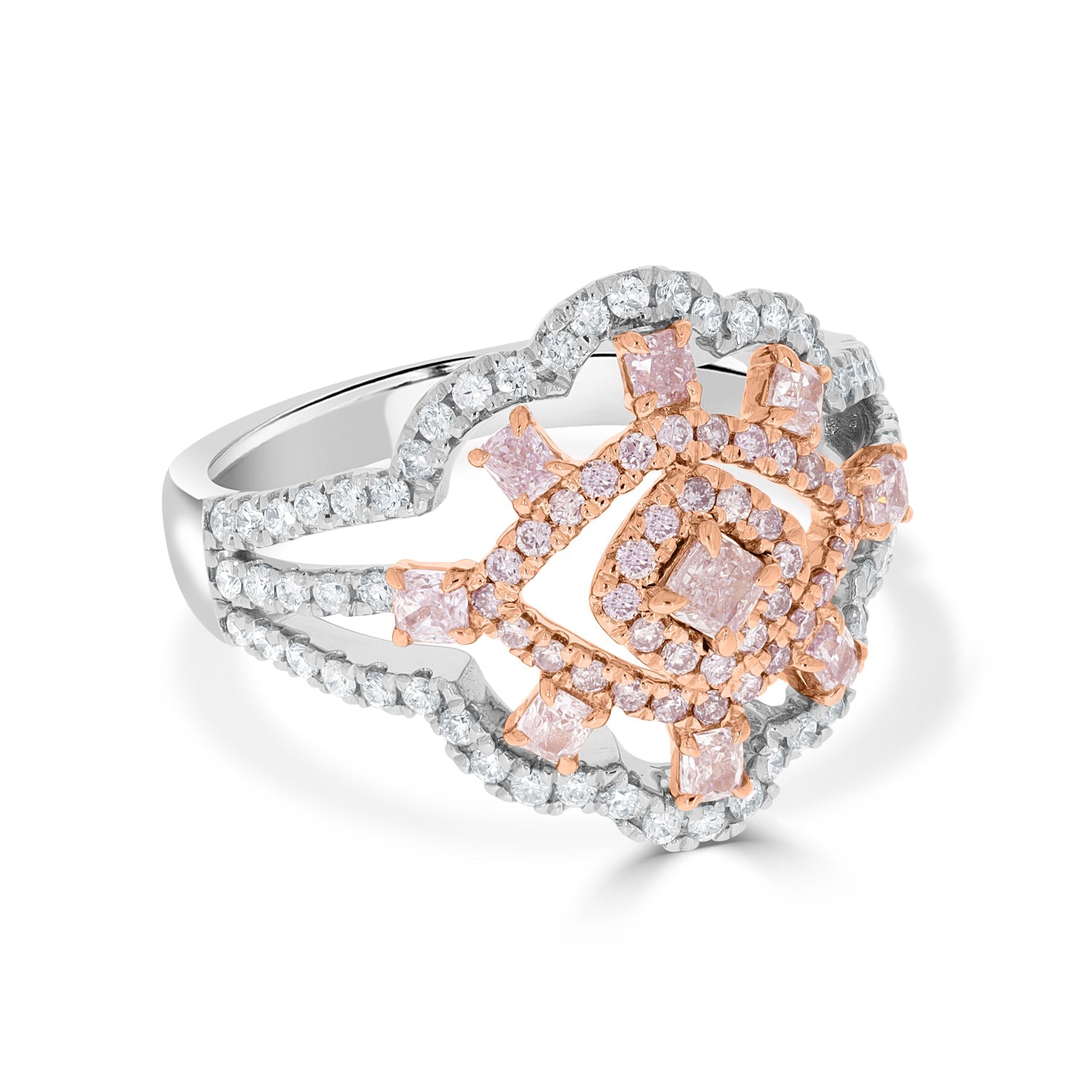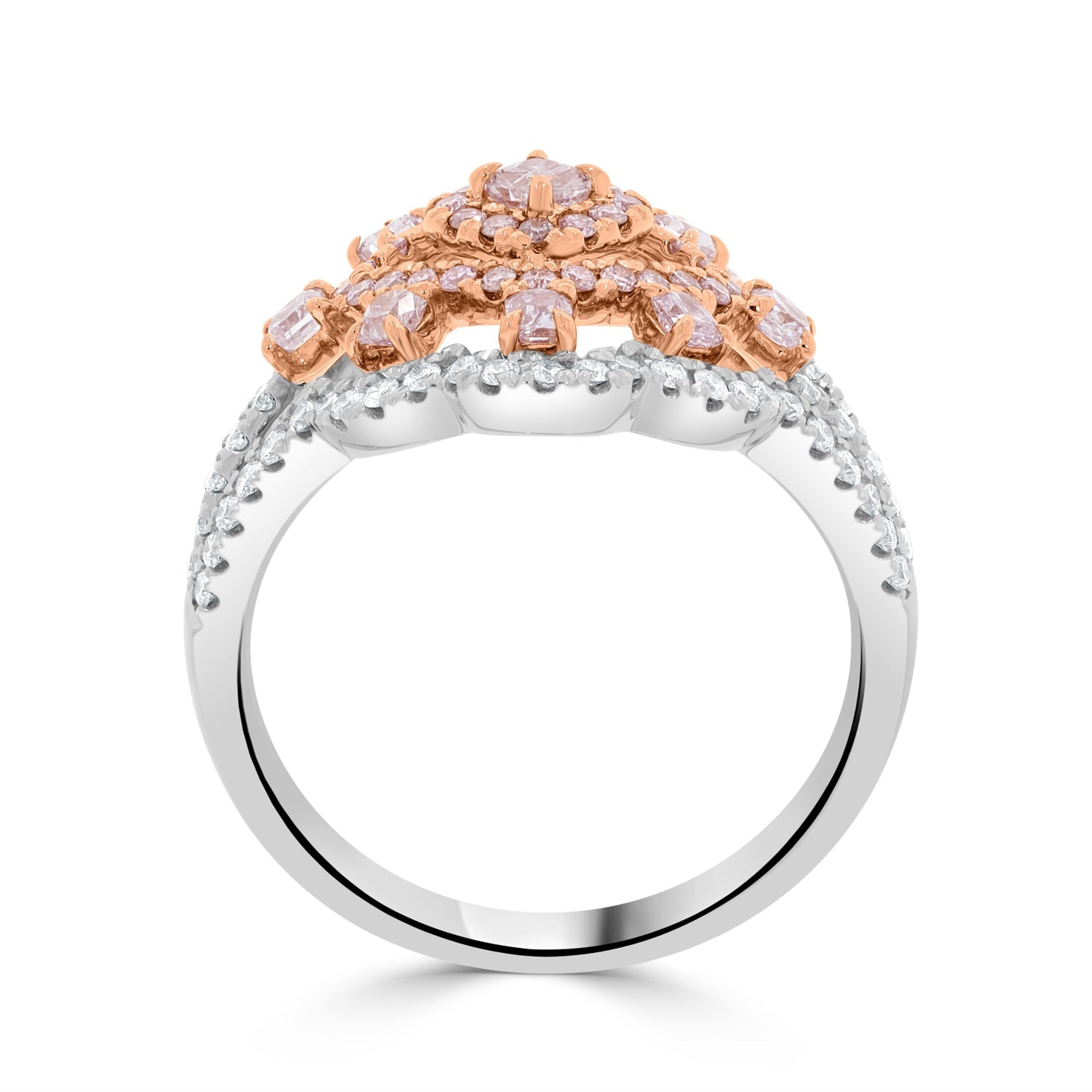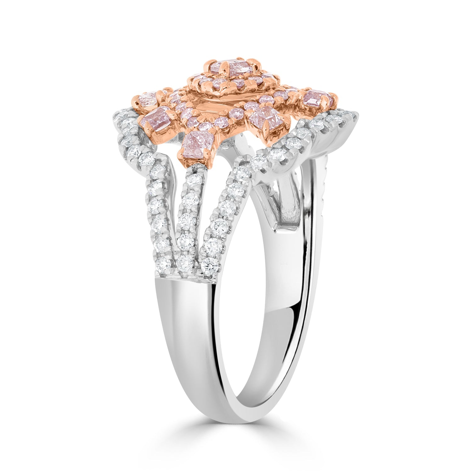 Specially fashioned for a luxury look, this 14k two-tone ring is a luxurious piece to cherish. Featuring pink Diamonds amidst sparkling white Diamond accents in a world-class setting, this ring can go from dressy to casual.