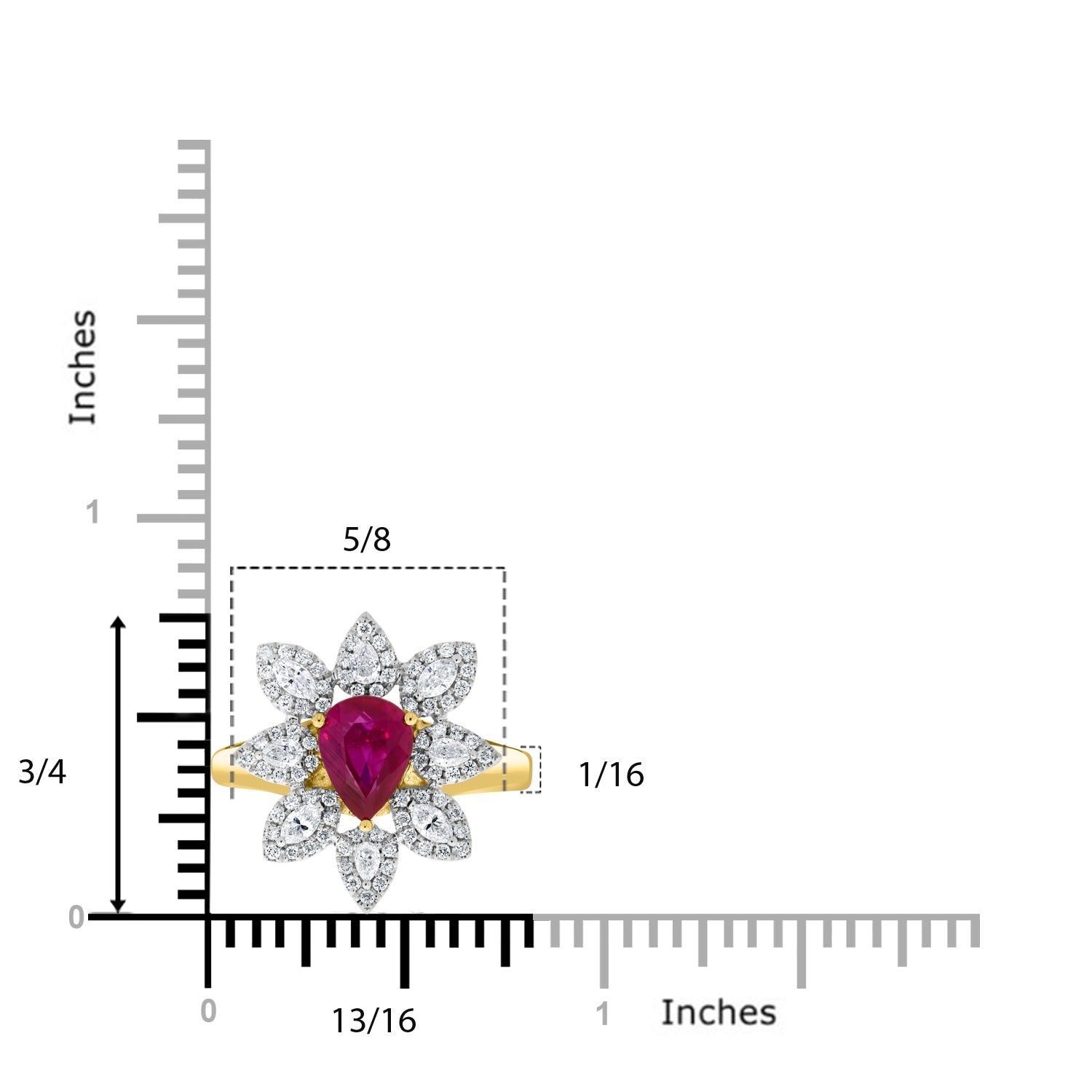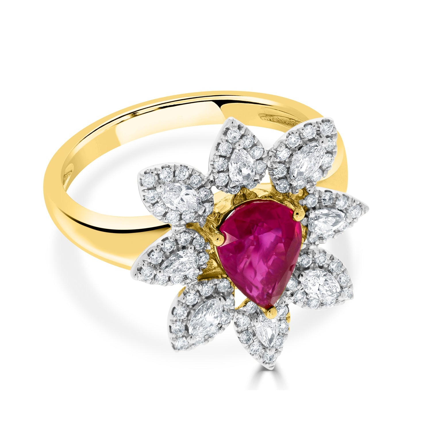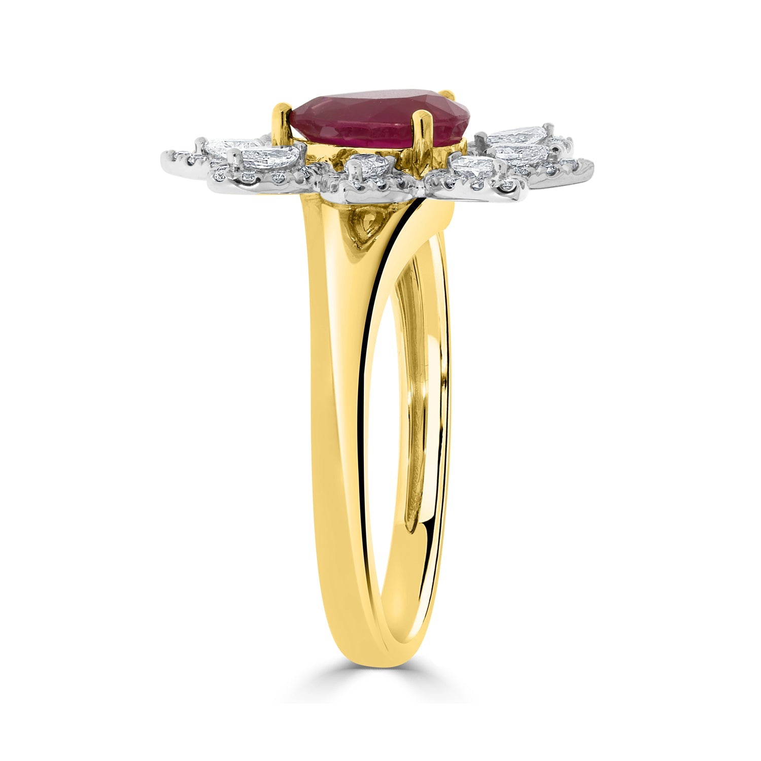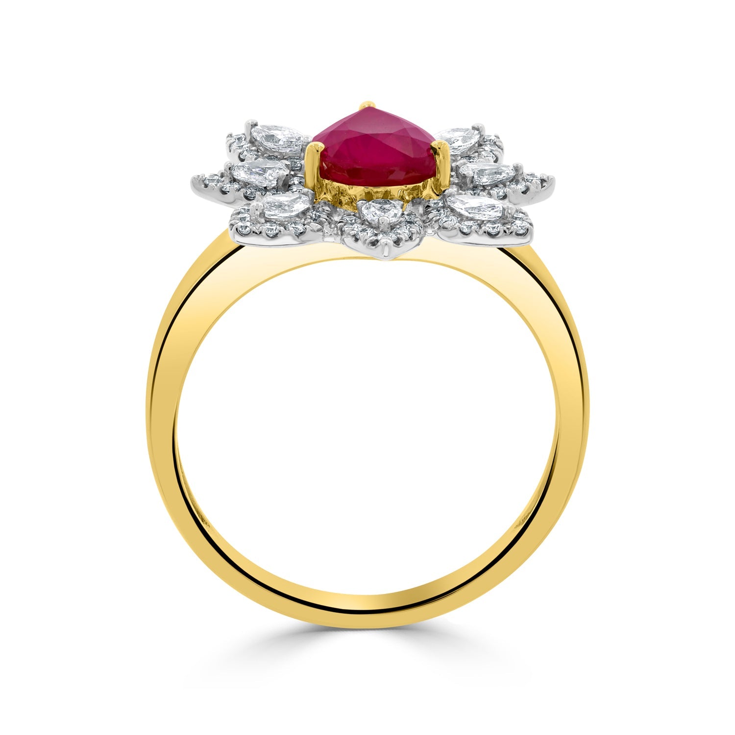 With the charm of Ruby and the shine of round Diamonds, this ring will complement all your ensembles effortlessly. Fashioned in an extreme design, this alluring 14kt two-tone gold ring will add sparkle and luxury to your look.