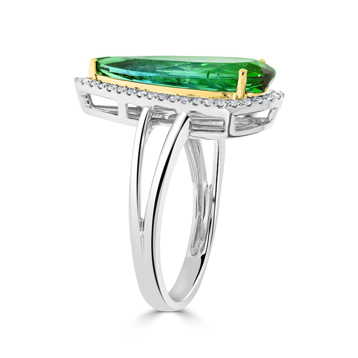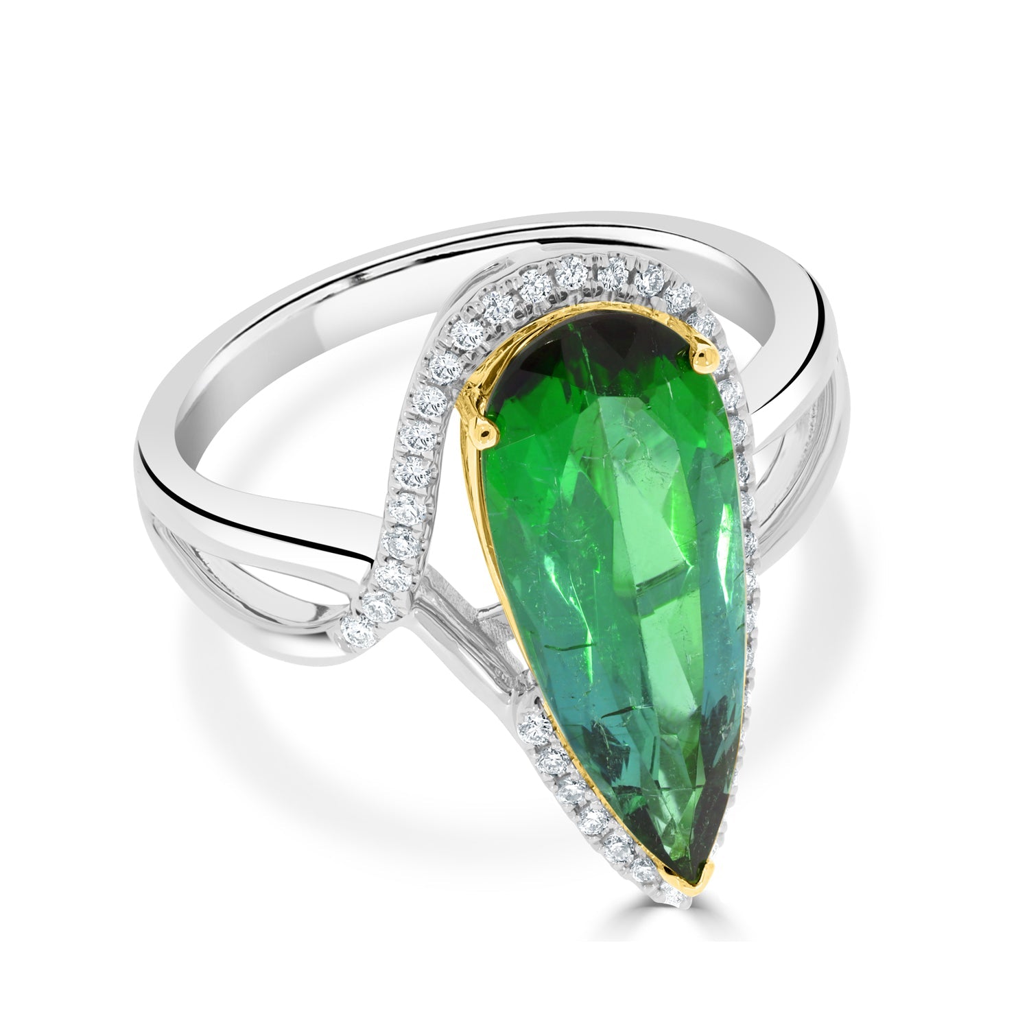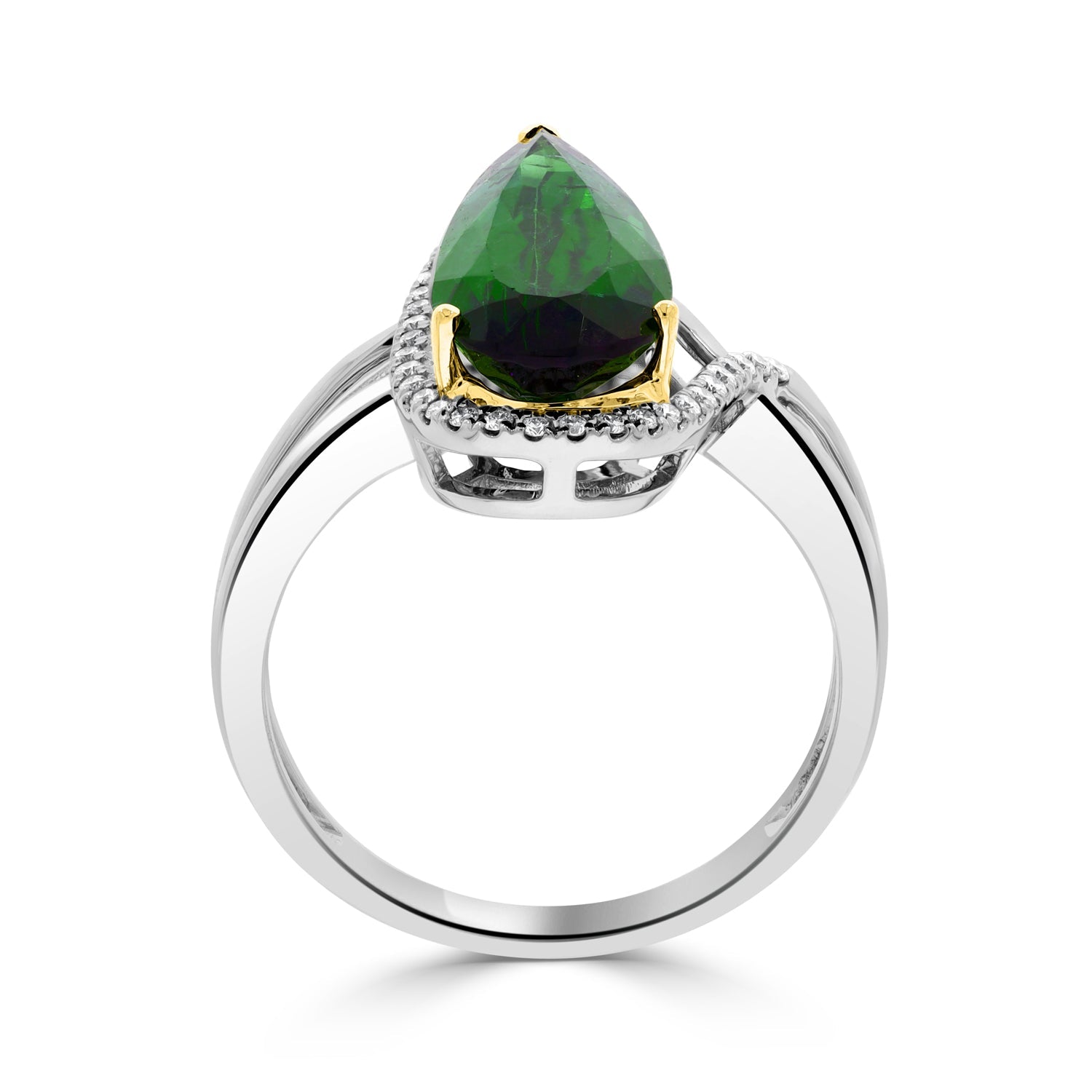 This marvelous ring that is designed of 14kt two-tone gold is embellished with pear-cut Tourmaline and round Diamonds to make your look stunning.