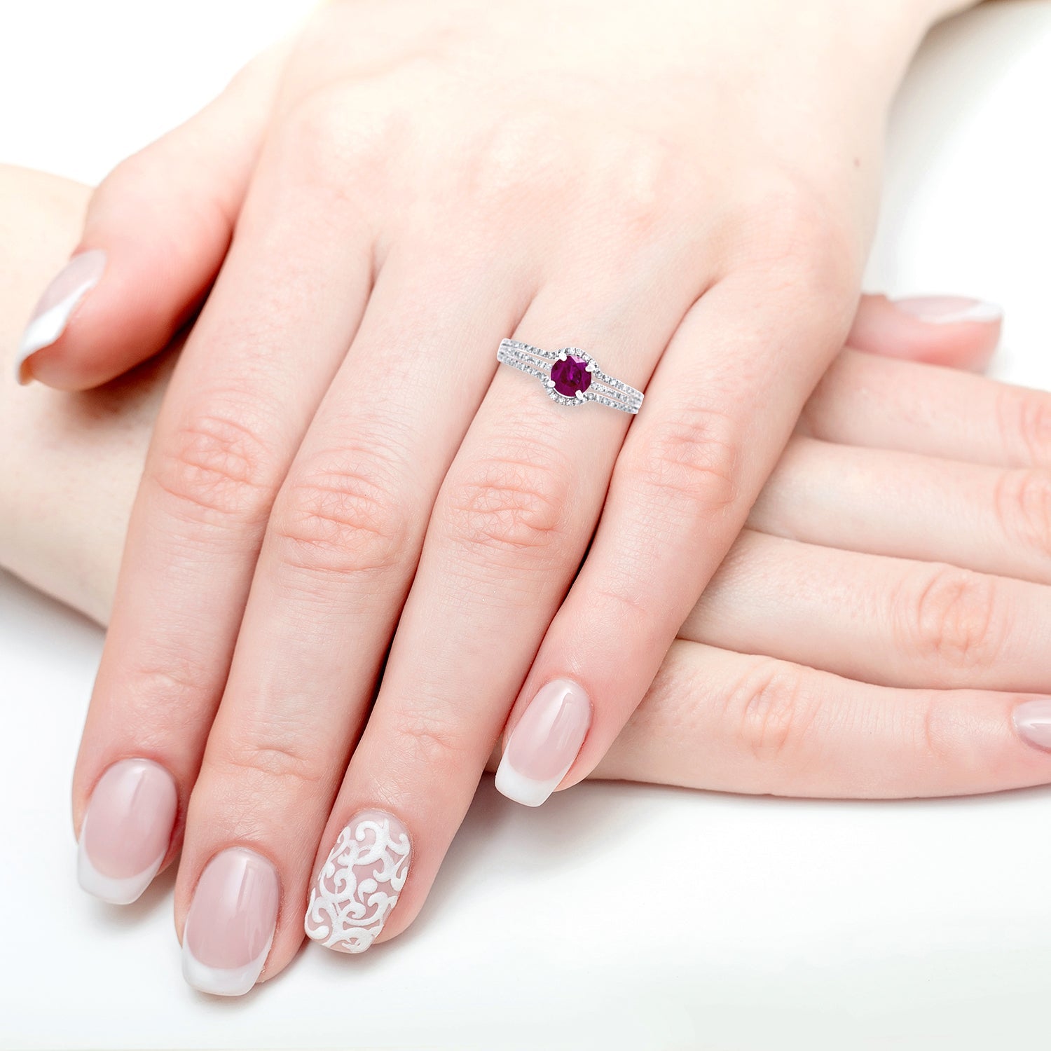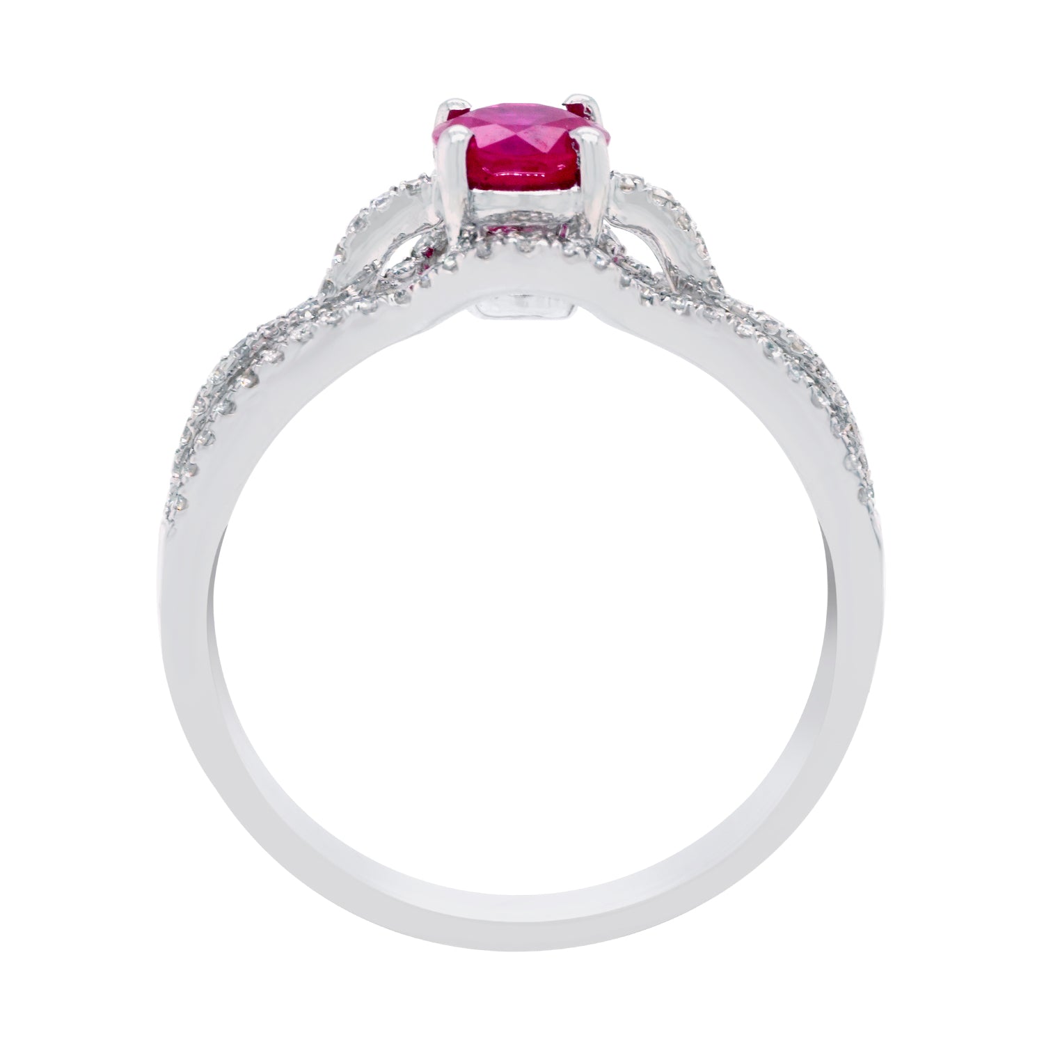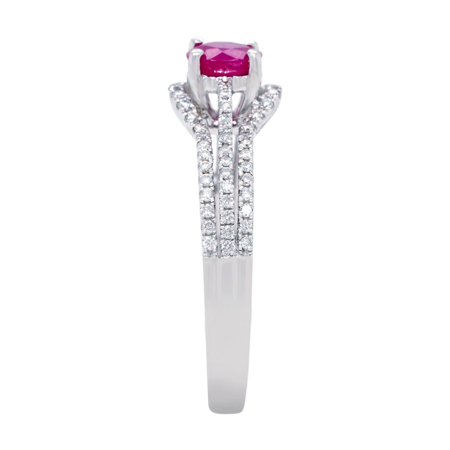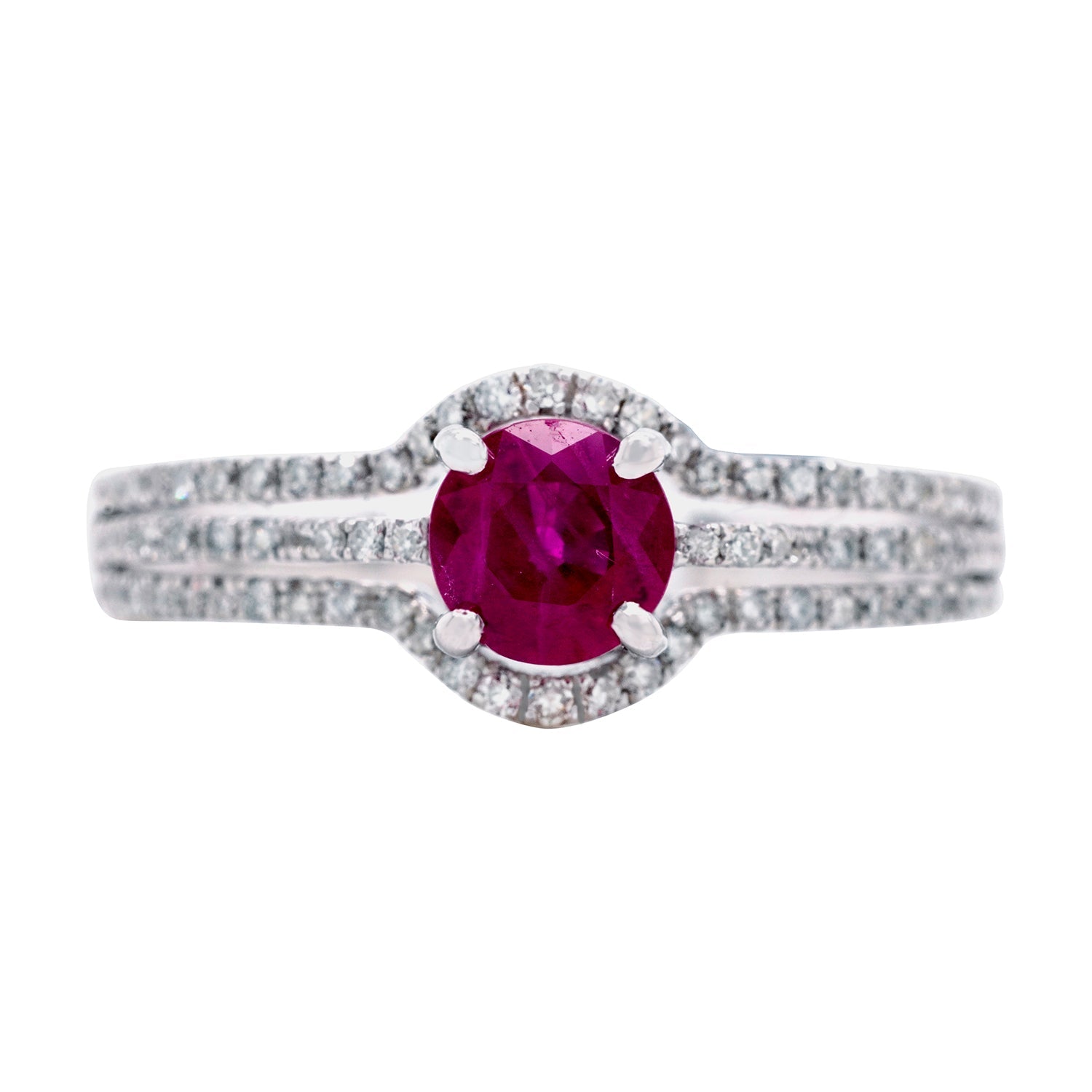 The 14k white gold ring is a luxurious piece of jewelry. The timeless blend of 14k white gold and round cut Ruby creates a sparkling look. The Ruby shines amidst round cut Diamonds for added attraction.