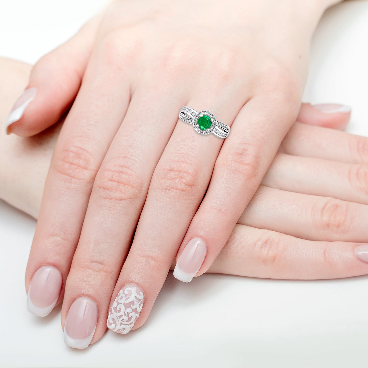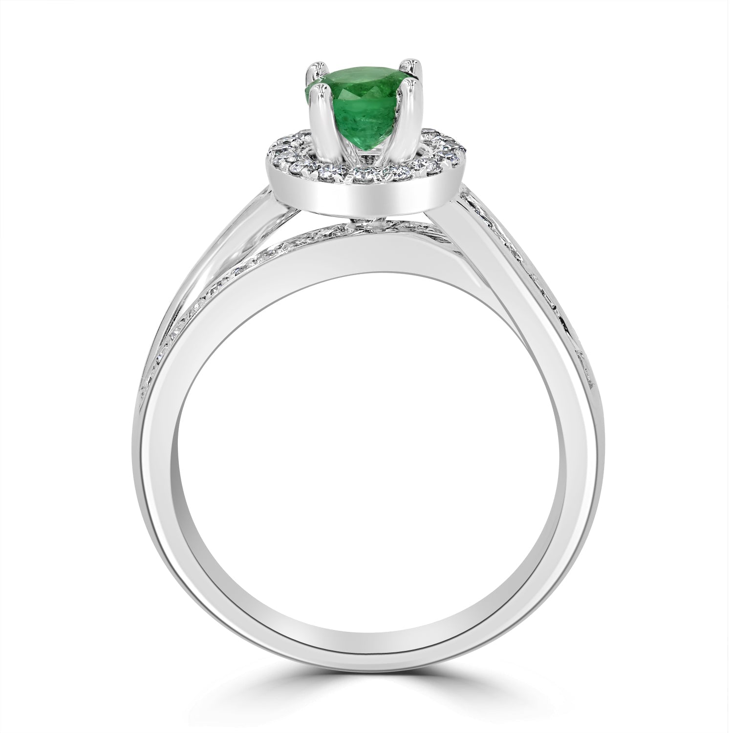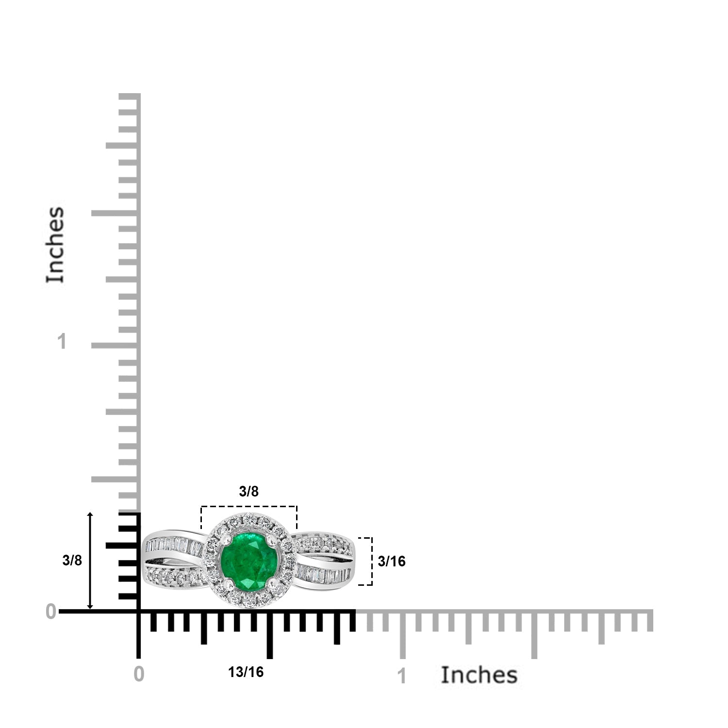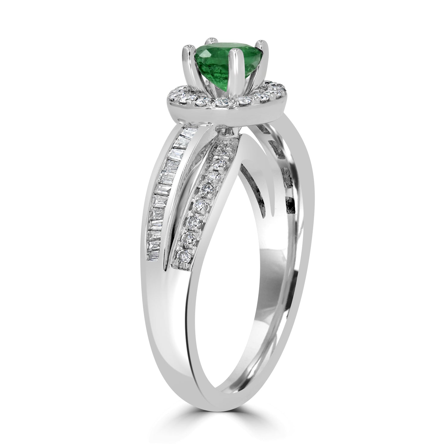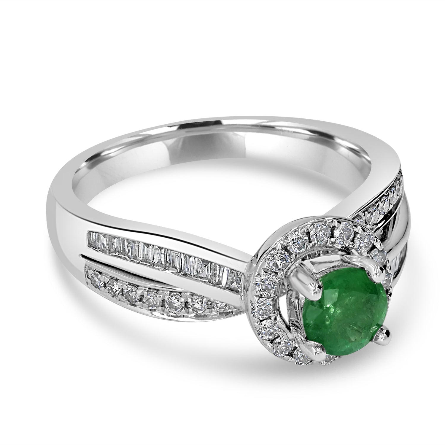 A fine example of luxury, this lovely ring is fashioned from 14K white gold. Set with a round-cut Emerald and round Diamonds, this ring will dazzle everyone.