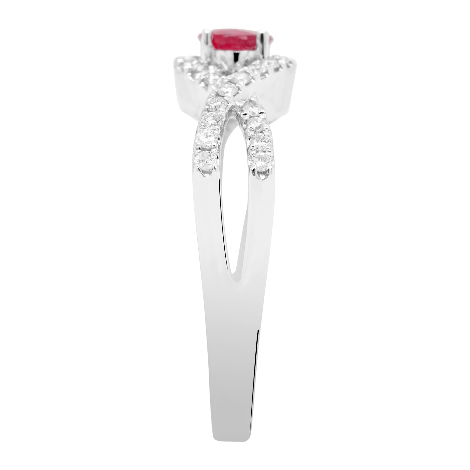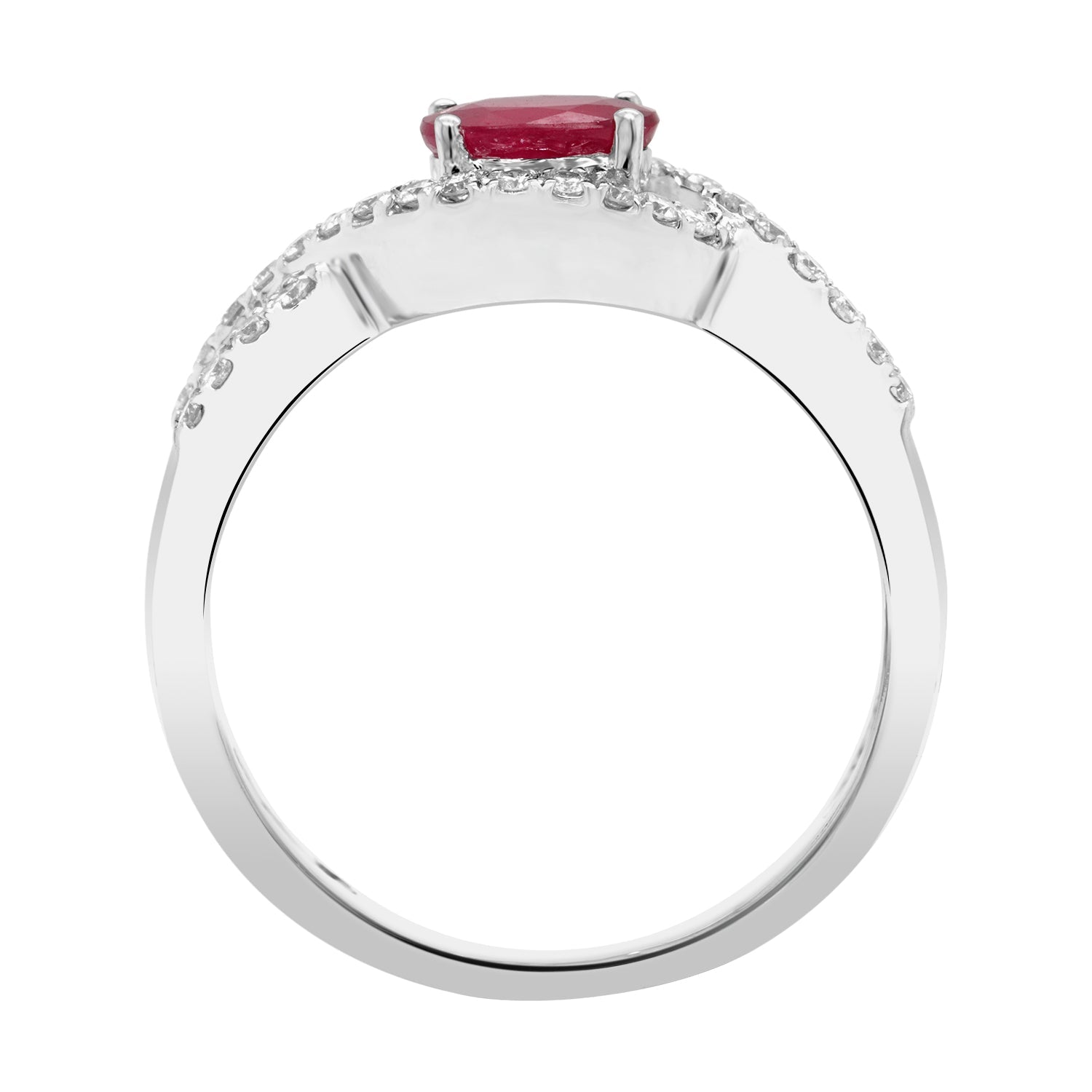 Decorated With A Marvelous Oval Cut Ruby, The Brilliant Design Of This Ring Is Further Enhanced By The Glitter And Shine Of The Round Cut Diamonds That Surround It. Crafted Of 14k White Gold, This Enchanting Ring Will Give Your Ensemble A Striking Hit Of Glamour.
