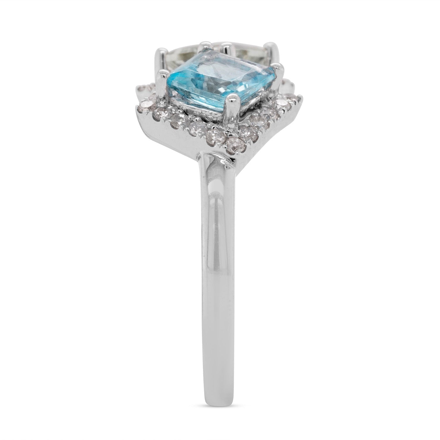 Let the brilliance of the square cut Blue Topaz take over as your flaunt this marvelous ring with confidence. This exciting gemstone is highlighted by the shimmer of the round cut Diamonds that create a glorious halo around it. Crafted in 14K white gold, the glitter of this dazzling jewelry gives you an impeccable style!
