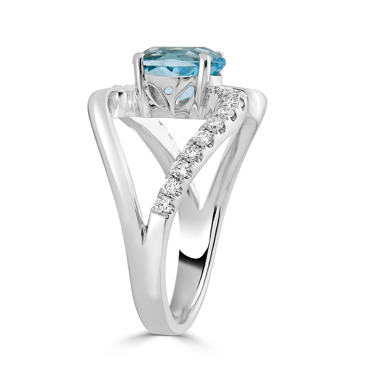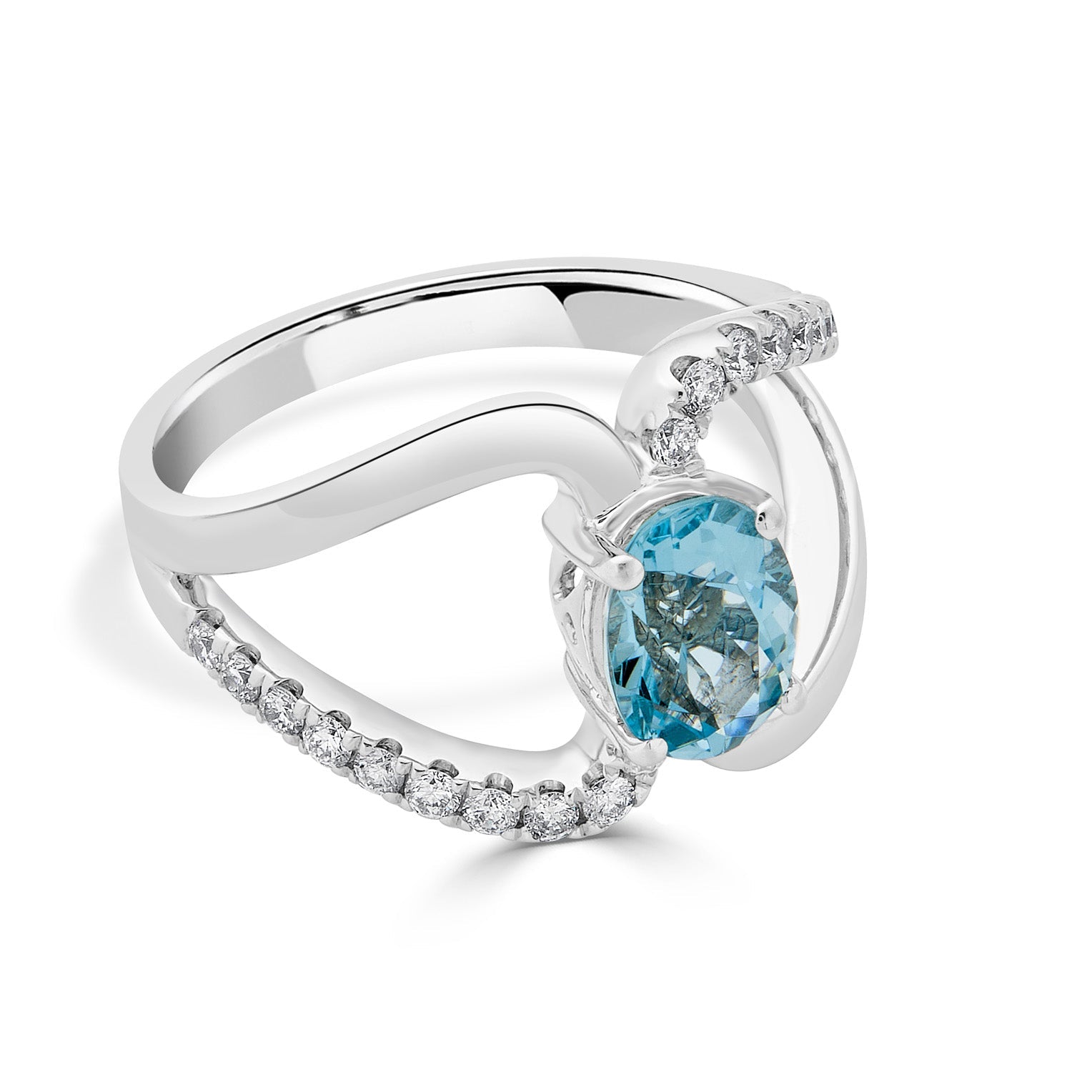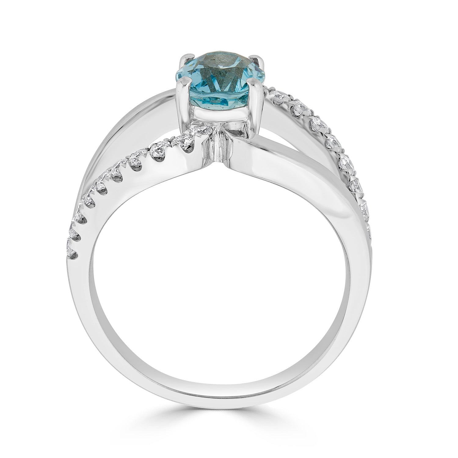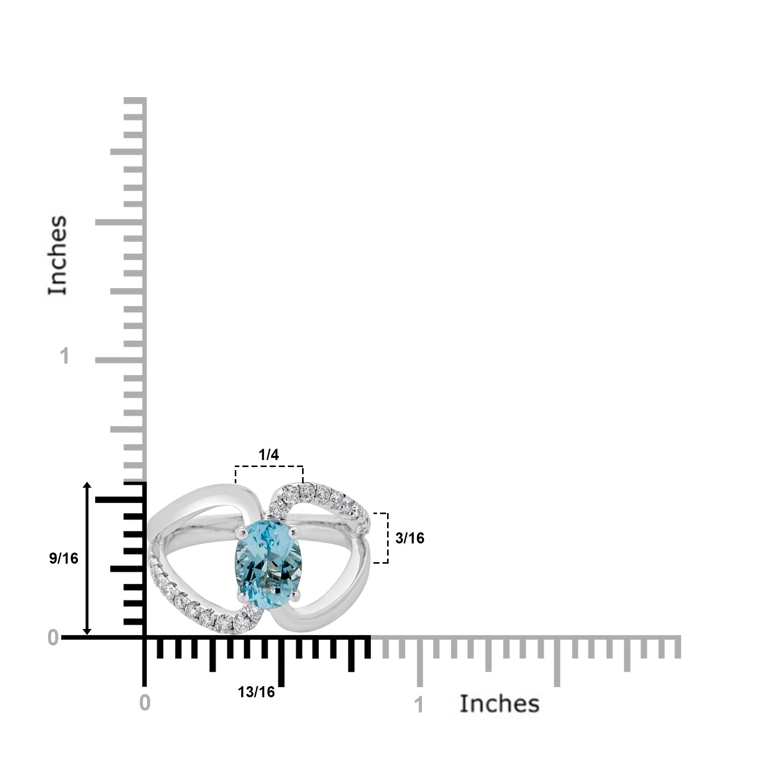 This prestigious ring displays a 14k white gold accentuated with noteworthy design and refined finish to make you stand out in the crowd. Styled to perfection, the oval cut aquamarine and round diamonds will add radiance to your natural beauty and worth adding to your wardrobe.