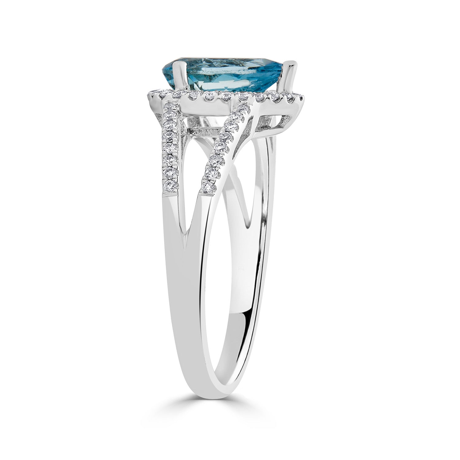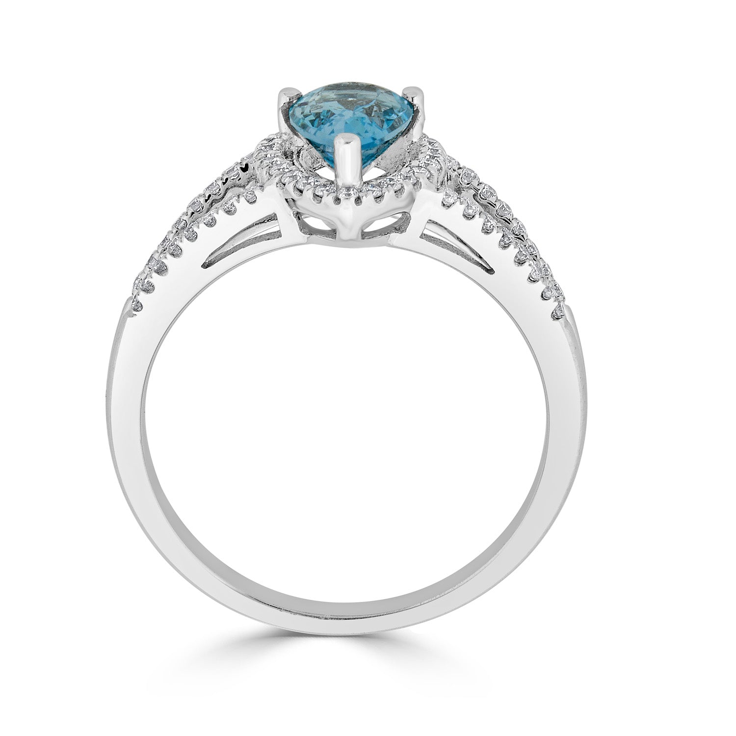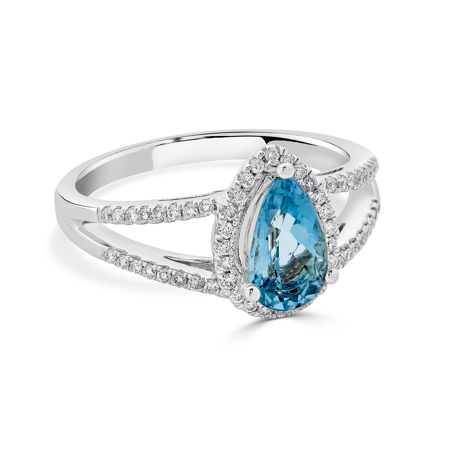 Crafted of 14K white gold, the luxurious finish of this ring dresses you up for any occasion with elegance. Designed with a magnificent pear cut Aquamarine, it is bordered by the glitter and shimmer of round cut Diamonds.