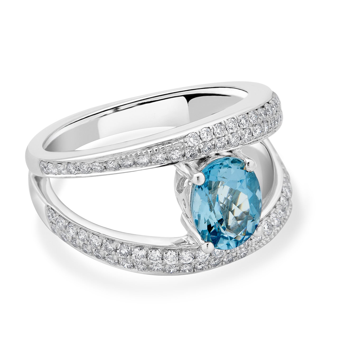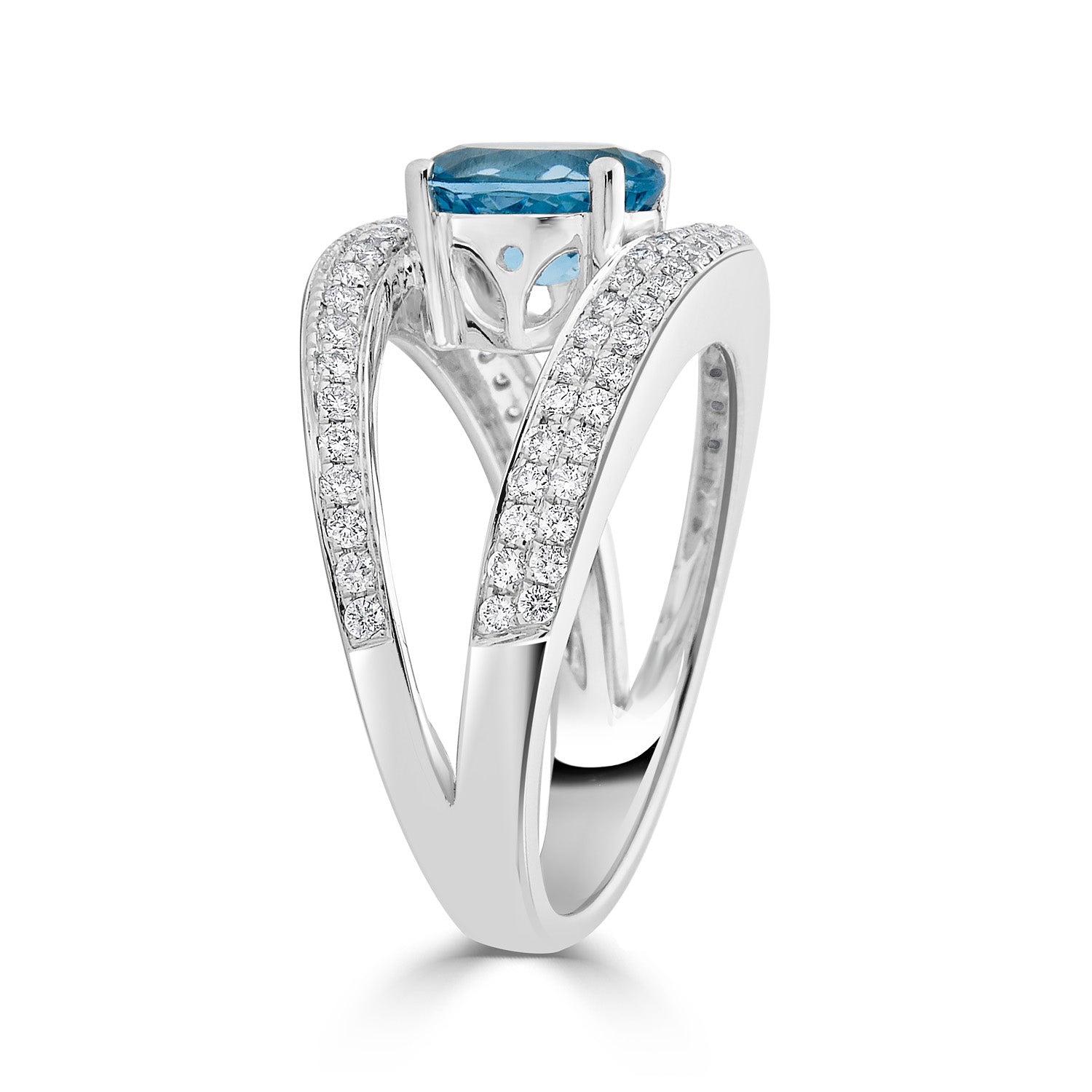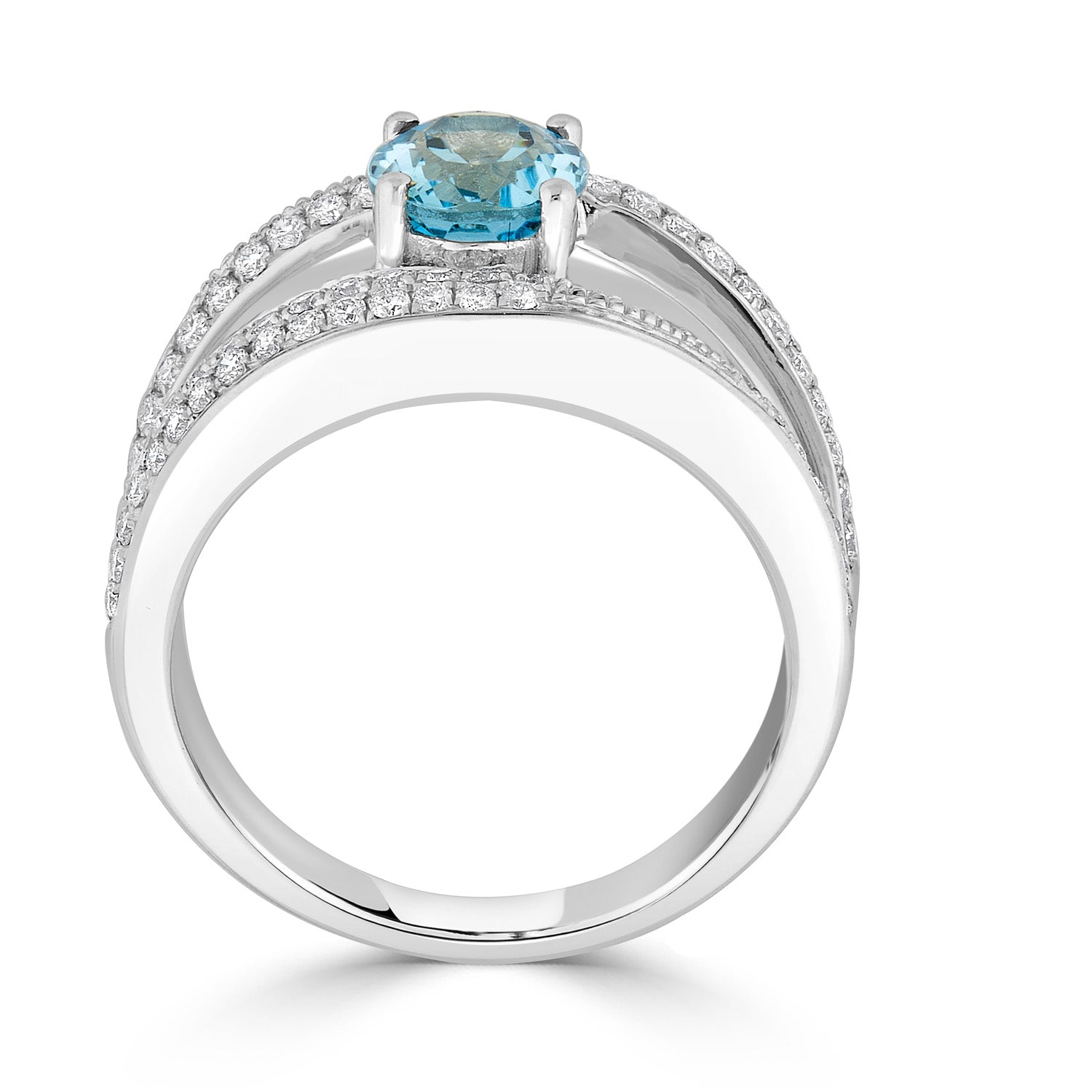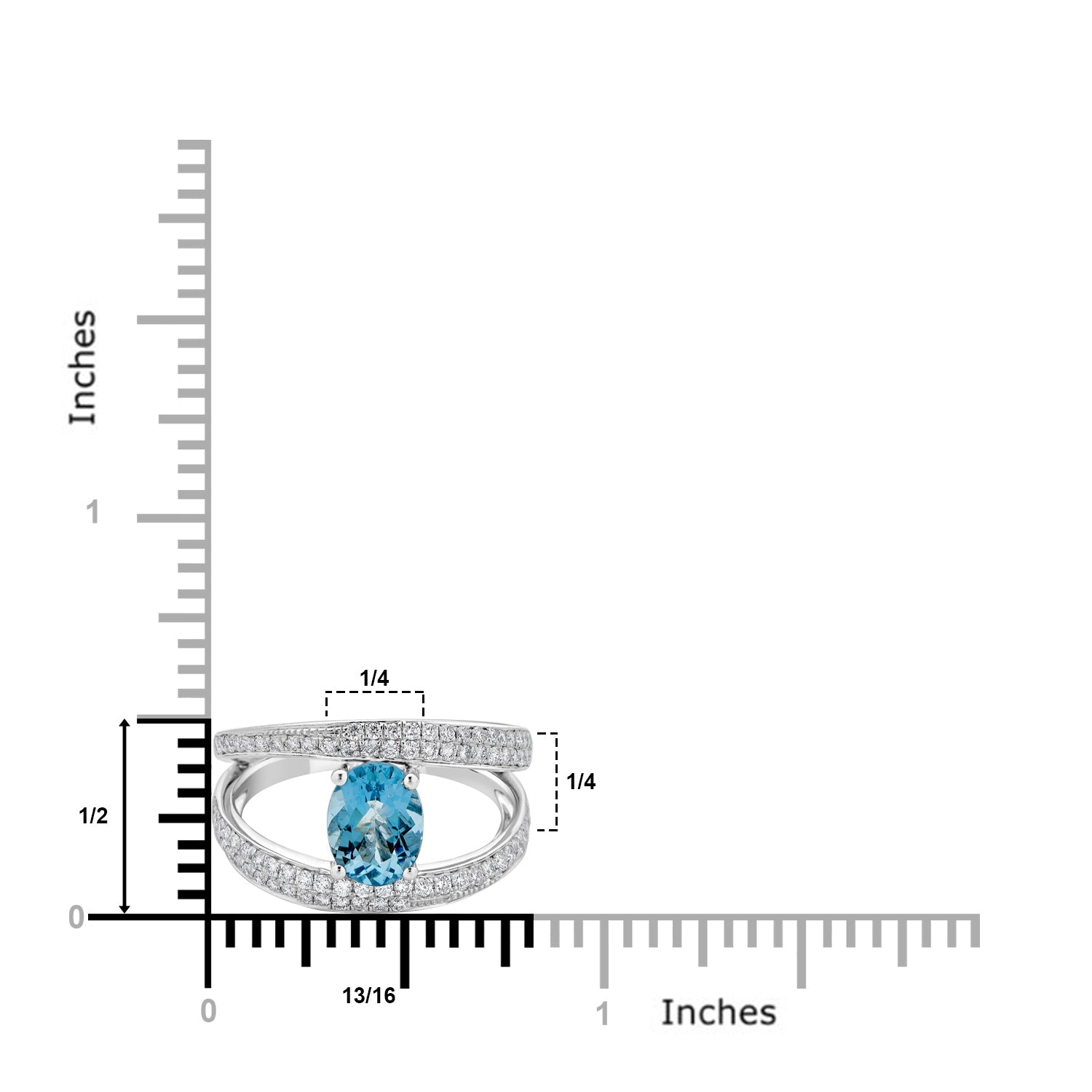 Set with a radiant oval cut Aquamarine, the unending brilliance of this ring comes from the glow of the round cut Diamonds around it. Designed with 14K white gold, dress up with luxury for any occasion wearing this fine jewelry.