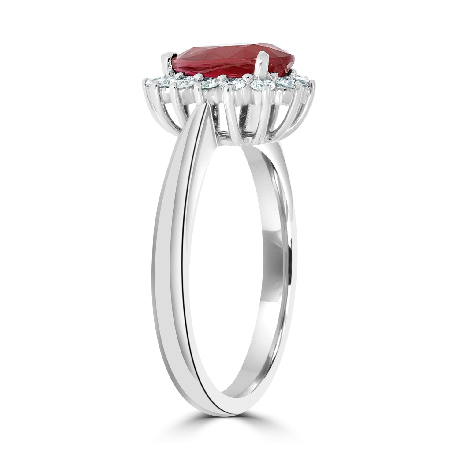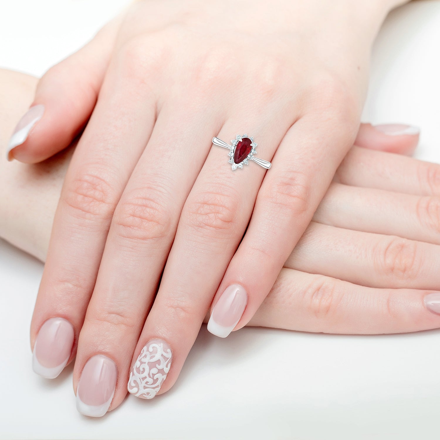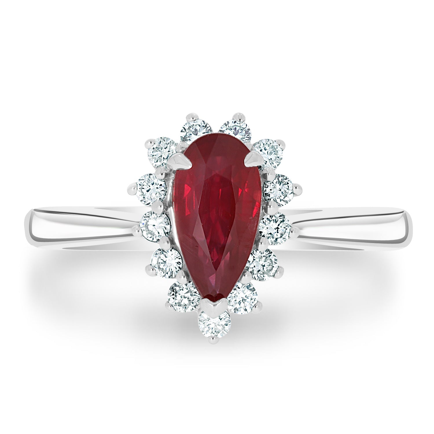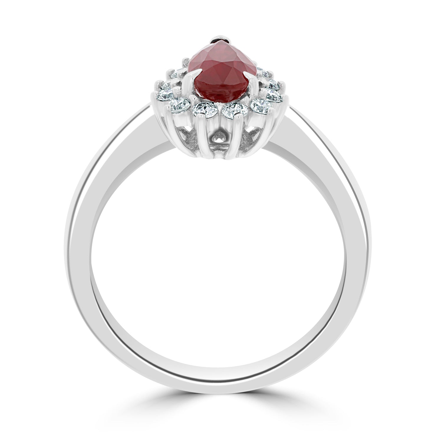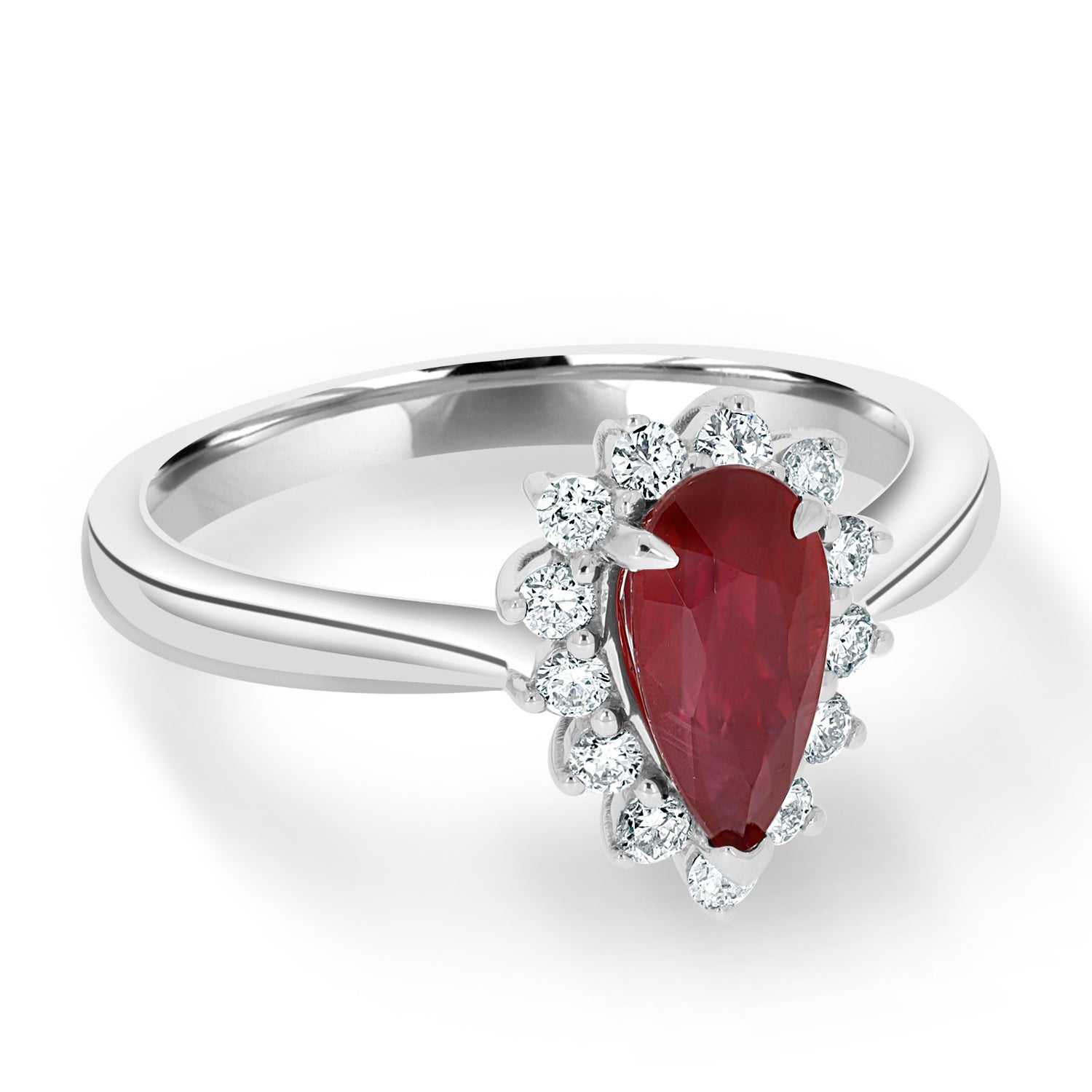 Set With A Striking Pear Cut Ruby At The Center, This Glorious Ring Is Designed With 14K White Gold For A Lustrous Finish. Bordered By Gorgeous Round Cut Diamonds, This Dazzling Ring Gives Your Attire A Touch Of Glamour.
