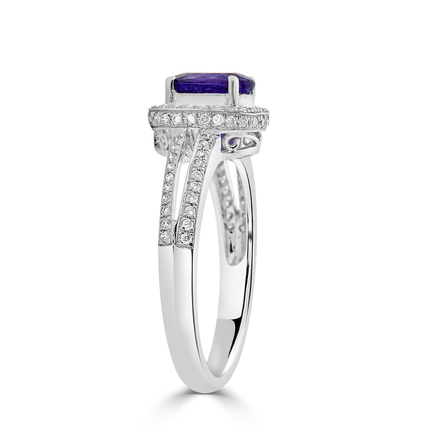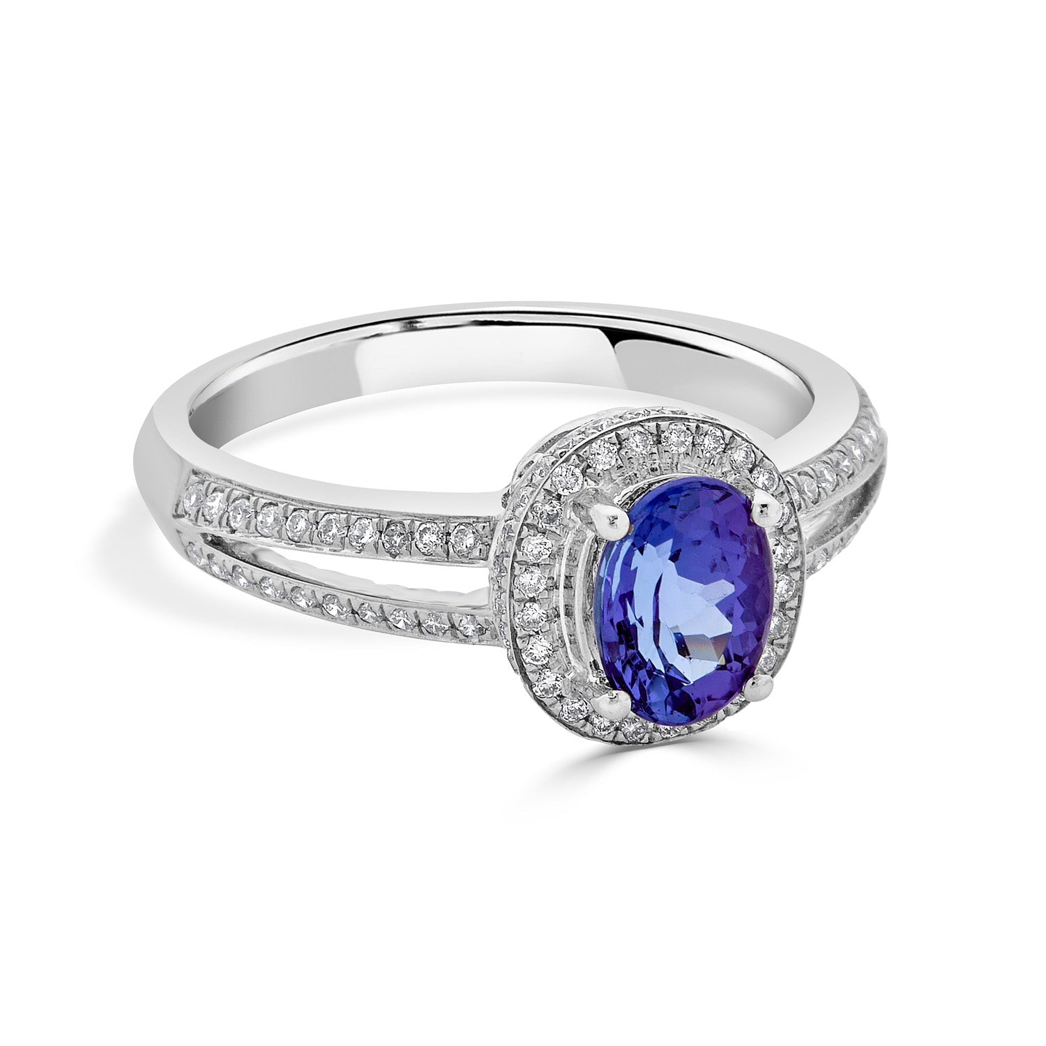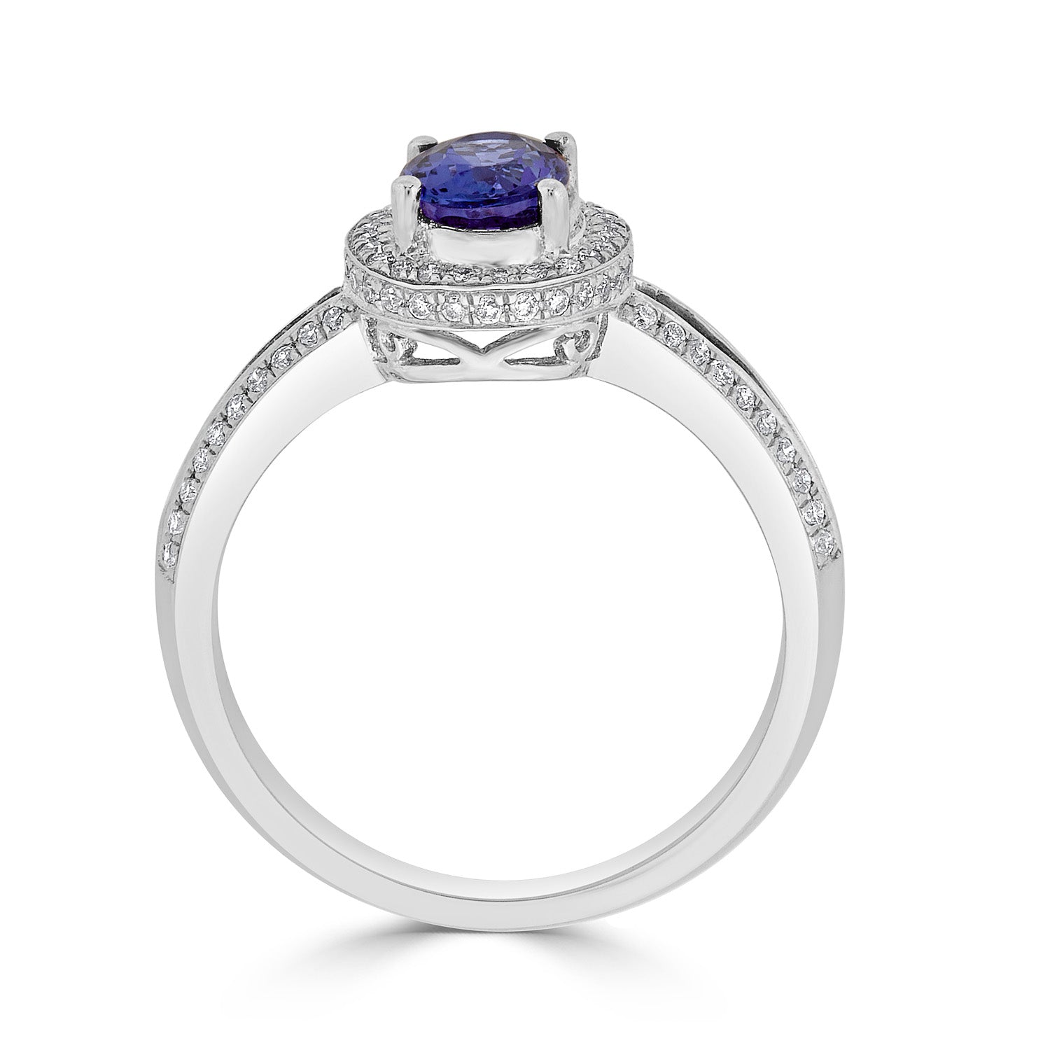 Designed with a striking oval cut Tanzanite, this arresting ring is crafted of 14K white gold for a refined finish. Bordered by sparkling round cut Diamonds, this exceptional ring will instantly take your look several notches higher.
