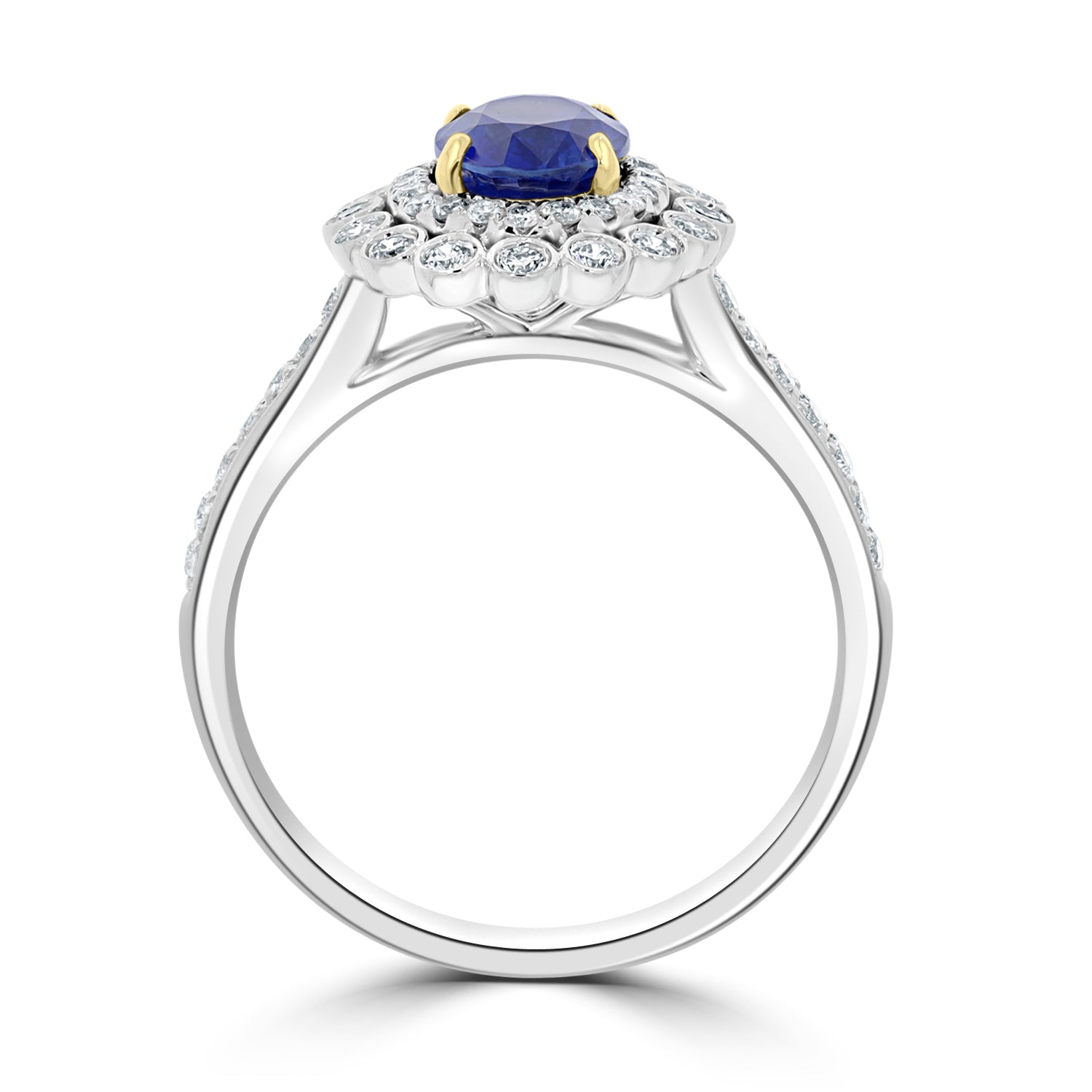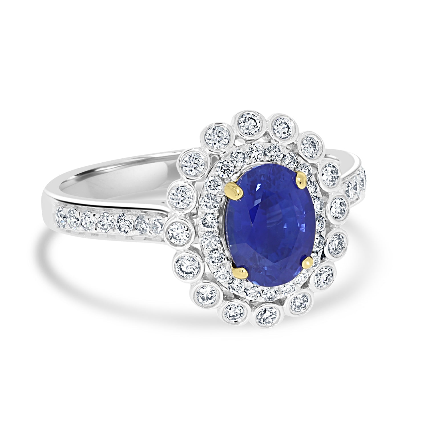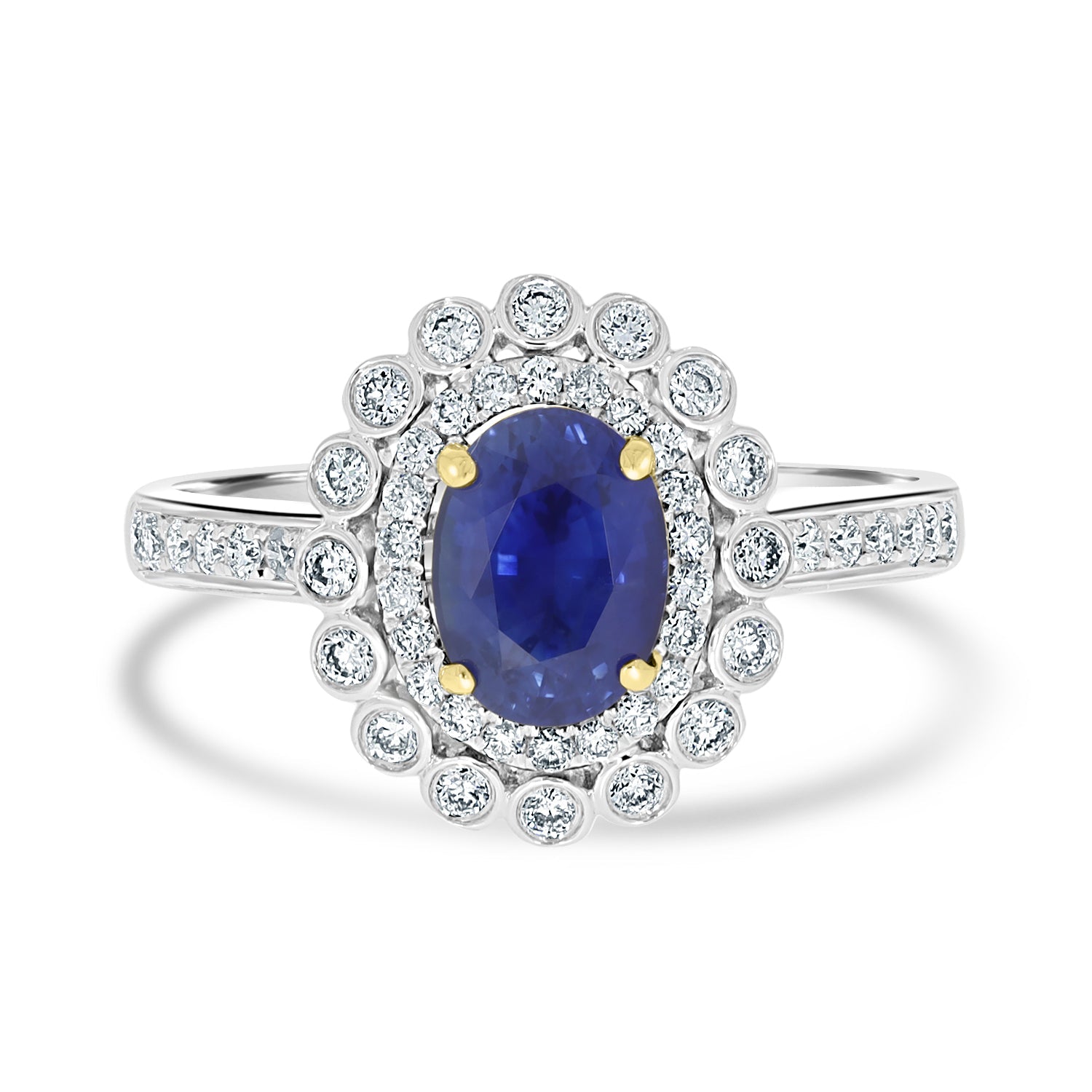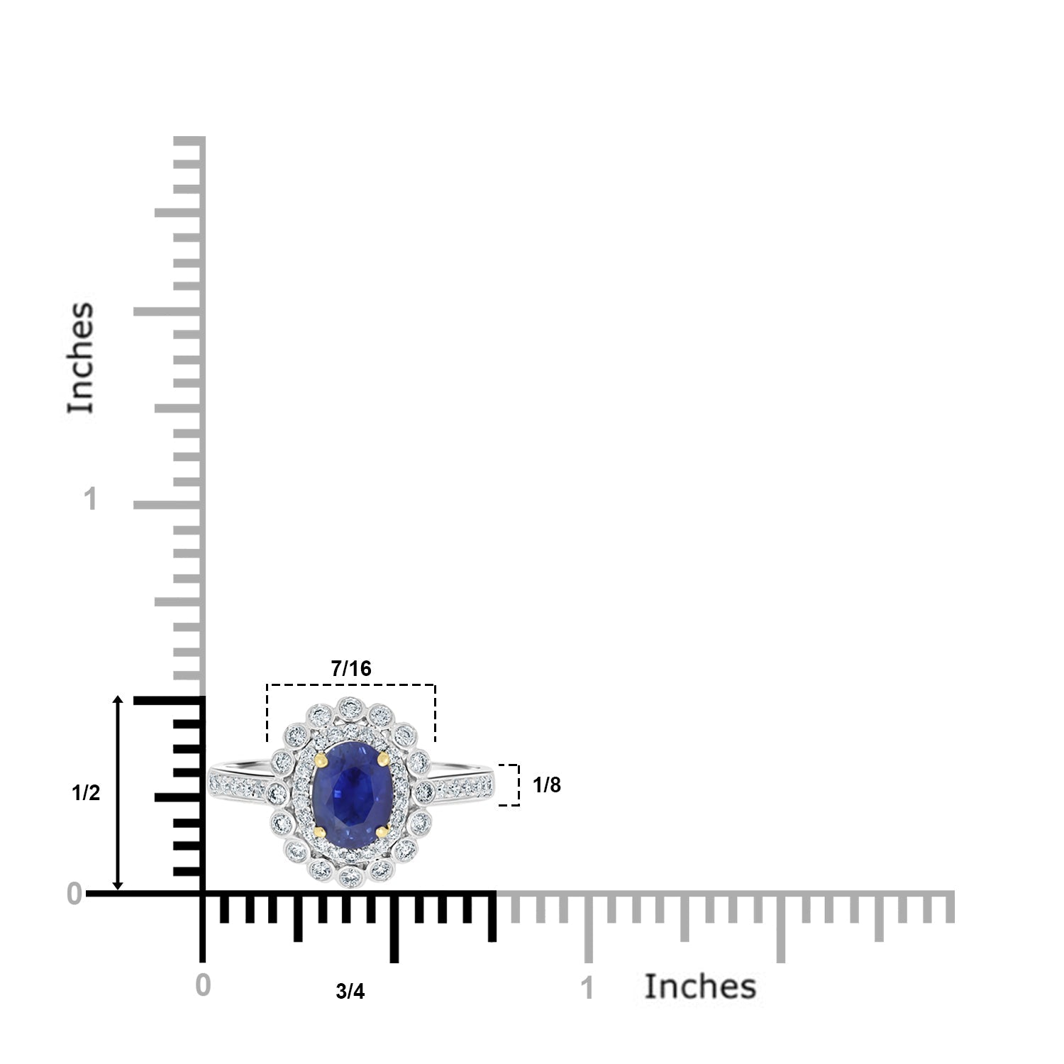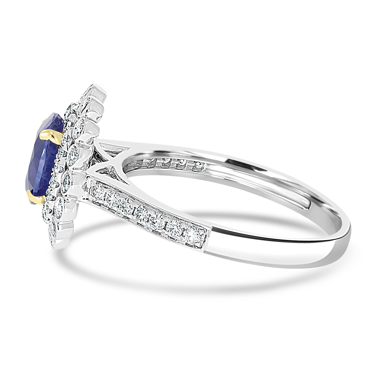 "Designed from 14K white gold, this ring is set with an oval cut Sapphire and round cut Diamonds that impart a classic look."