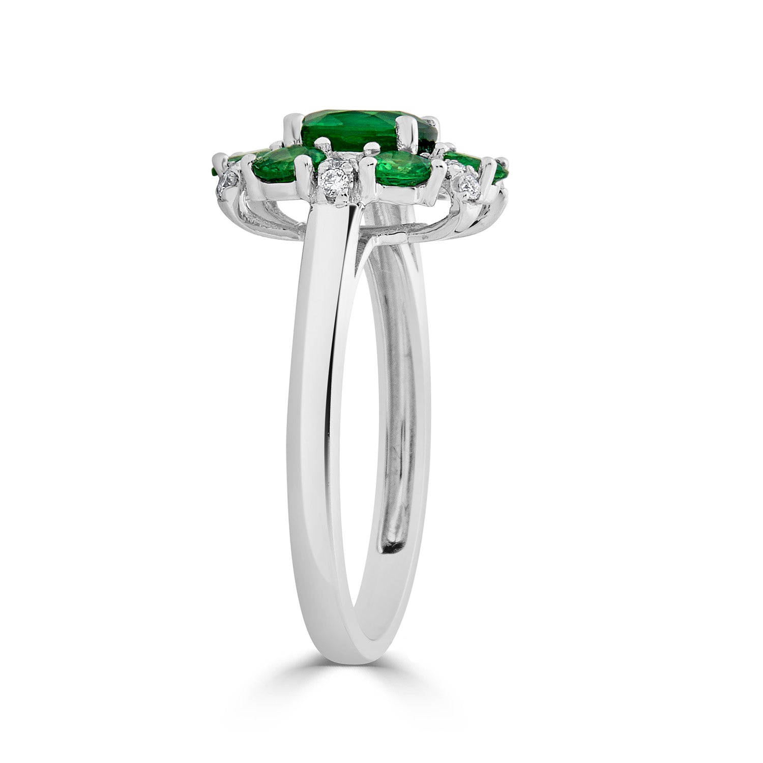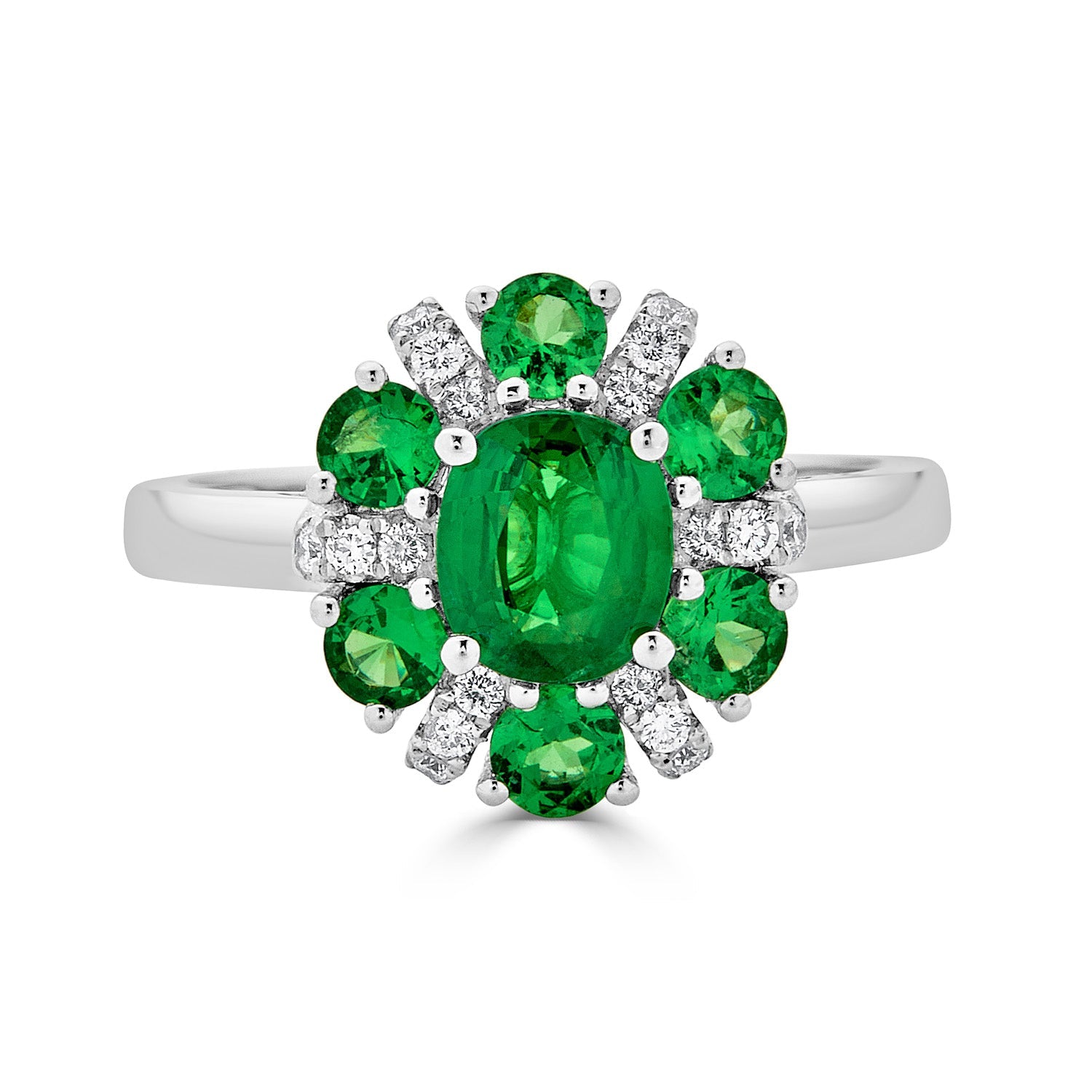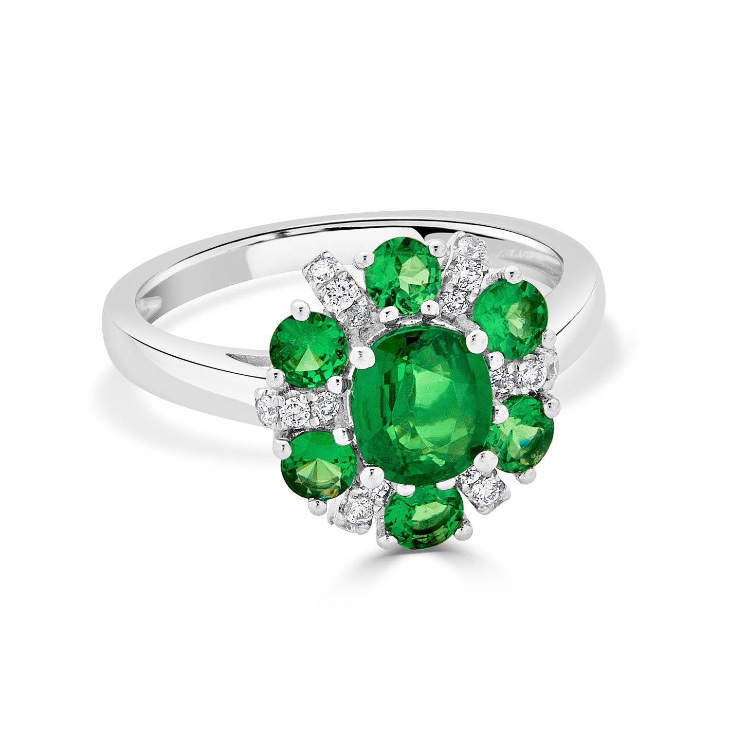 Styled of 14k white gold, this ring is themed in an interesting design that makes it a perfect style pick for both classic and modern look. The ring is set with oval cut Tsavorite and round Diamonds that mesmerizes you with the colors they reflect.