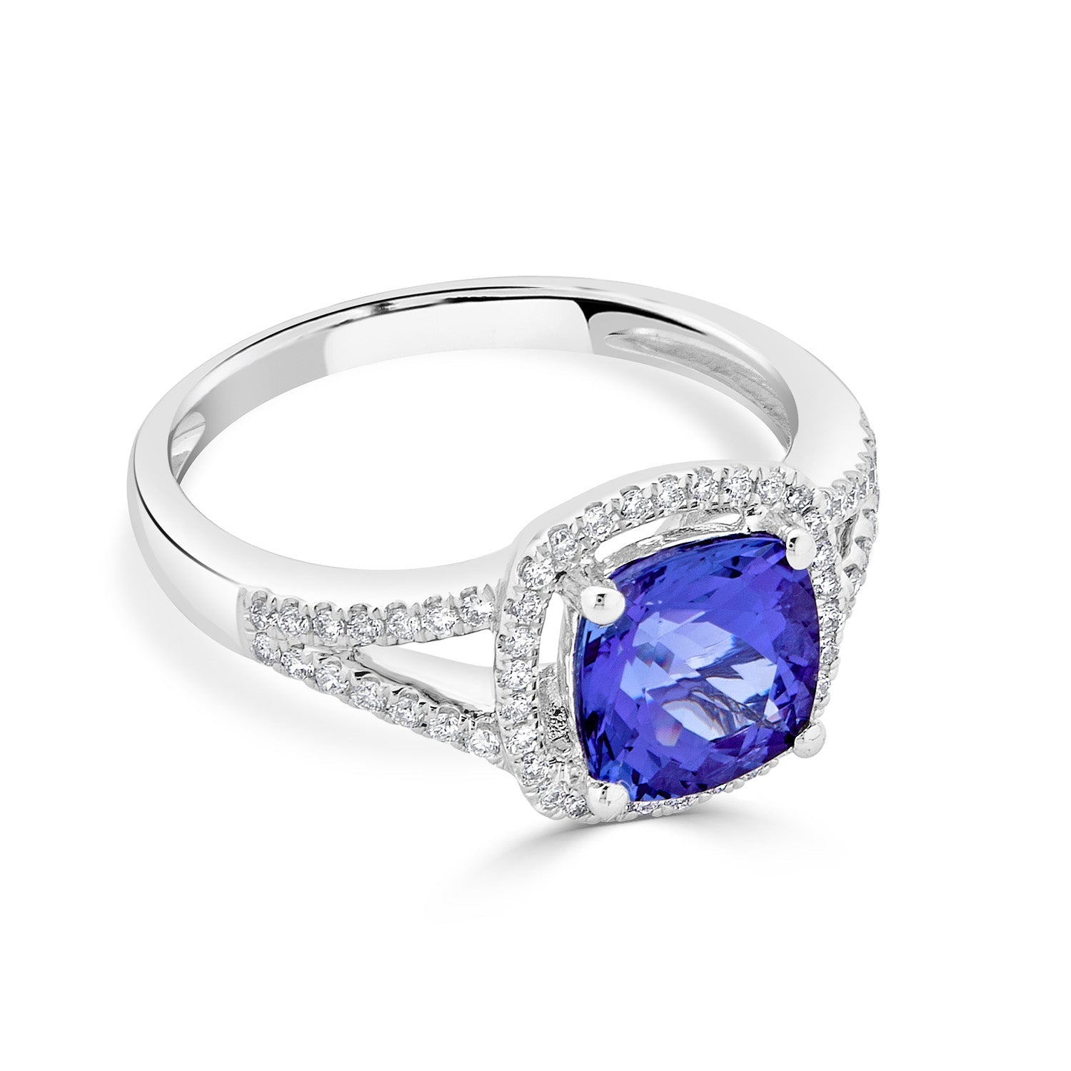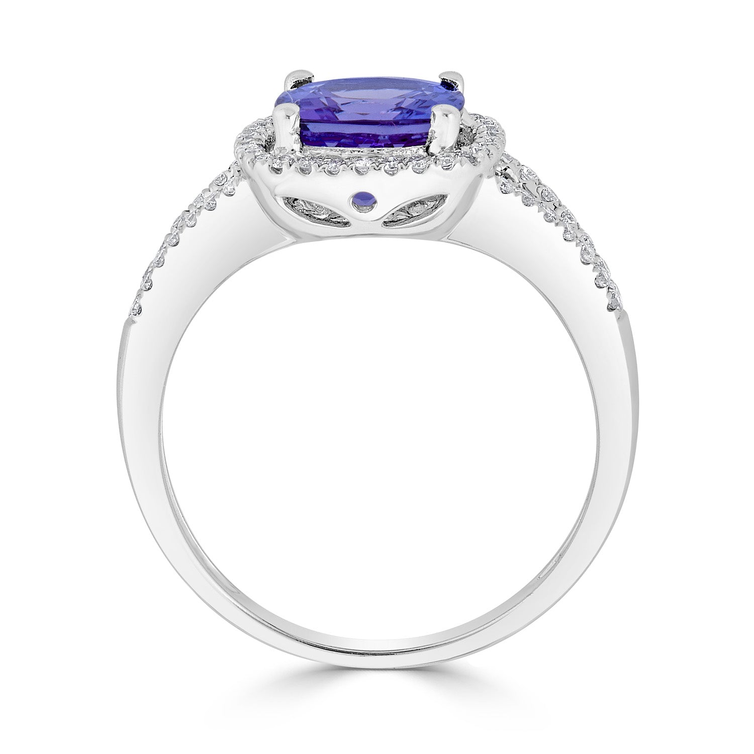 Designed from 14k white gold, this ring is a stunning beauty and world-class artistry. Cushion-cut Tanzanite and round Diamonds weave around each other to form these rings. Styled to perfection, this ring is great for special occasions.