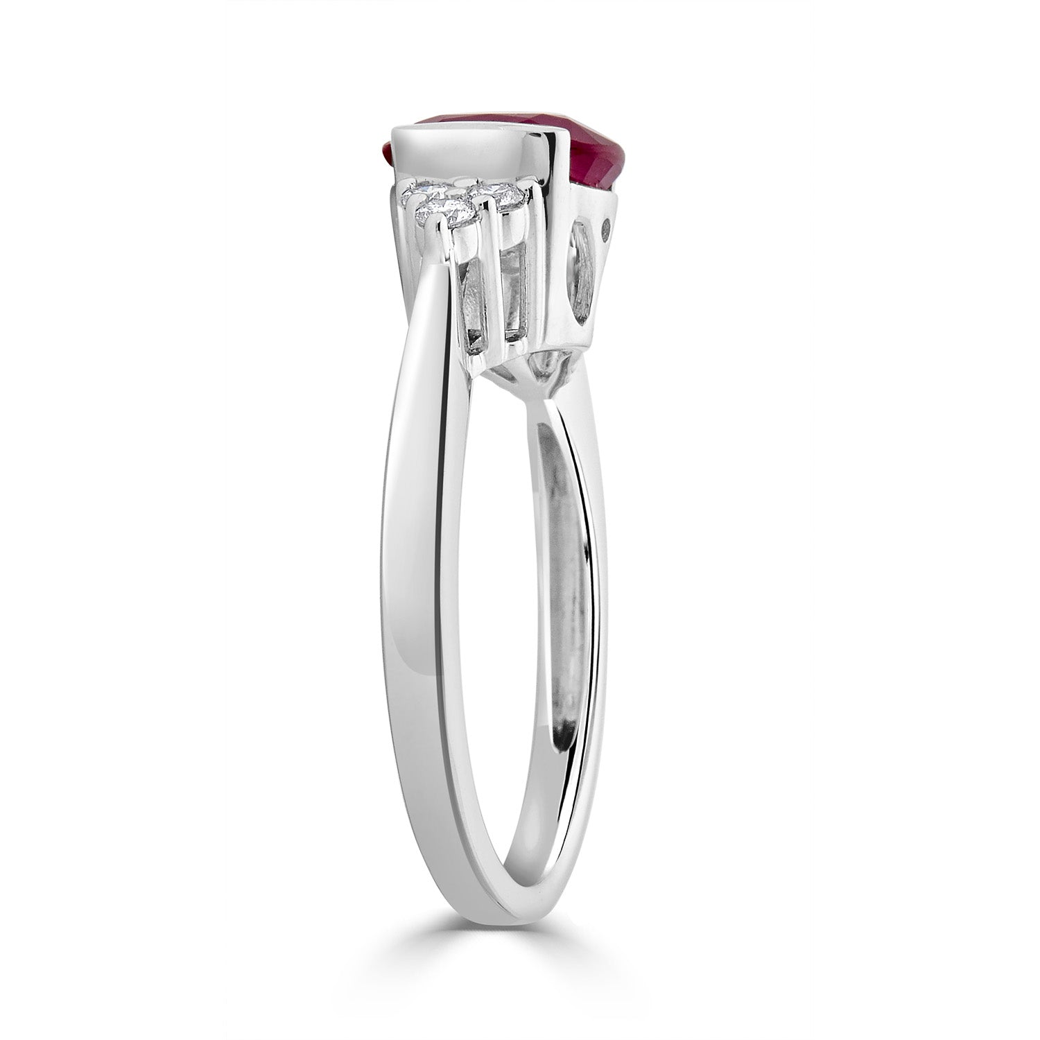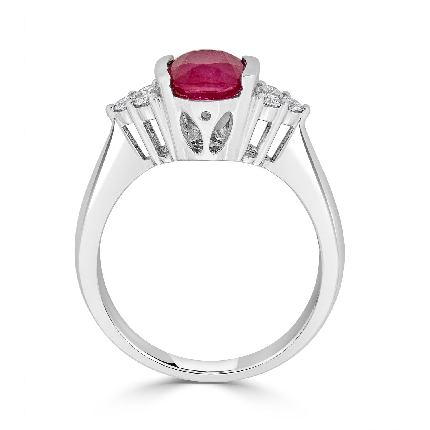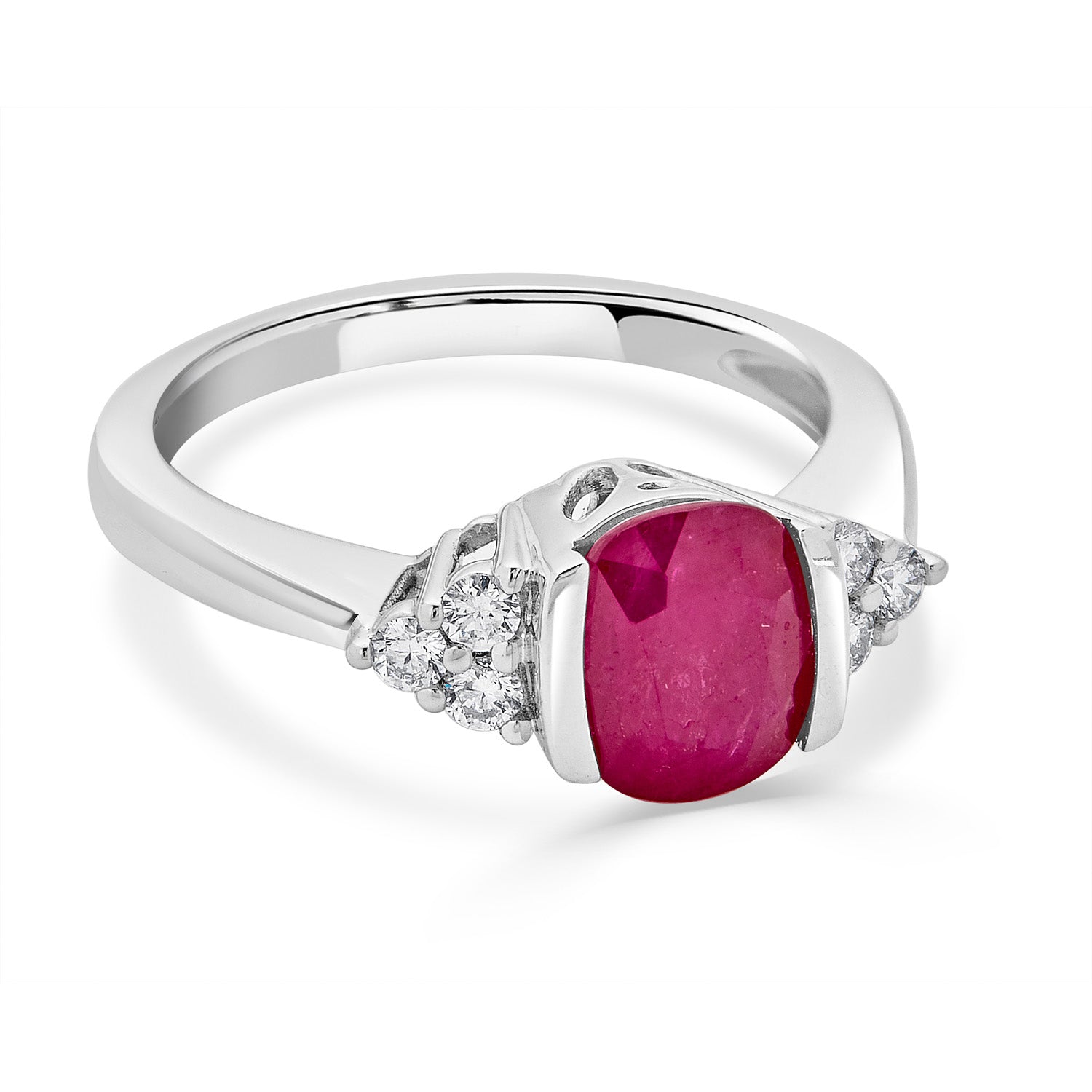 The striking beauty of this luxury-style ring that is designed with oval cut Ruby and round Diamonds makes it the perfect piece that fits for royalty. An exquisite 14K white gold ring that gives your elegance a well-groomed finish!