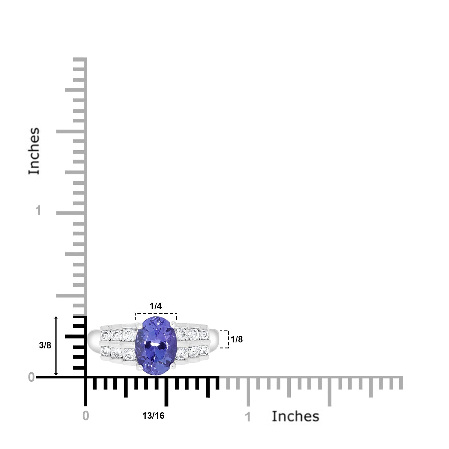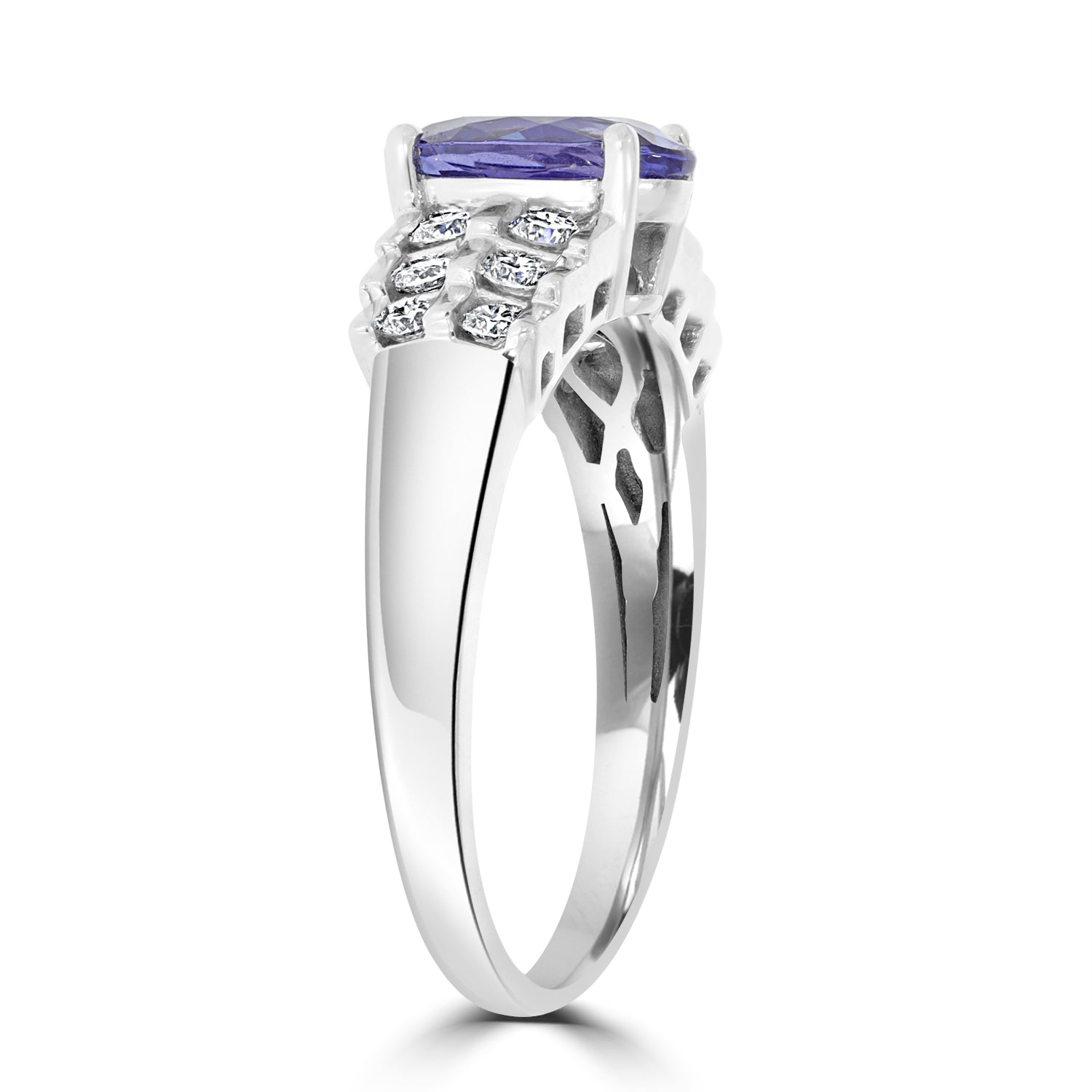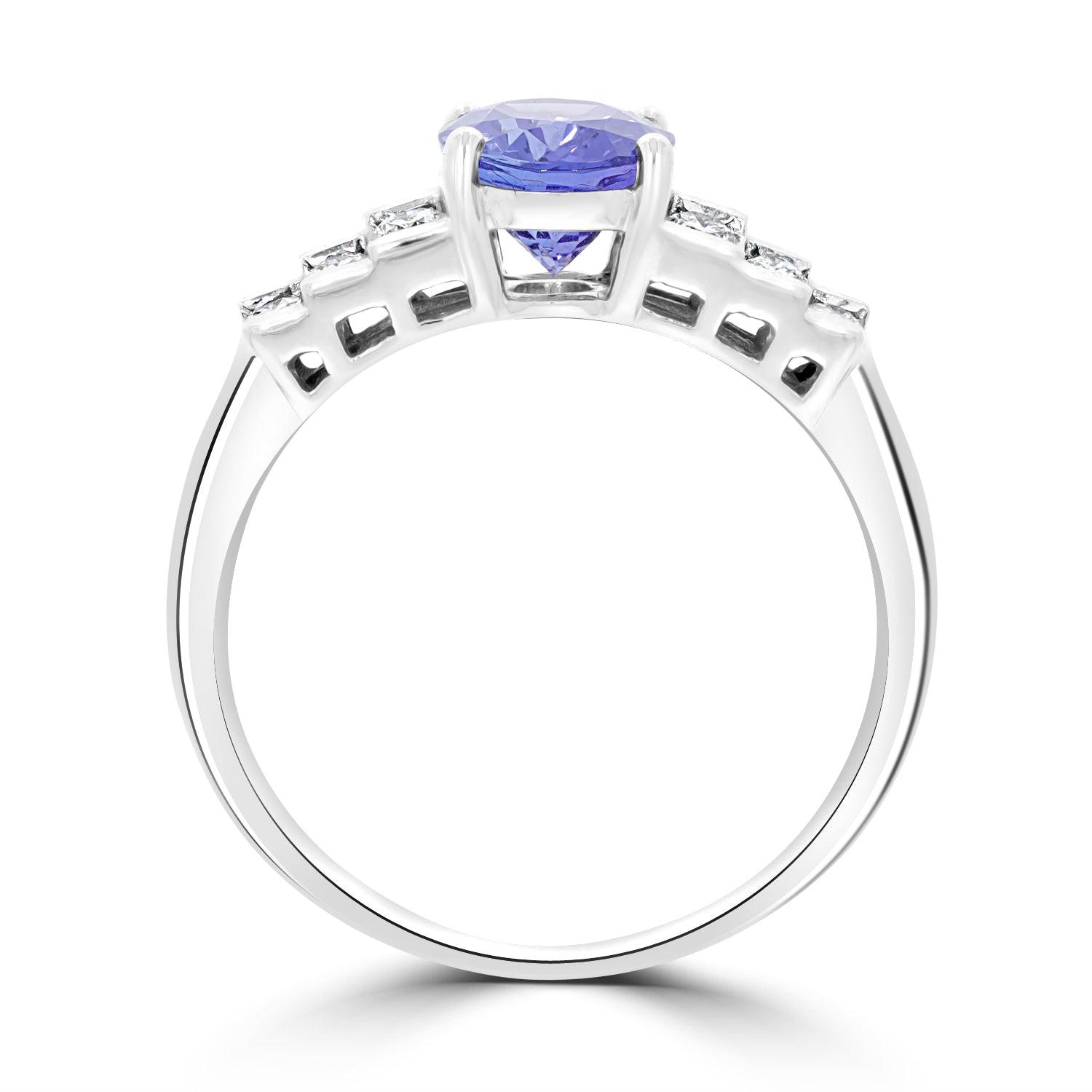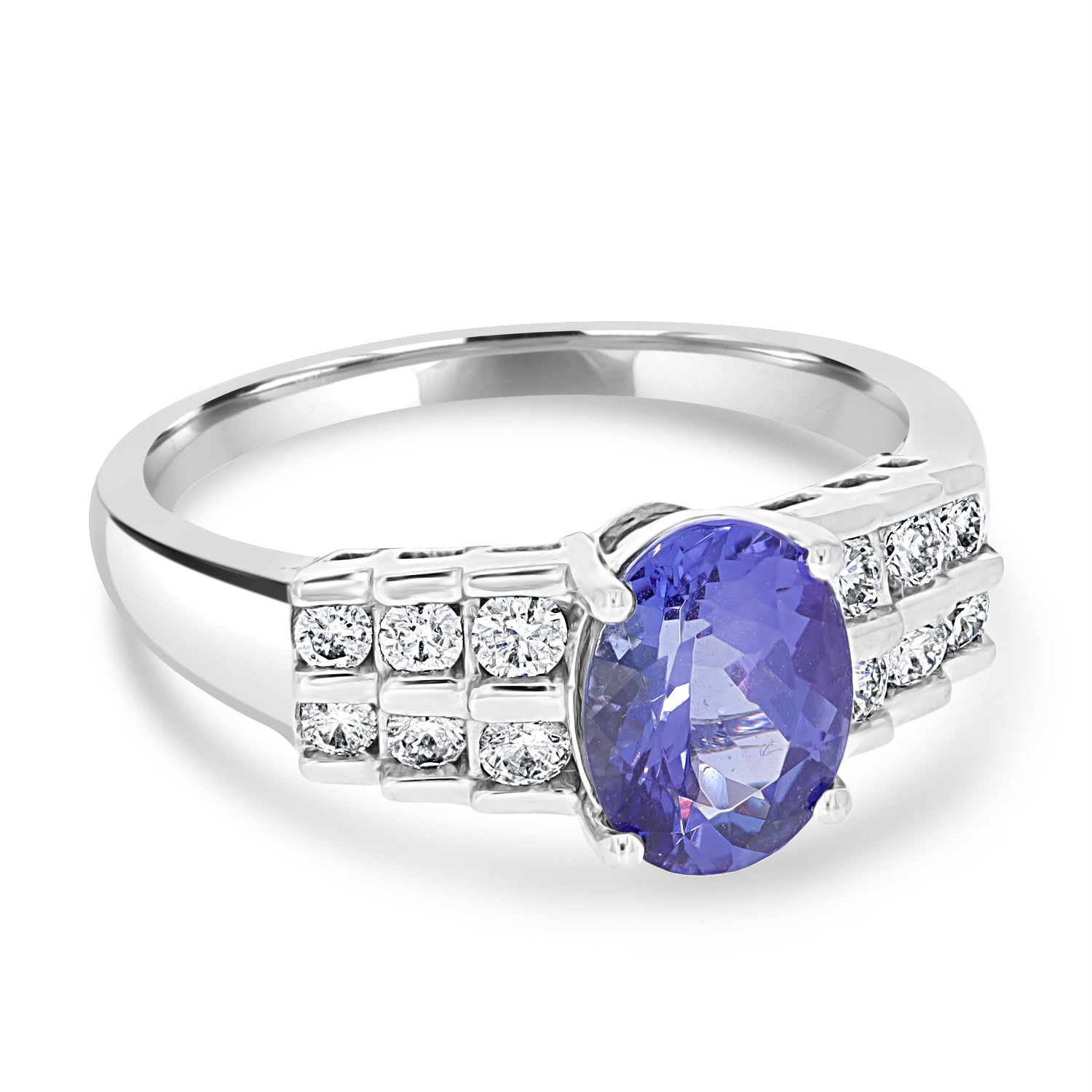"Crafted from 14K white gold, this mesmerizing ring is studded with oval cut Tanzanite at the center and round cut Diamonds encircle it."