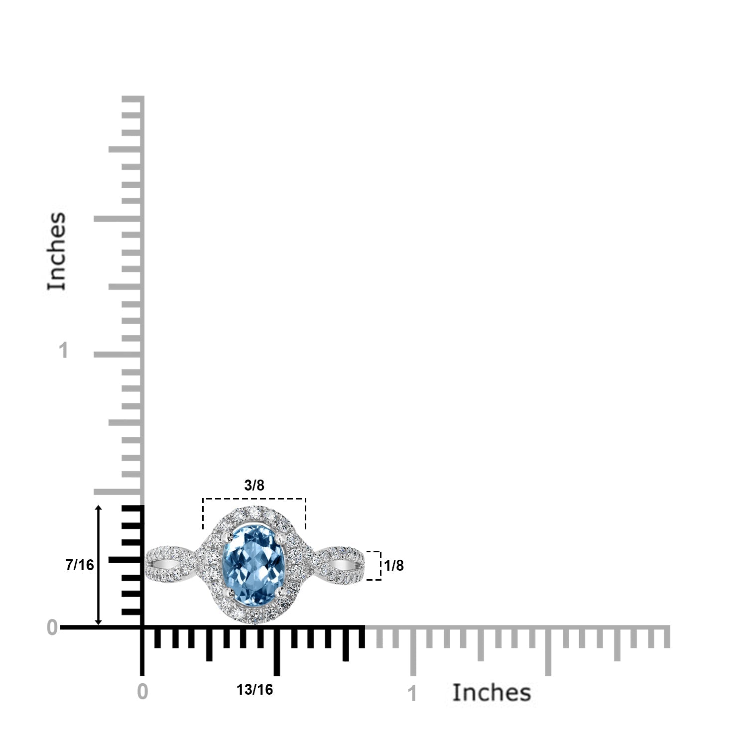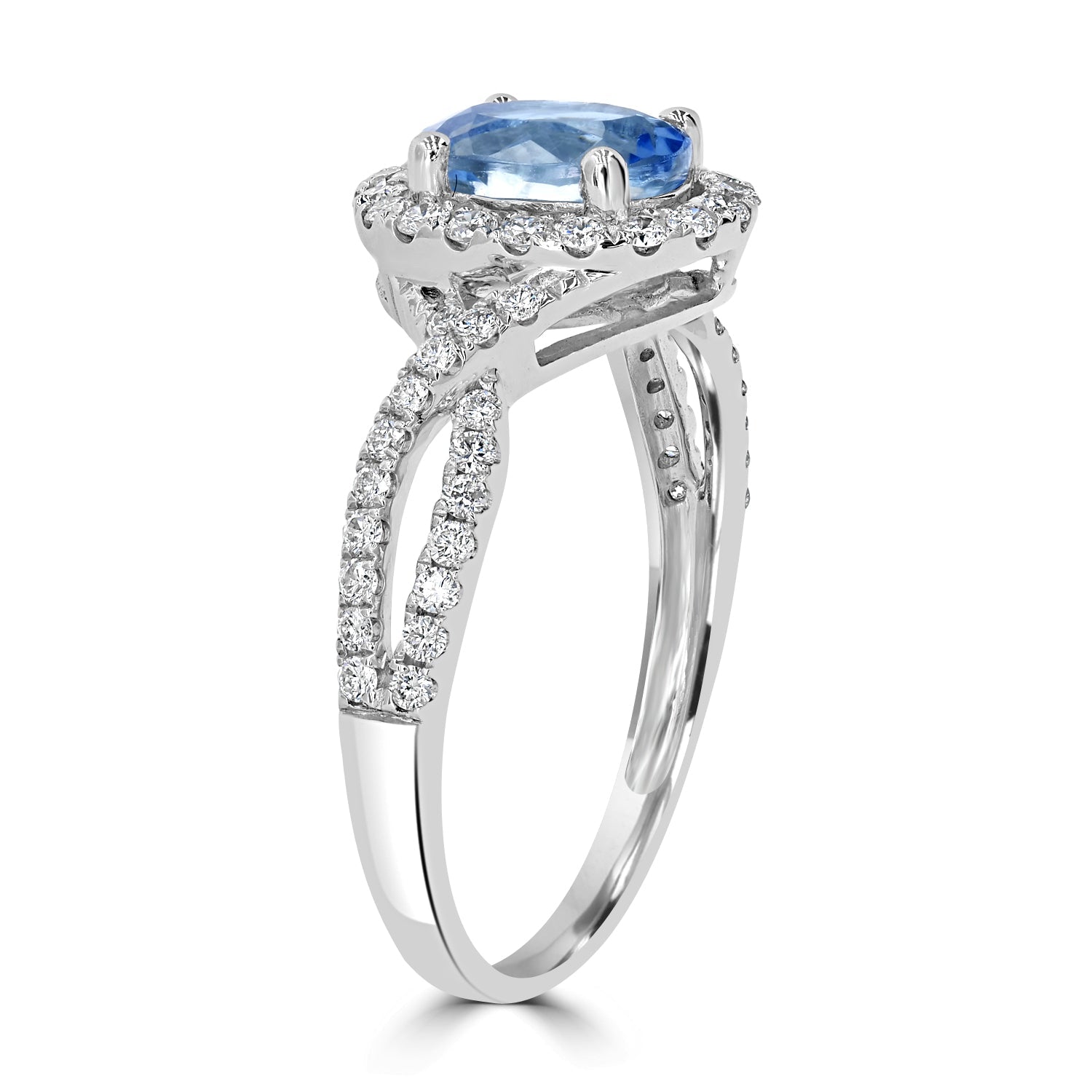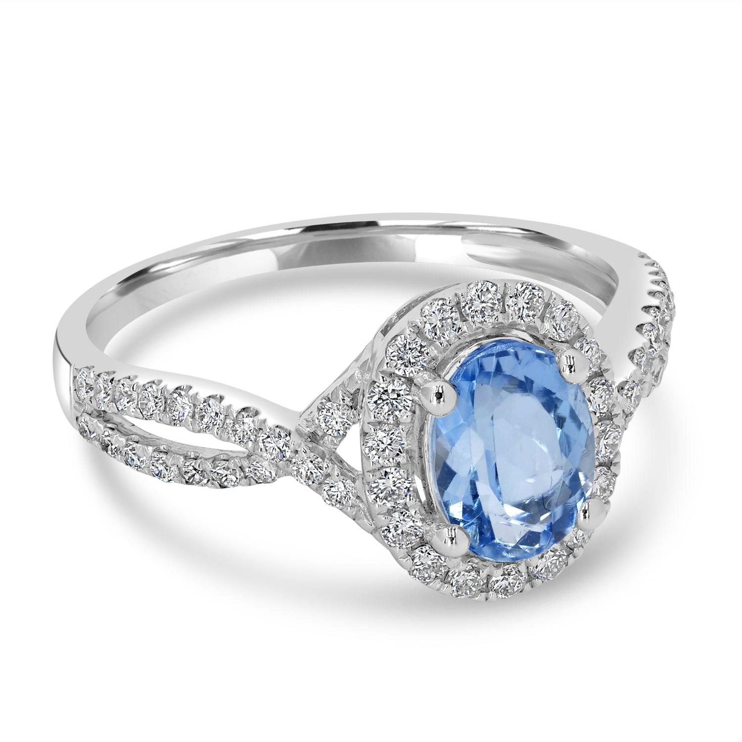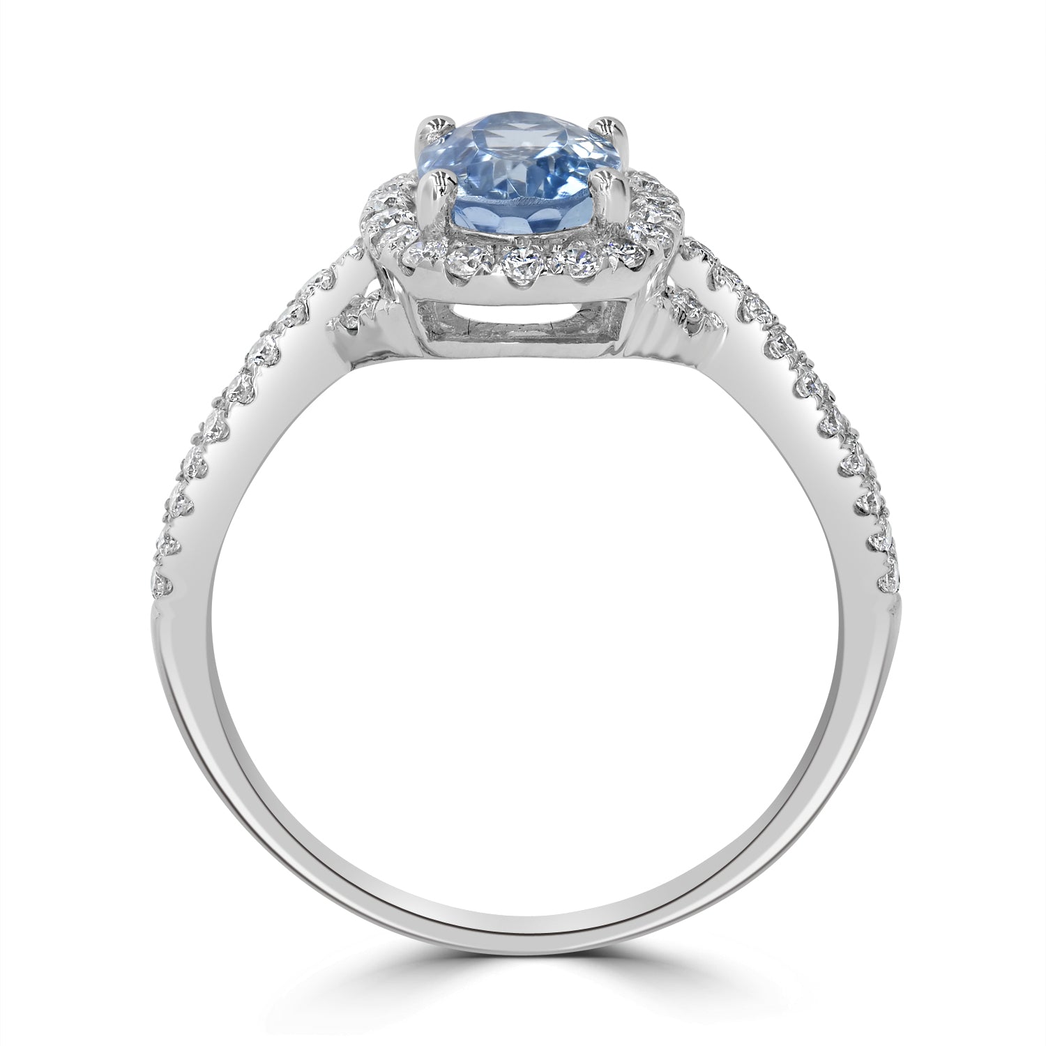 This trendy ring designed with 14k white gold and set with an opulent oval-cut Aquamarine and round Diamonds.