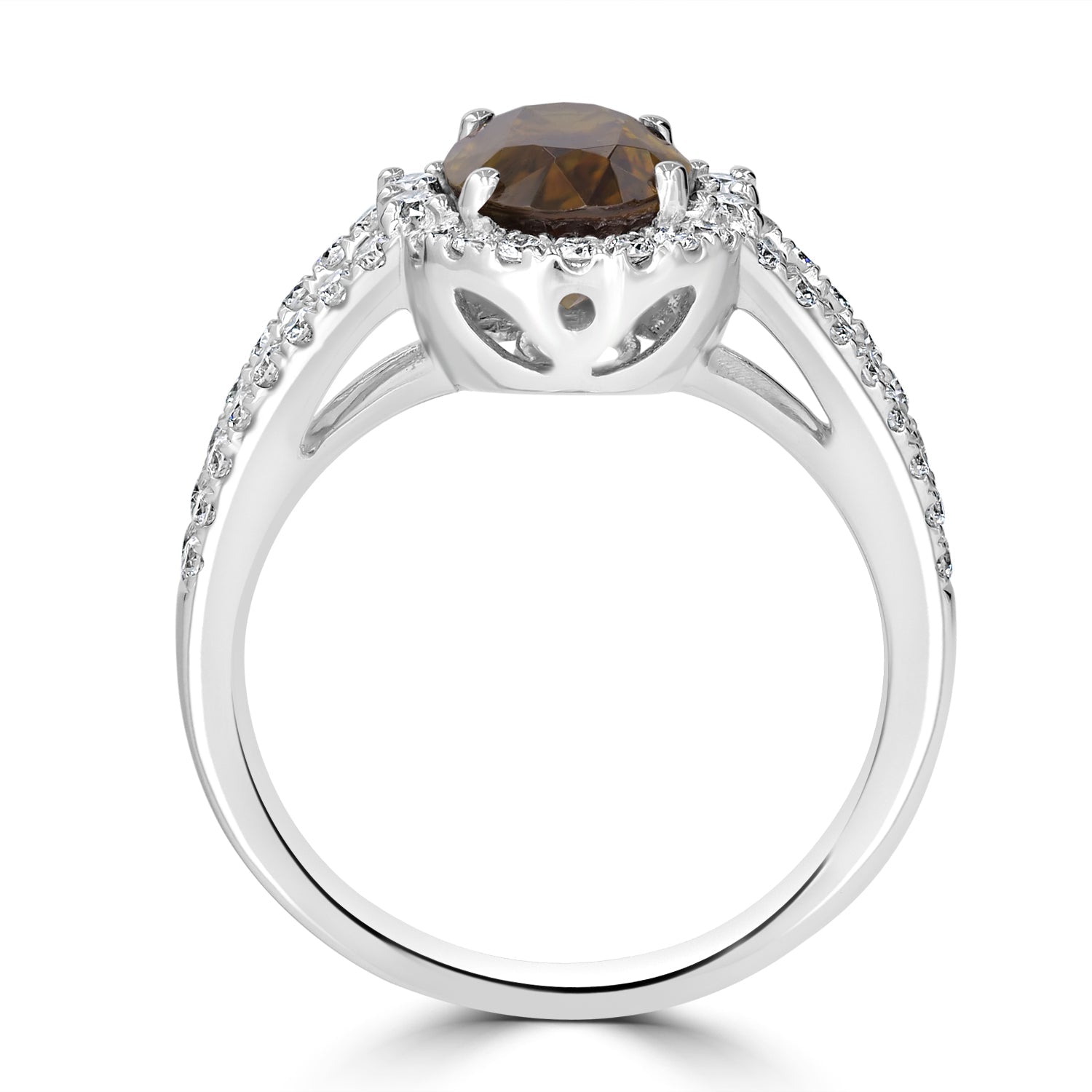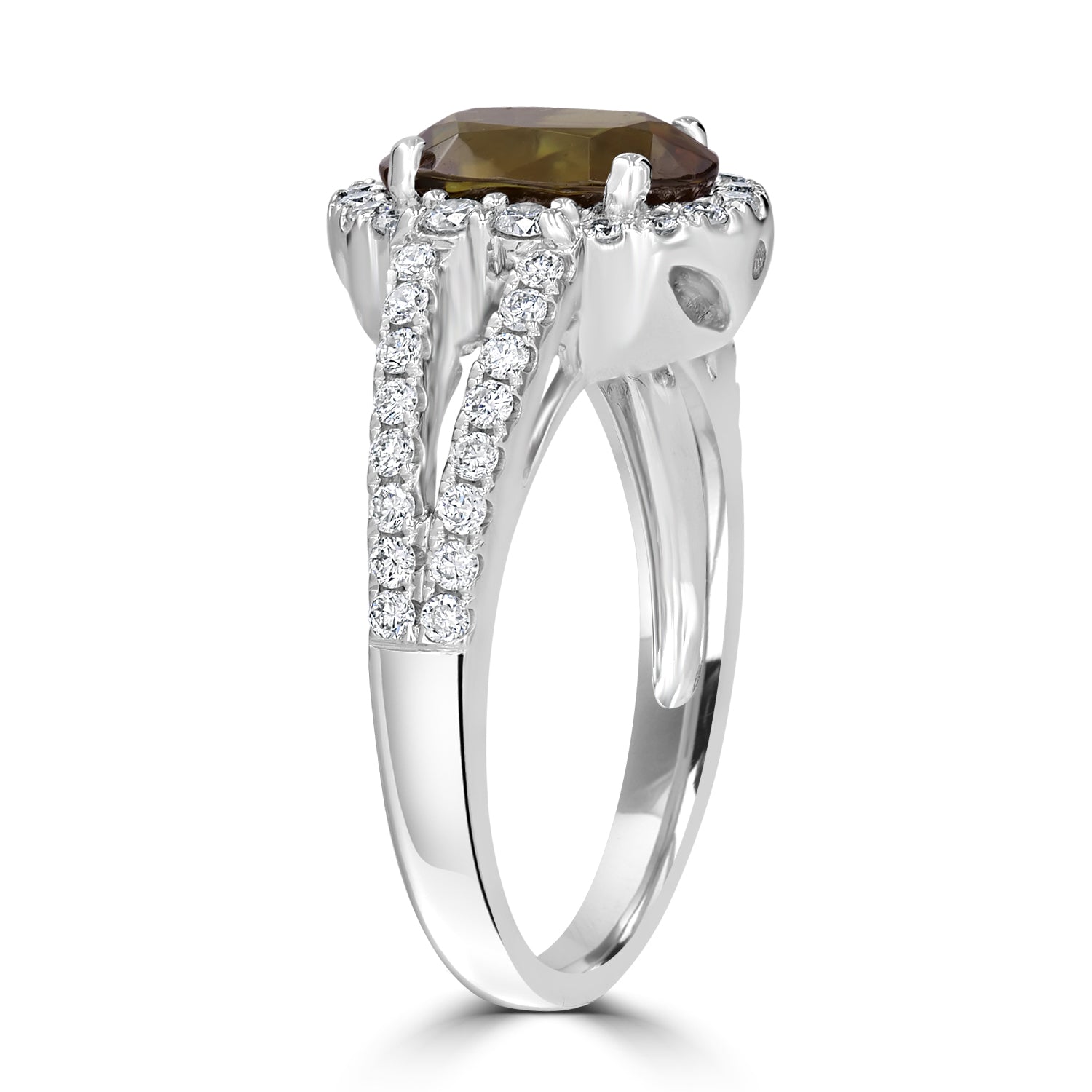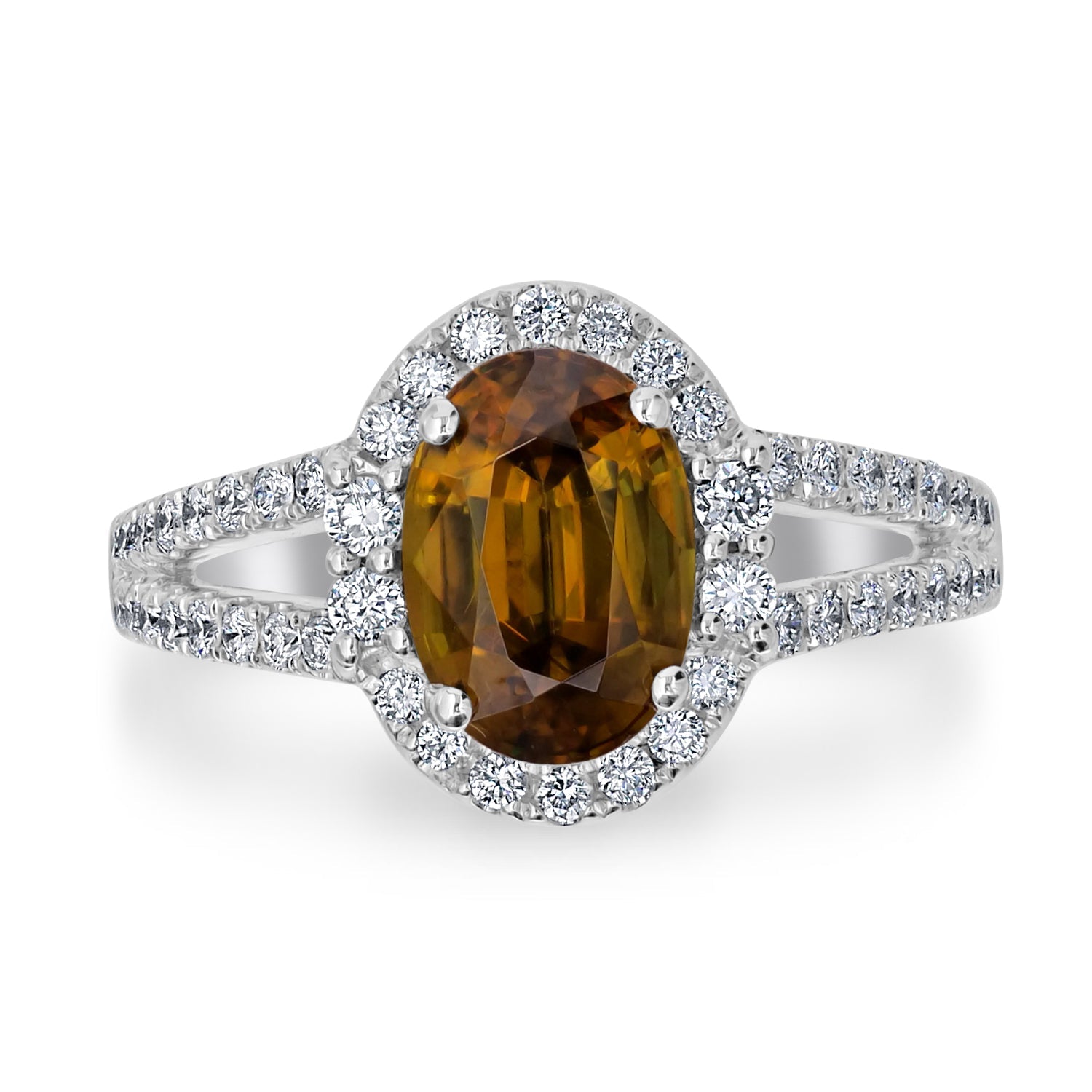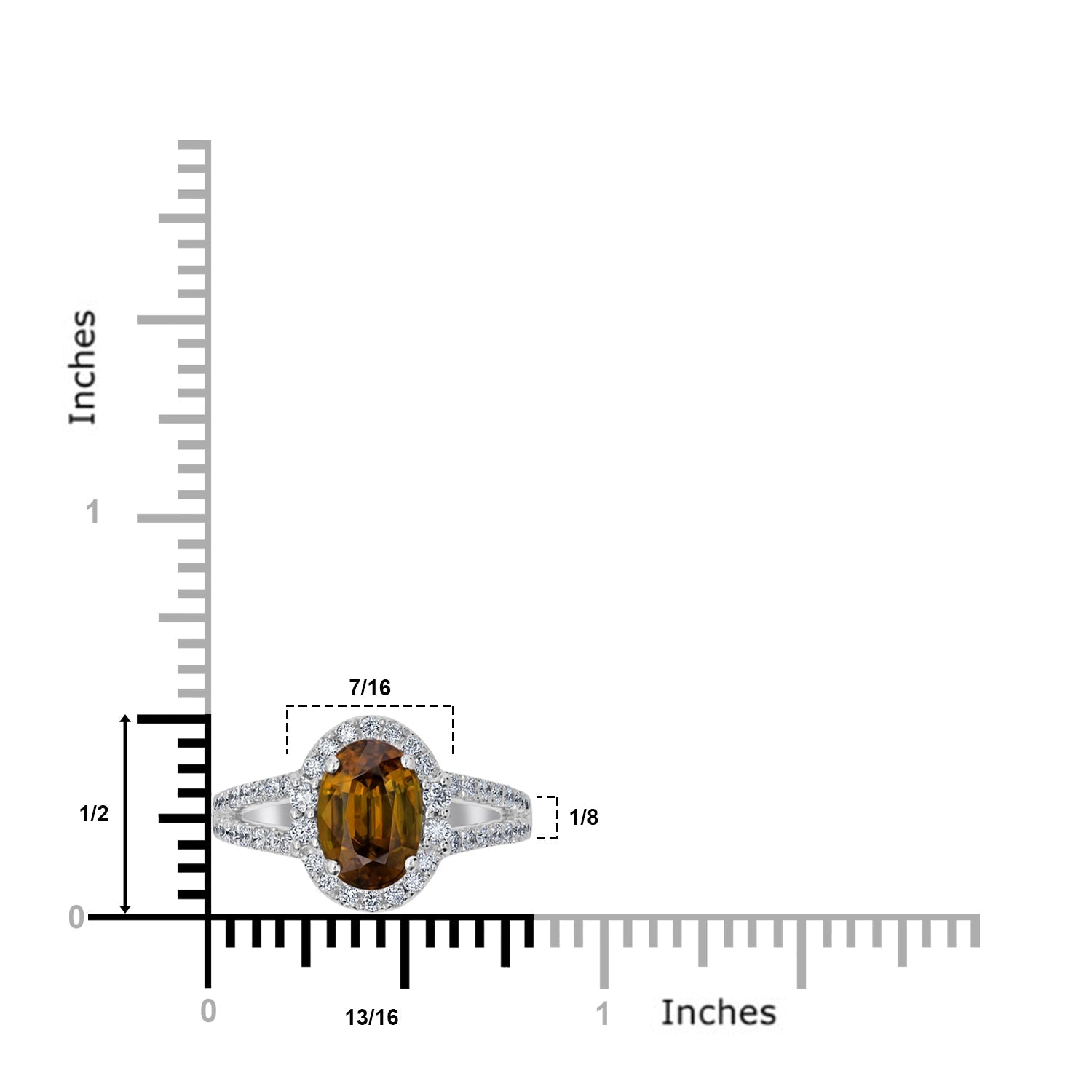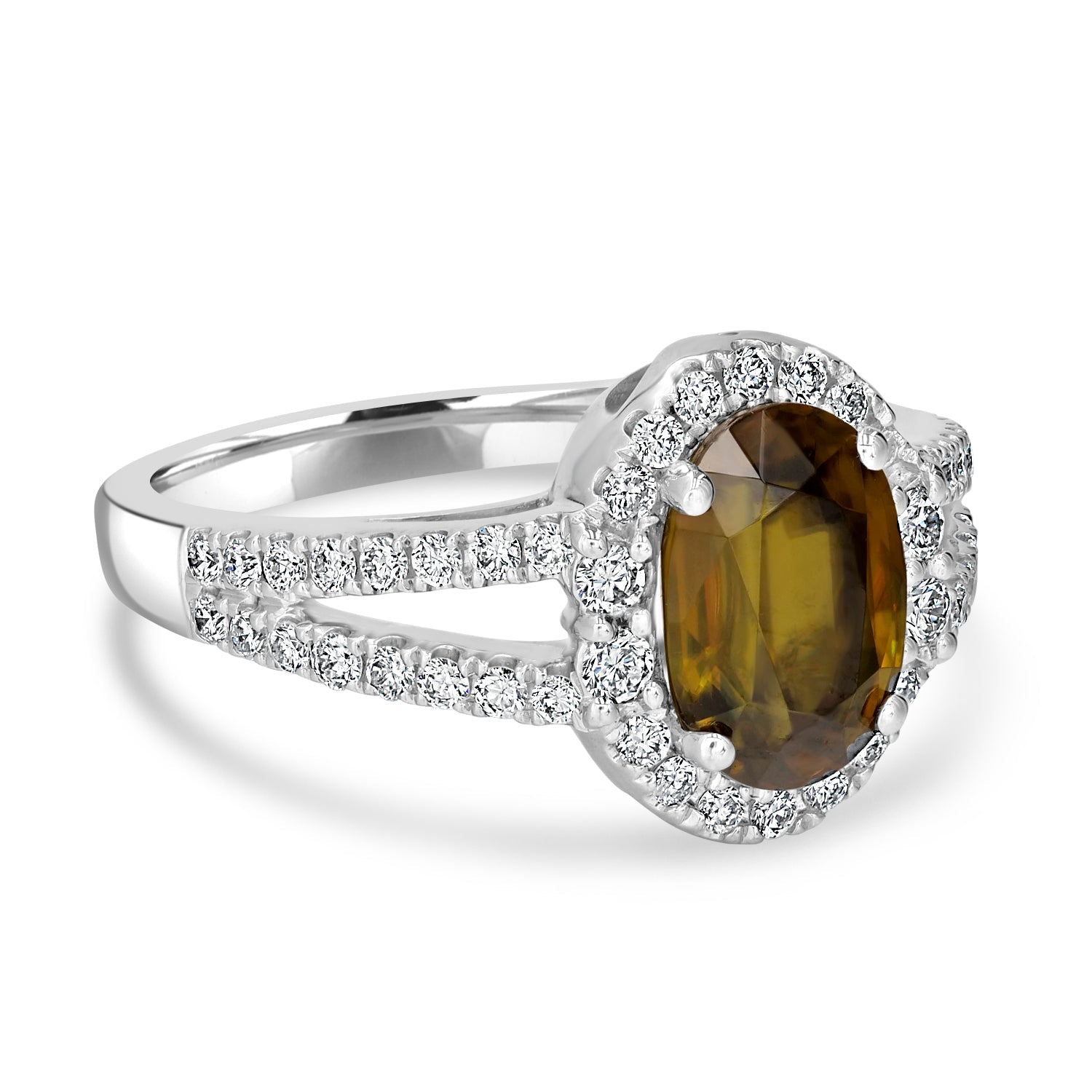 Set with a splendid oval cut Sphene, this enchanting ring is crafted from 14K white gold and encircled with gorgeous round cut Diamonds that are truly hard to miss.