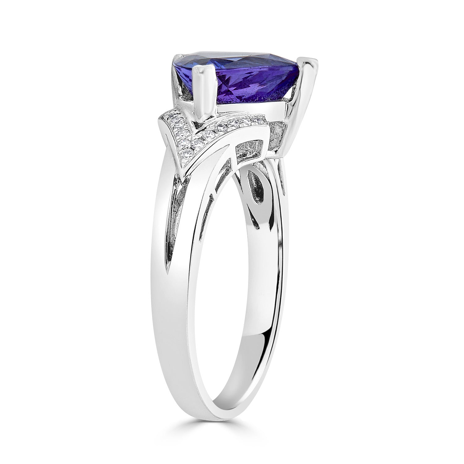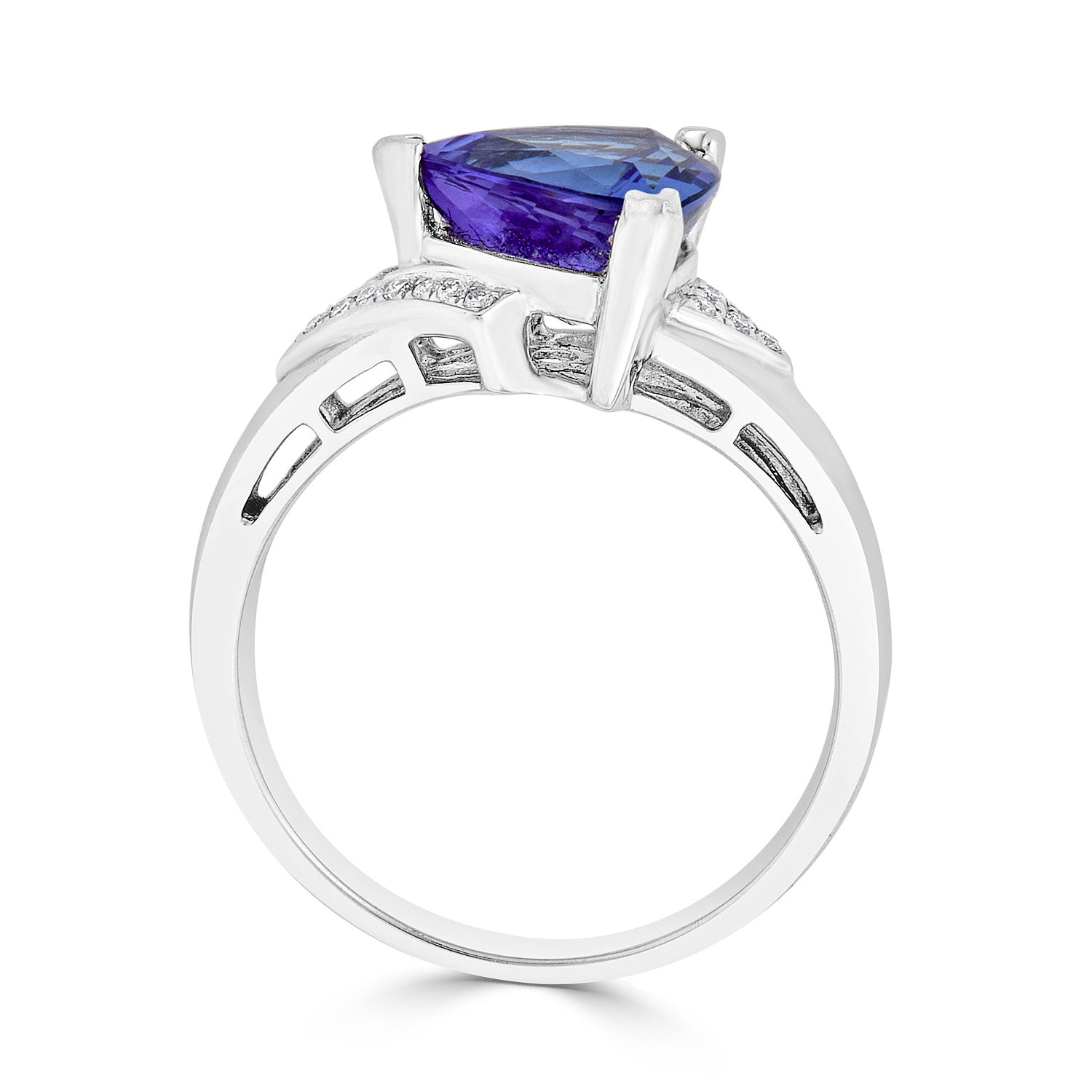 This Ring That Is Artistically Crafted Of 14k White Gold Lends A Fashionable Look That Favors Fashionistas. Displaying An Impressive Design Featuring Trillion Cut Tanzanite And Round Diamonds, This Ring Goes Well With Every Style Outfit.