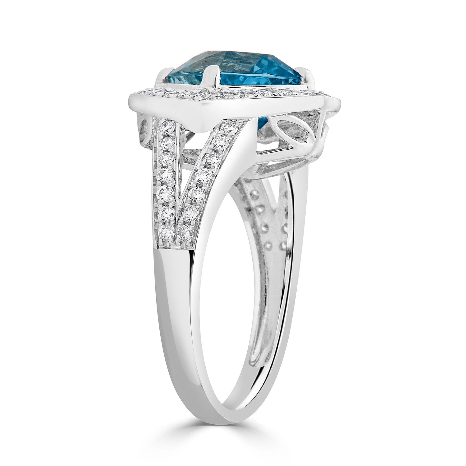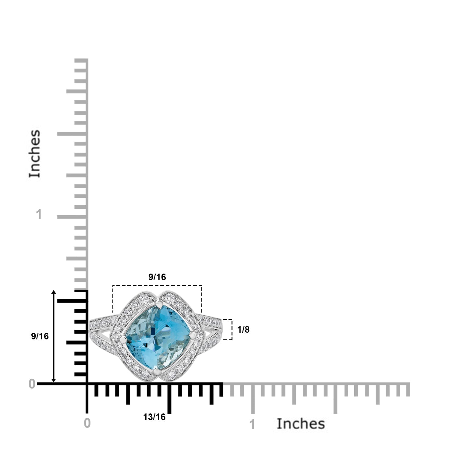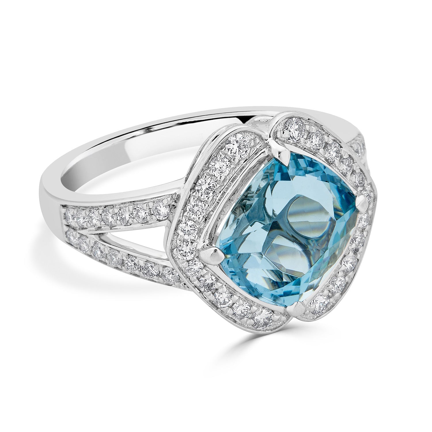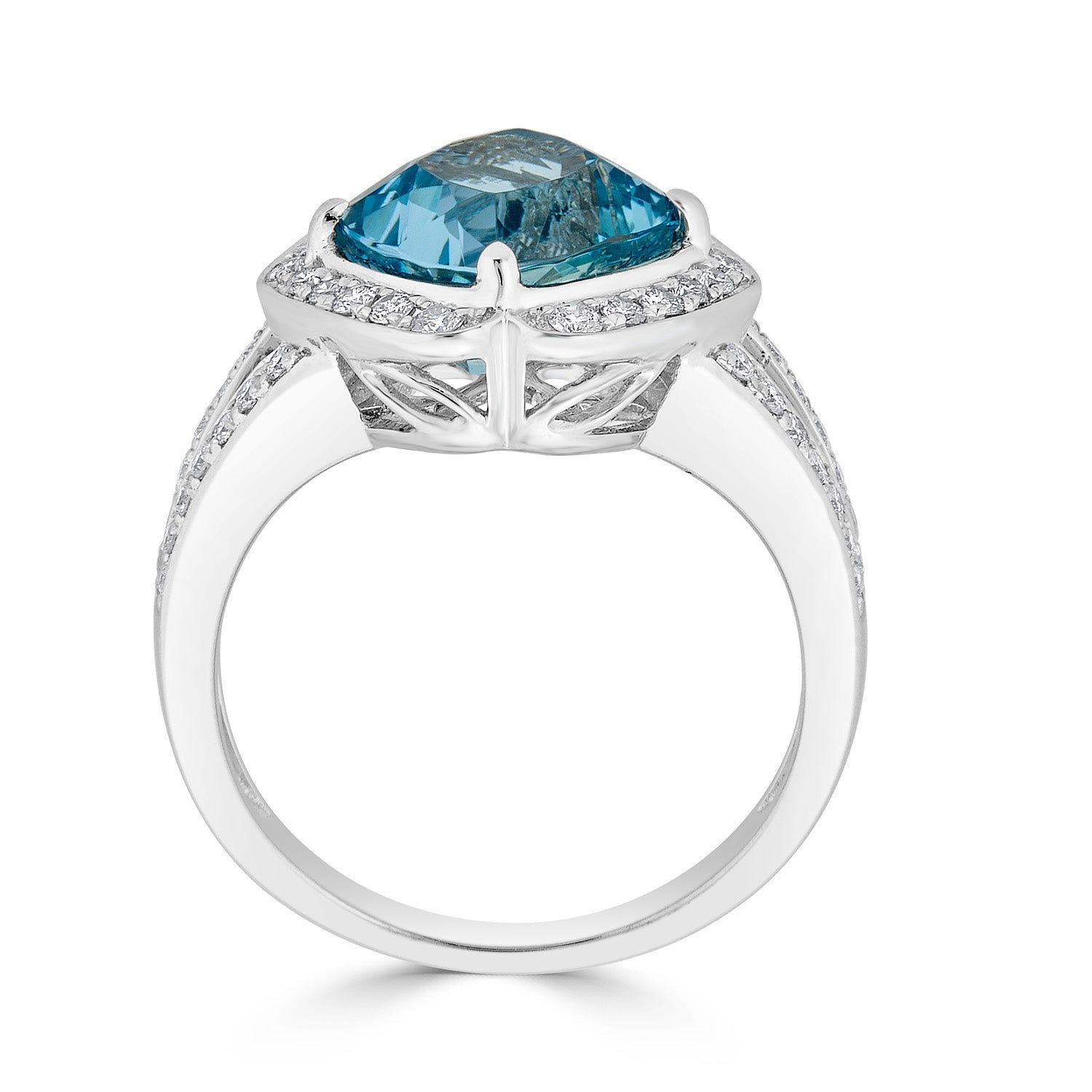 Designed with a splendid cushion cut Aquamarine, this elegant ring is designed with 14K white gold for extra richness. Surrounded by the shimmer of round cut Diamonds, wear it to give your attire a generous dose of glamour.