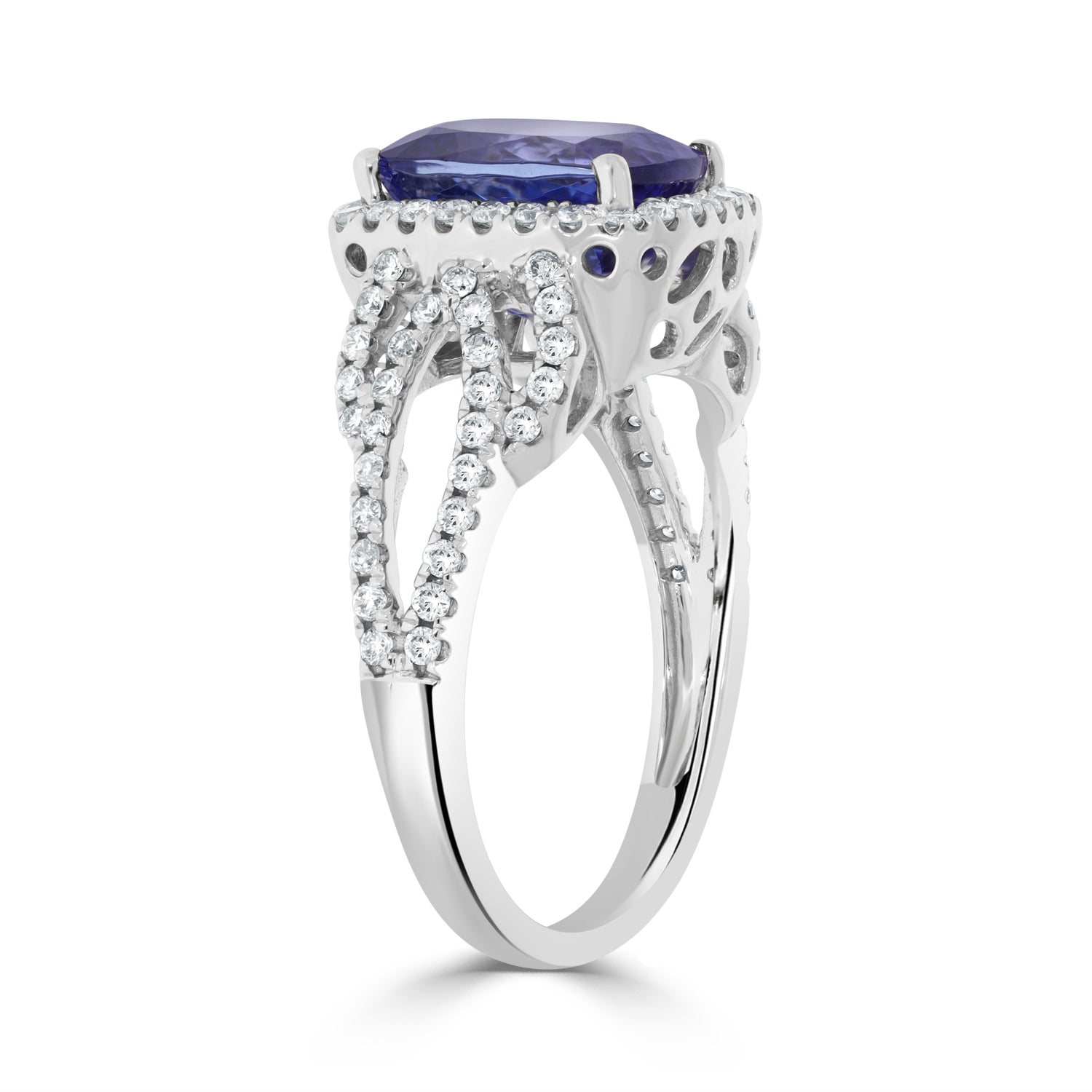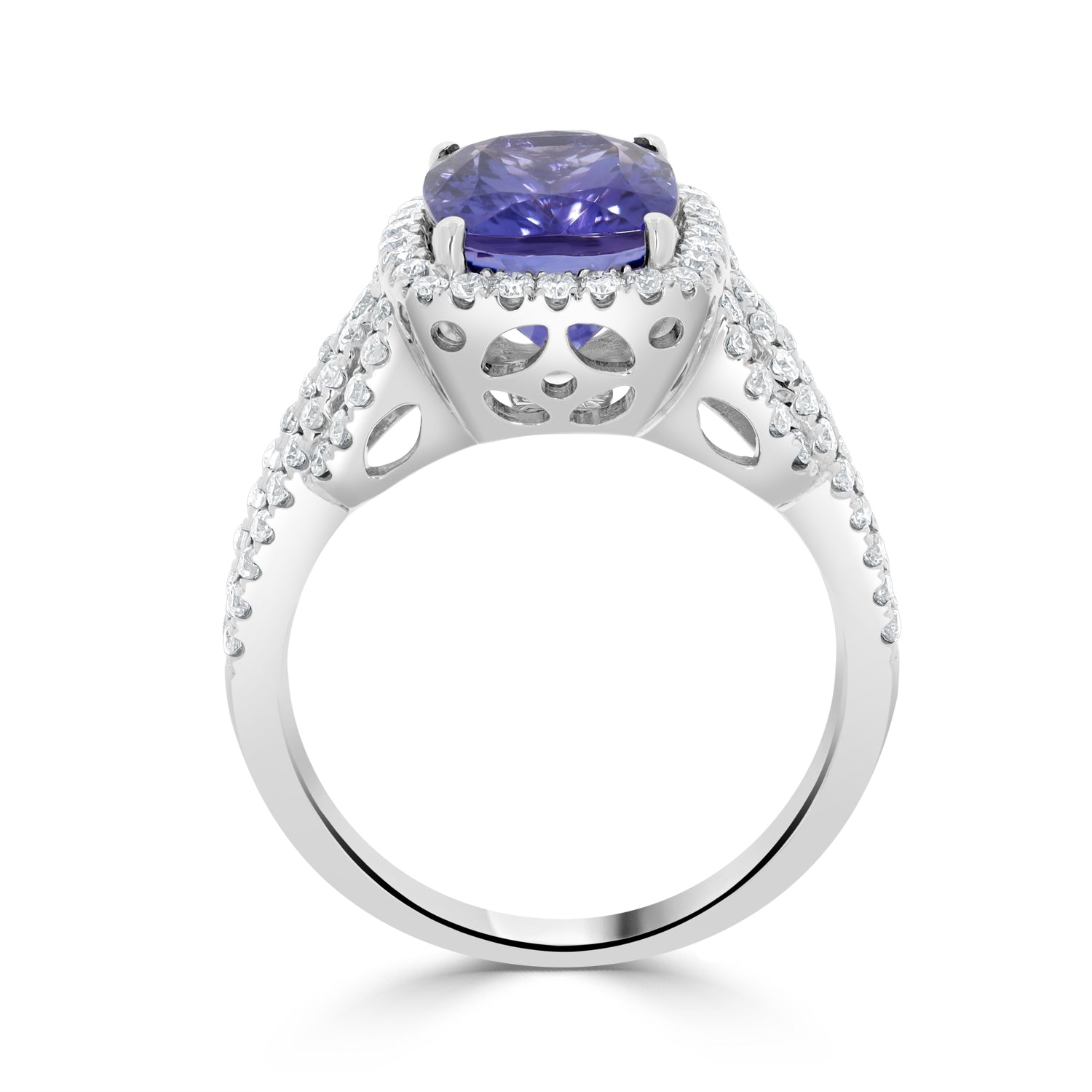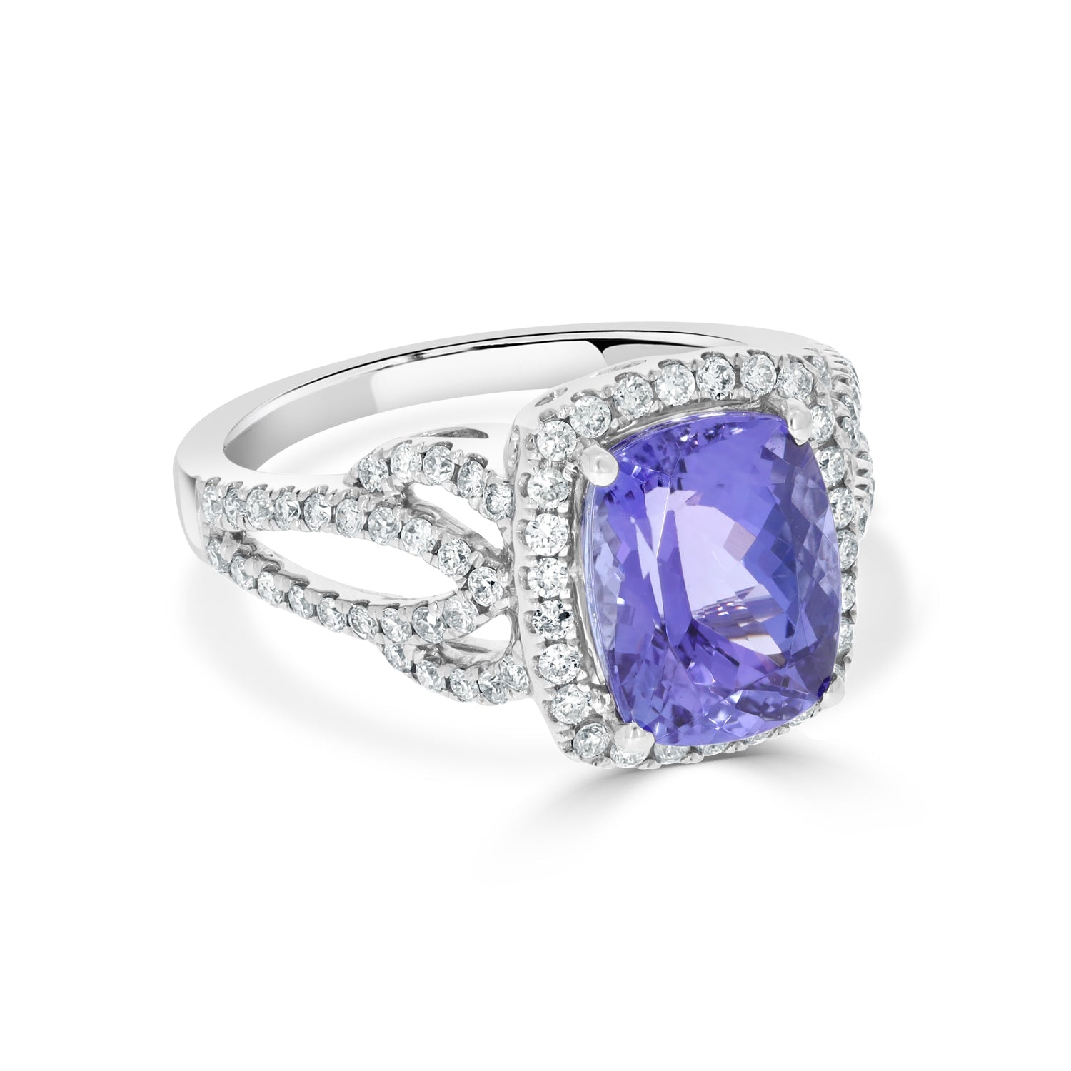 Set With A Dazzling Cushion Cut Tanzanite, The Exceptional Craftsmanship Of This Ring Makes It Stand Out. Designed With 14K White Gold, It Is Bordered By Gorgeous Round Cut Diamonds Which Give This Marvelous Ring A Touch Of Glamour.