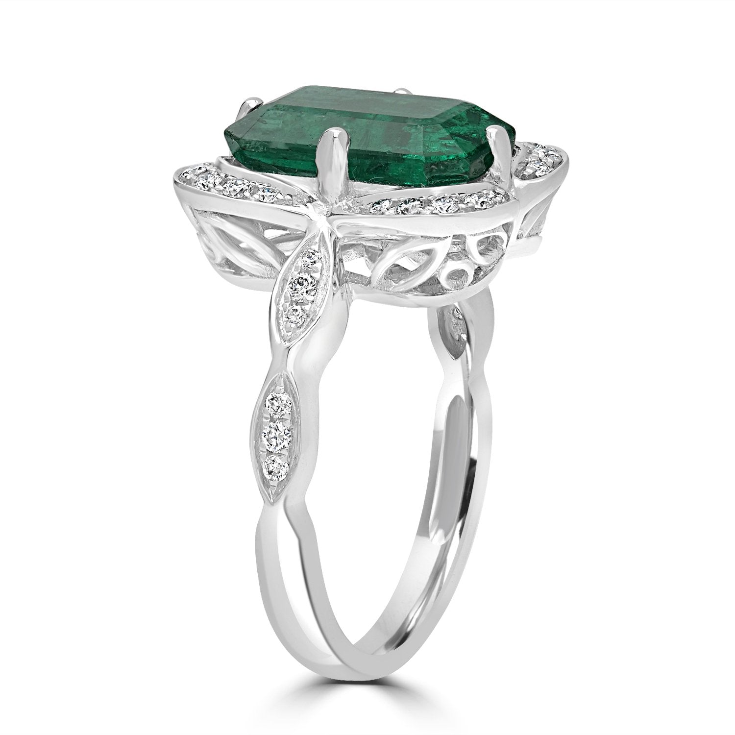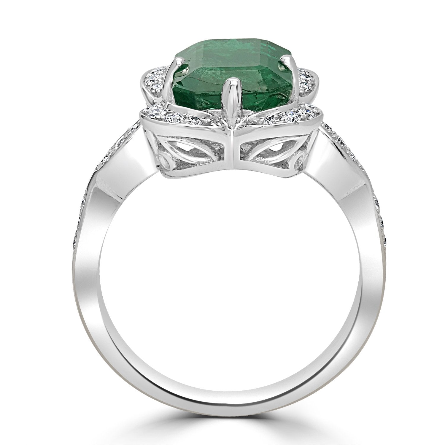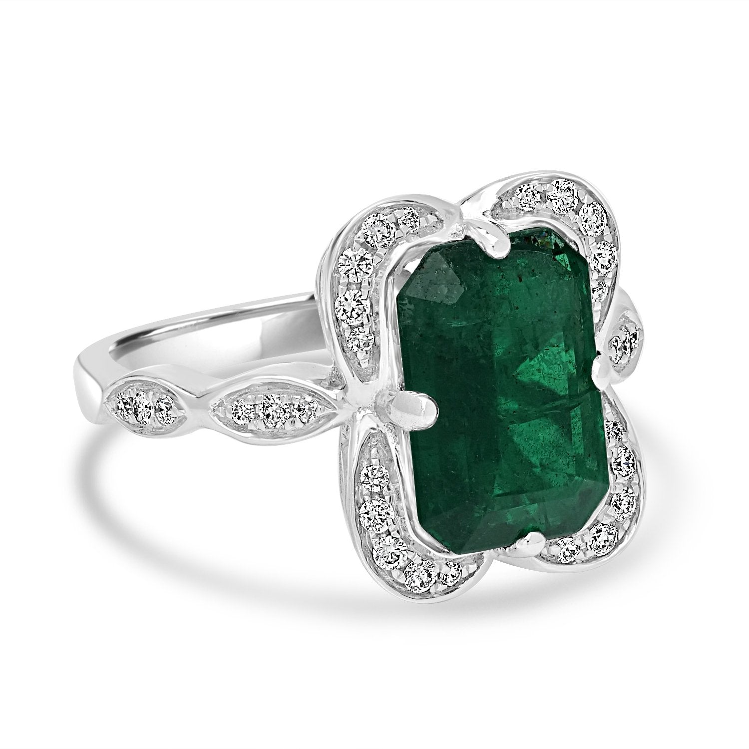 Make a dazzling statement with this shimmering ring. Crafted with 14K white gold, and set with an emerald-cut Emerald and round Diamonds that will hypnotize everyone around you.