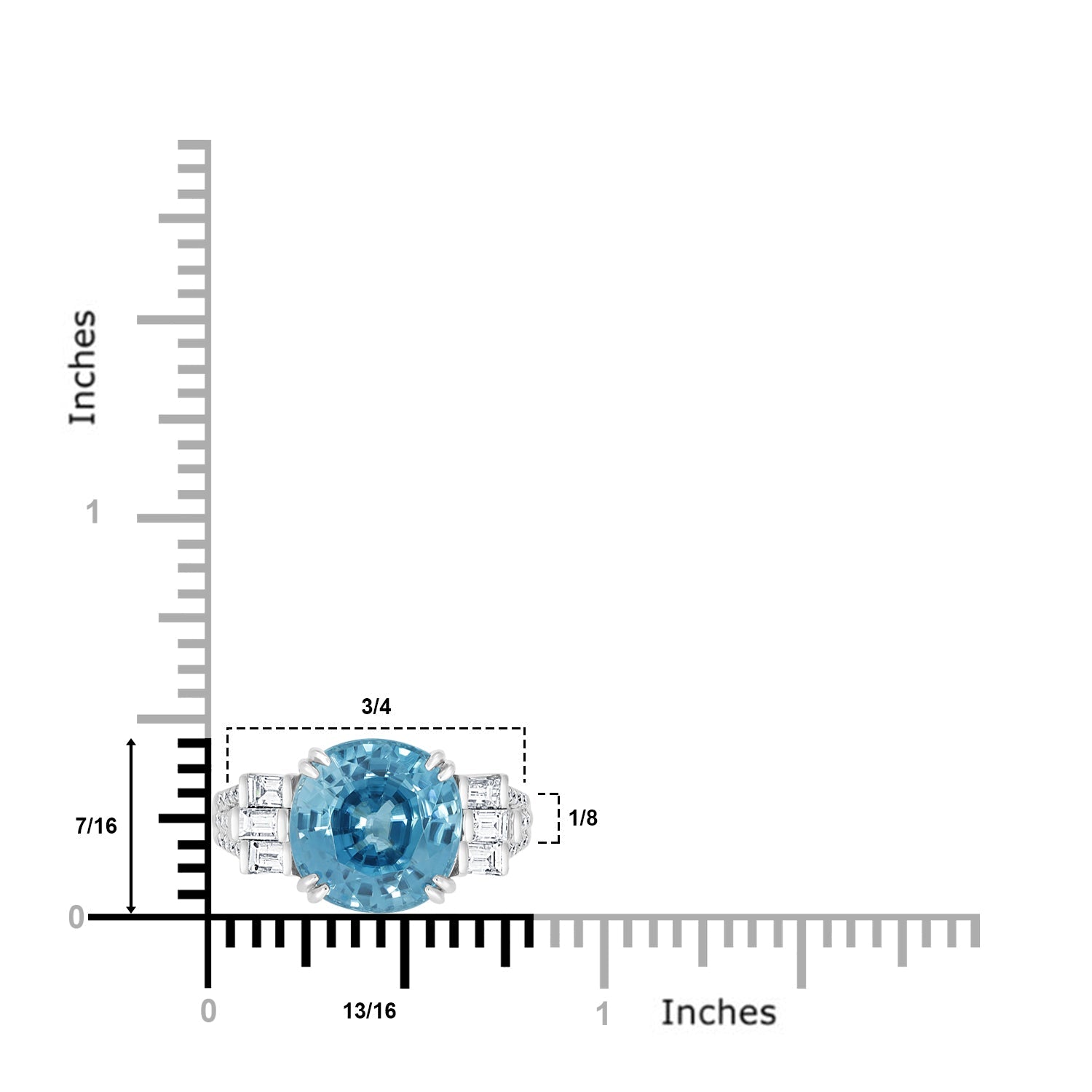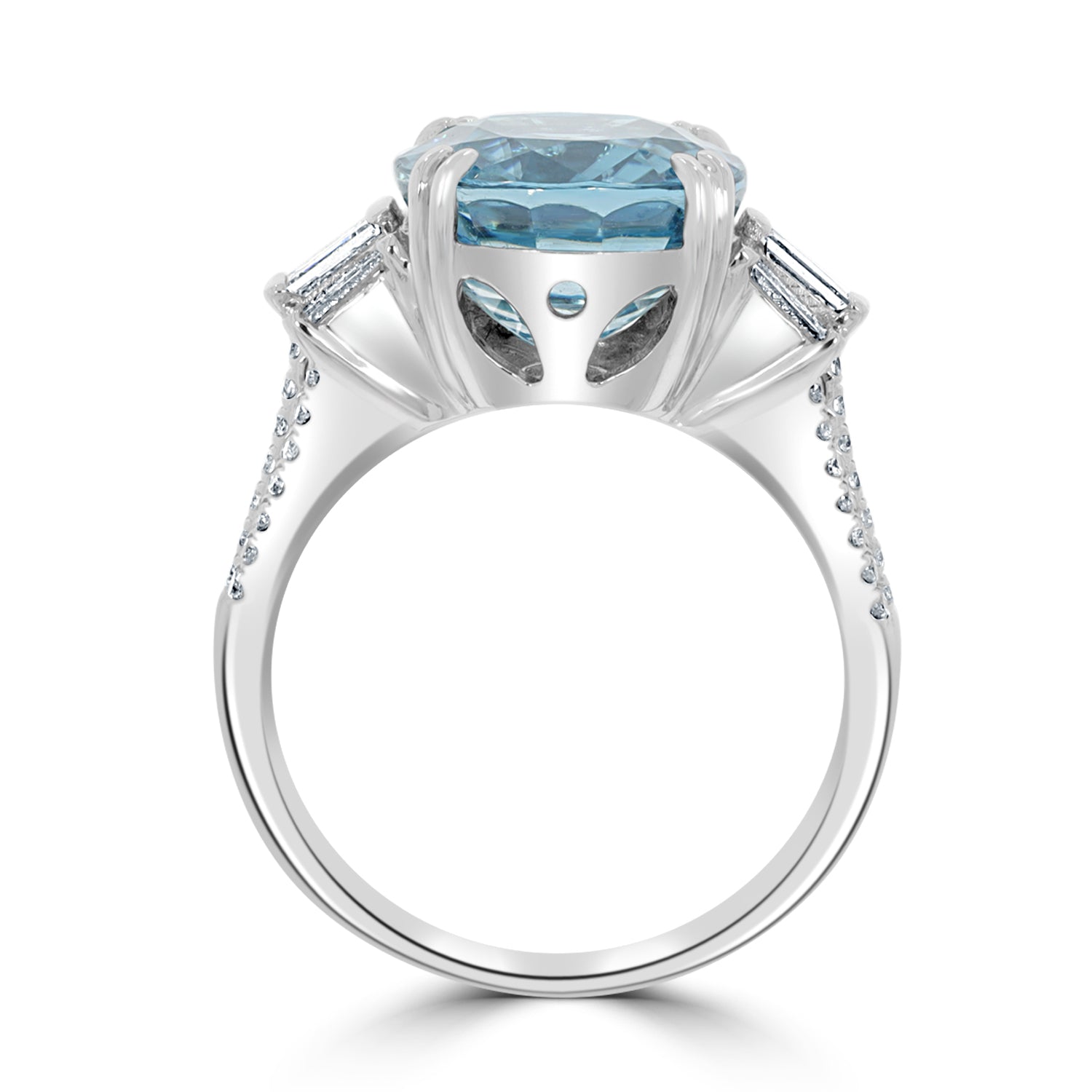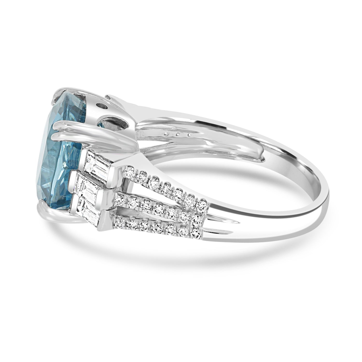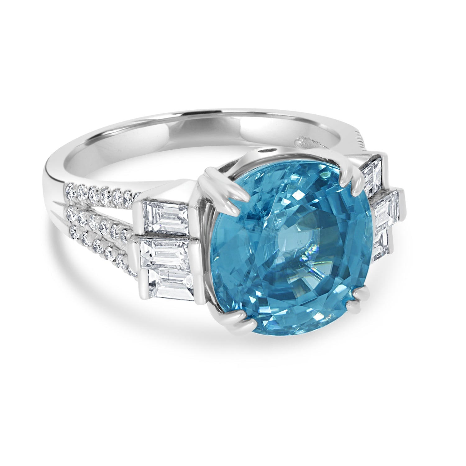 Designed with luminous 14K white gold, this luxurious ring is set with an eye-catching radiant round cut Blue Zircon. Bordered by splendid round cut Diamonds.