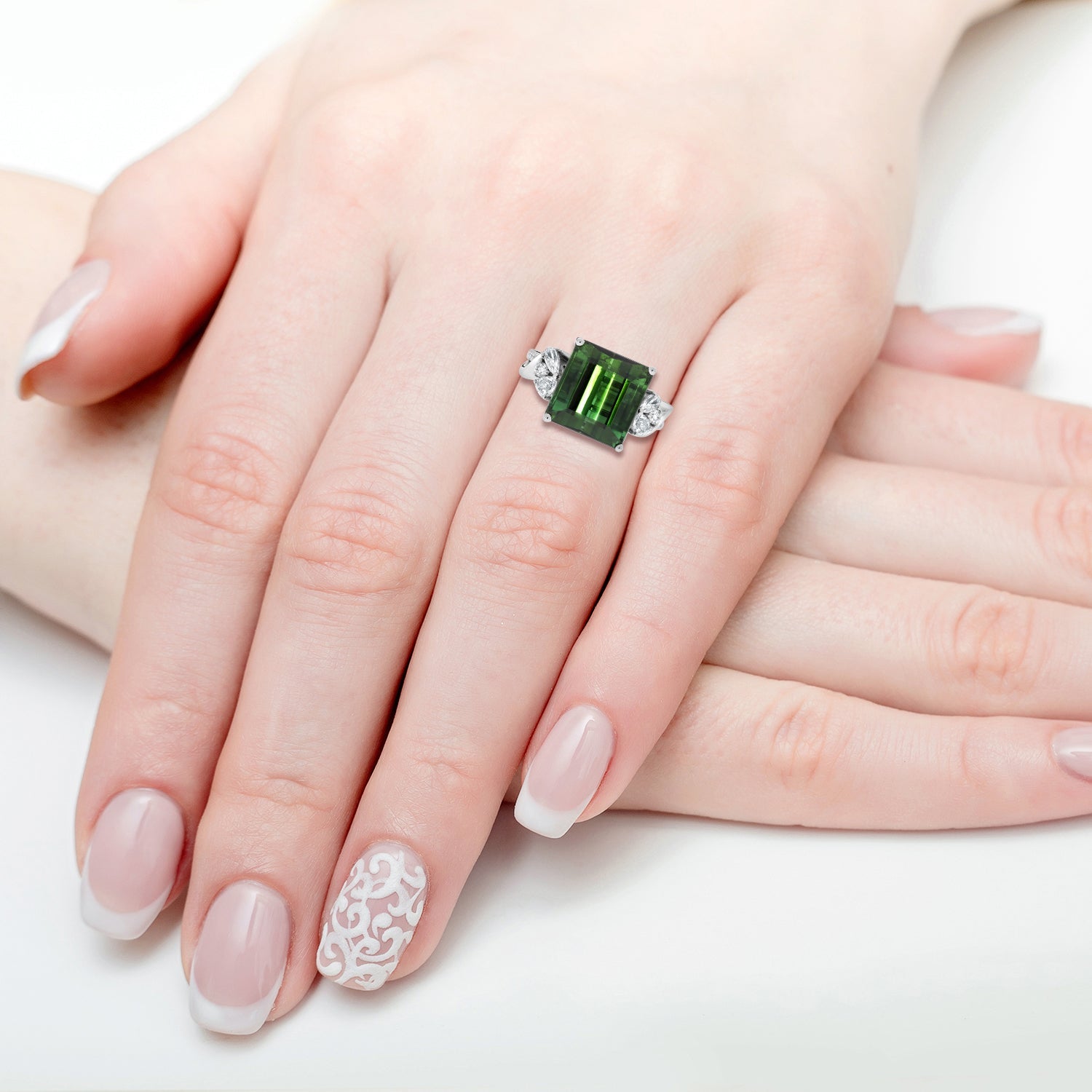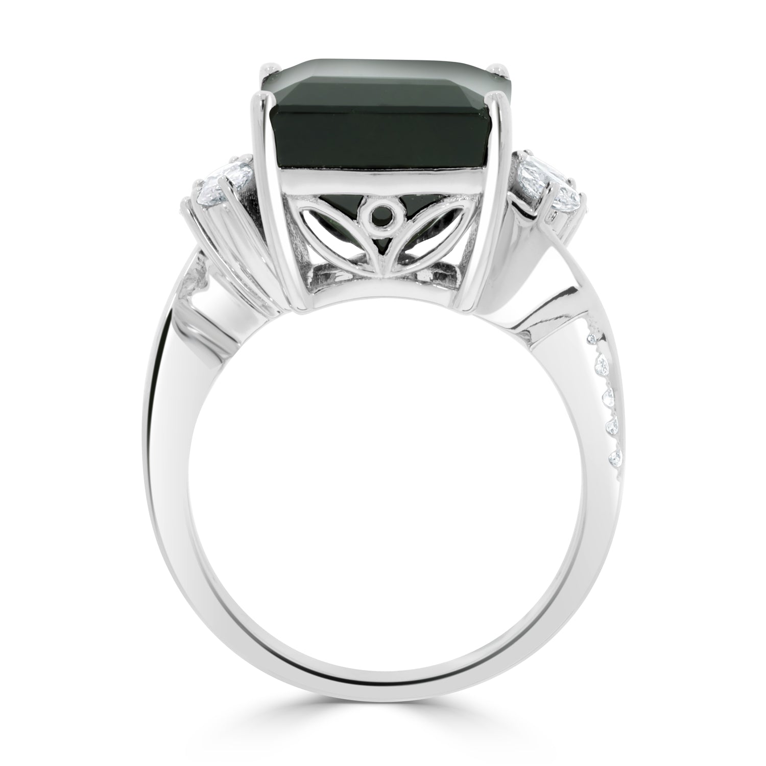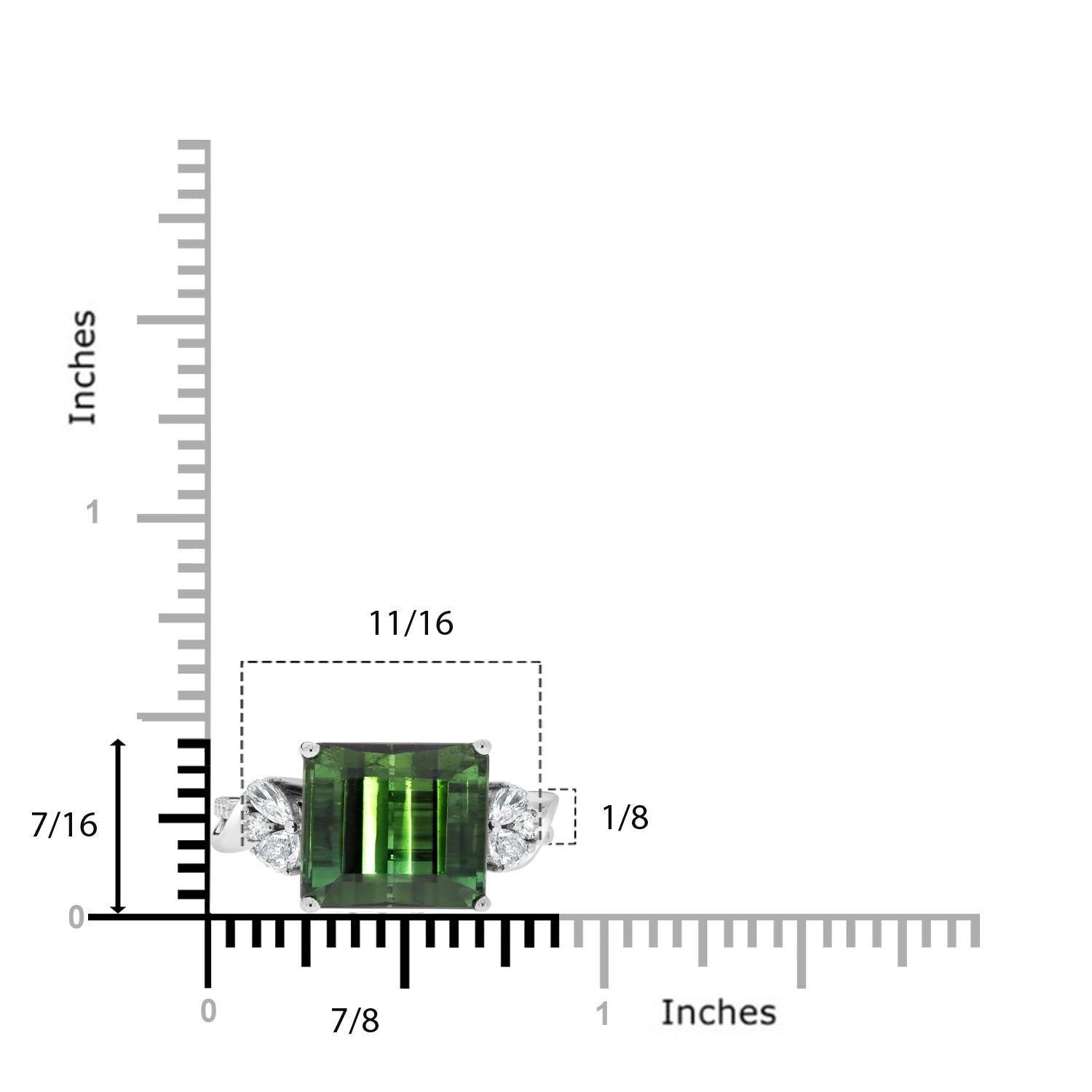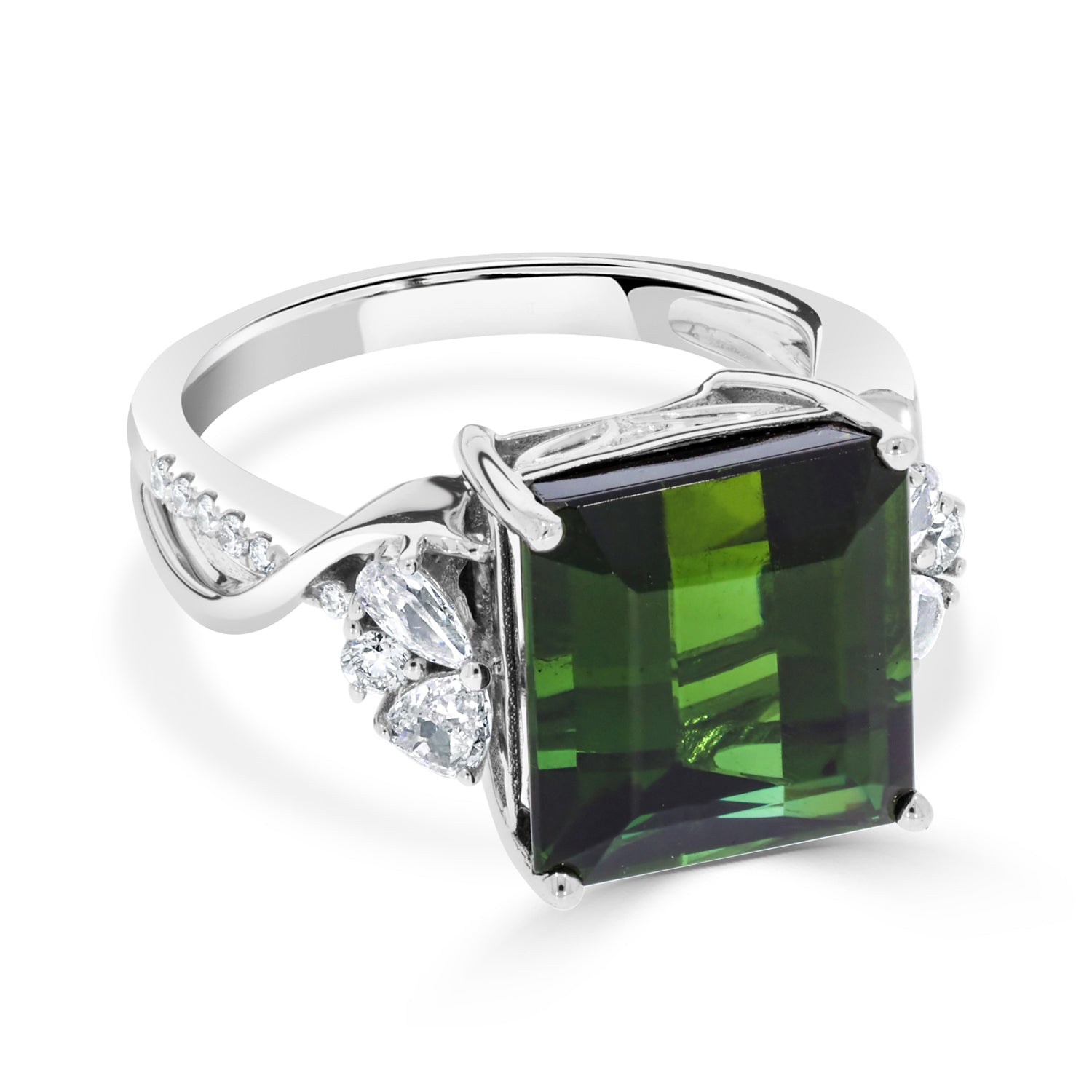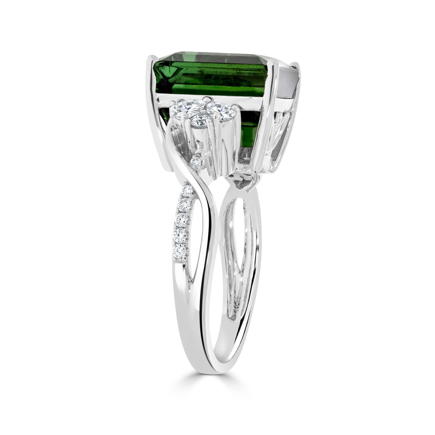 Fashioned from 14kt white gold, this ring has an exceptional world-class design that makes it fresh and youthful. Echo your fashion sense wearing this impressive ring that shines with the radiance of emerald-cut Tourmaline and round Diamonds.