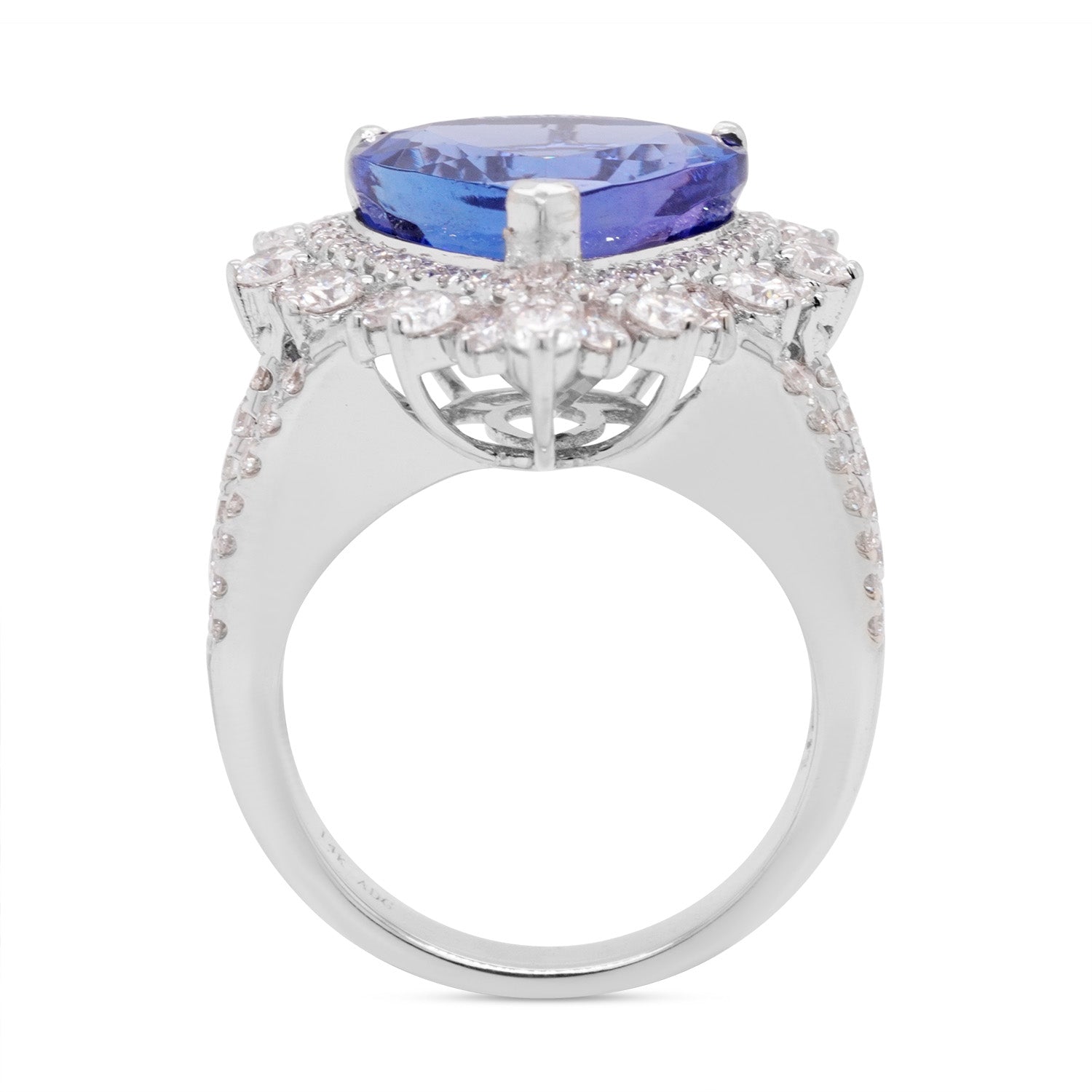 The modern and classic styles of this ring give your ensemble an effortless finish. Designed in 14K white gold, its glorious sheen gives your look a rich finish while the brilliance of the pear cut Tanzanite adds a dash of glamour. Furthermore, this striking gemstone is flanked by round cut Diamonds which give it sparkle and shine. Jewelry that you will never take off, opt for this incredible ring soon!