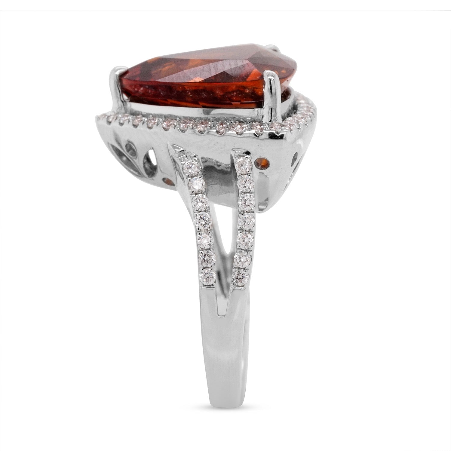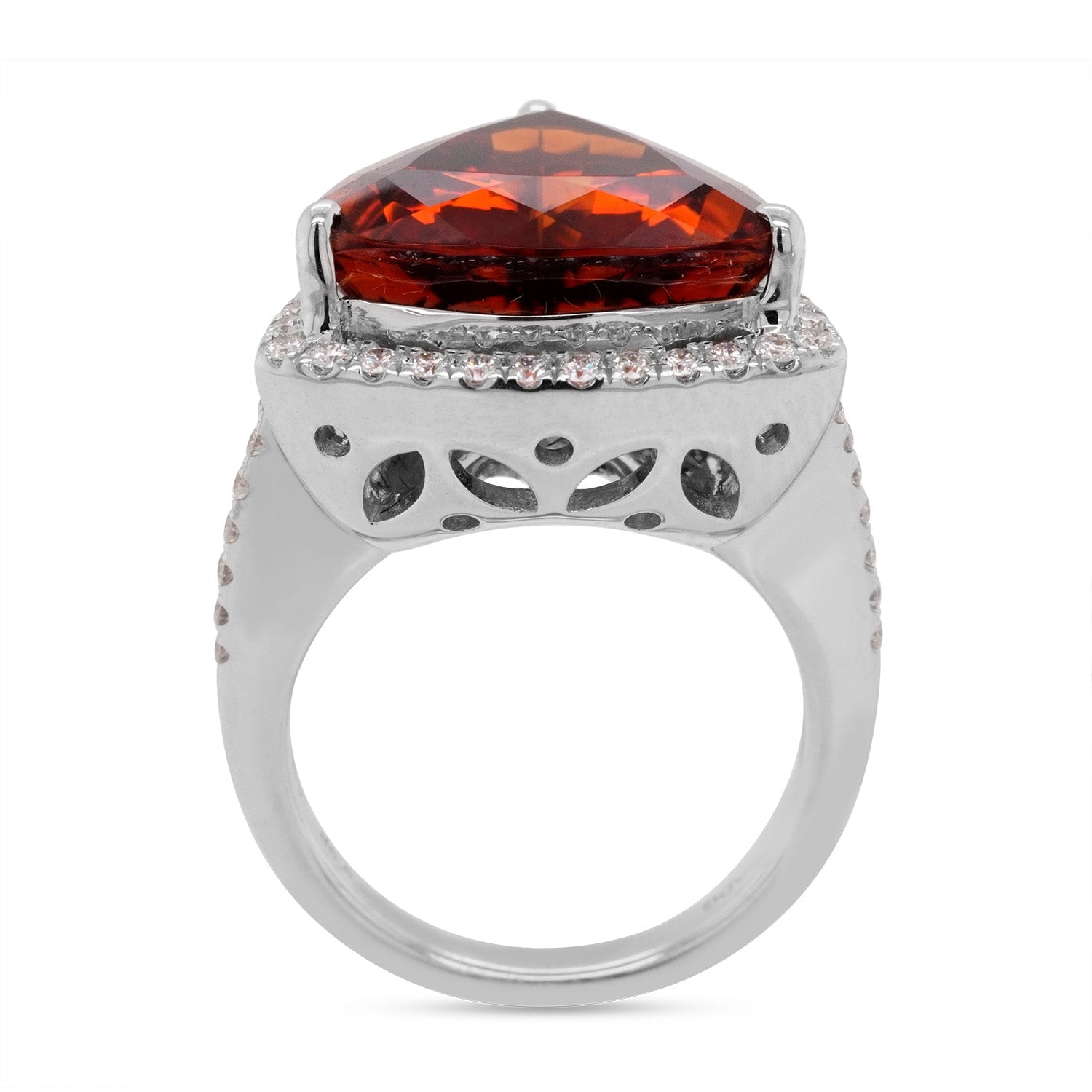 Embellished with the rarest of rare Madeira Citrine, the trillion cut of this stunning gemstone gives this ring a unique radiance that catches the eye. Heightened further by the shimmer of the round cut Diamonds, the luminosity of this captivating ring shows off its excellent craftsmanship. Designed in 14K white gold, wear the rich polish of this ring anywhere to leave an unforgettable impression!