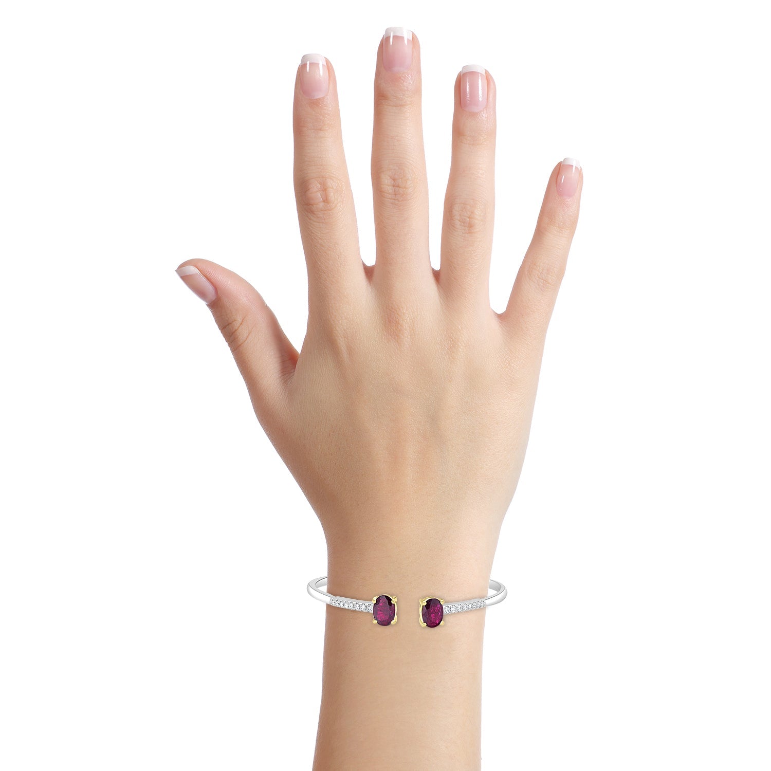 "These stylish bangles are crafted with 18k white gold and set with an oval-cut Ruby and round Diamonds. This piece is perfect for special occasions!"