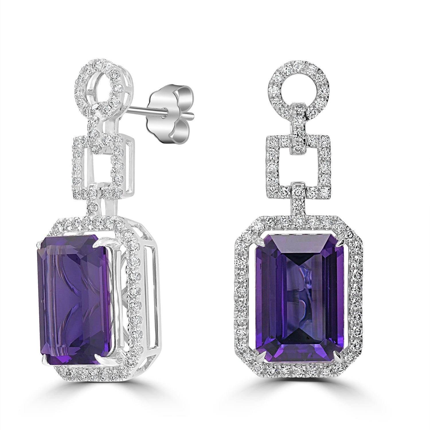 Fashioned from 18k white gold, these earrings make an unforgettable statement. Crafted from 18k white gold and set with an emerald-cut Amethyst and round Diamonds, these excellent earrings are sure get compliments.