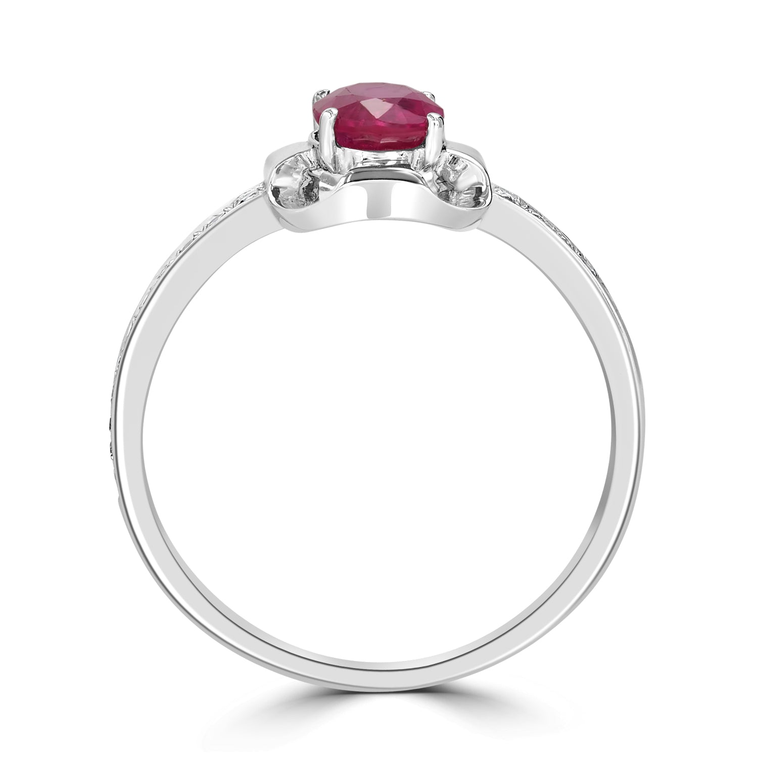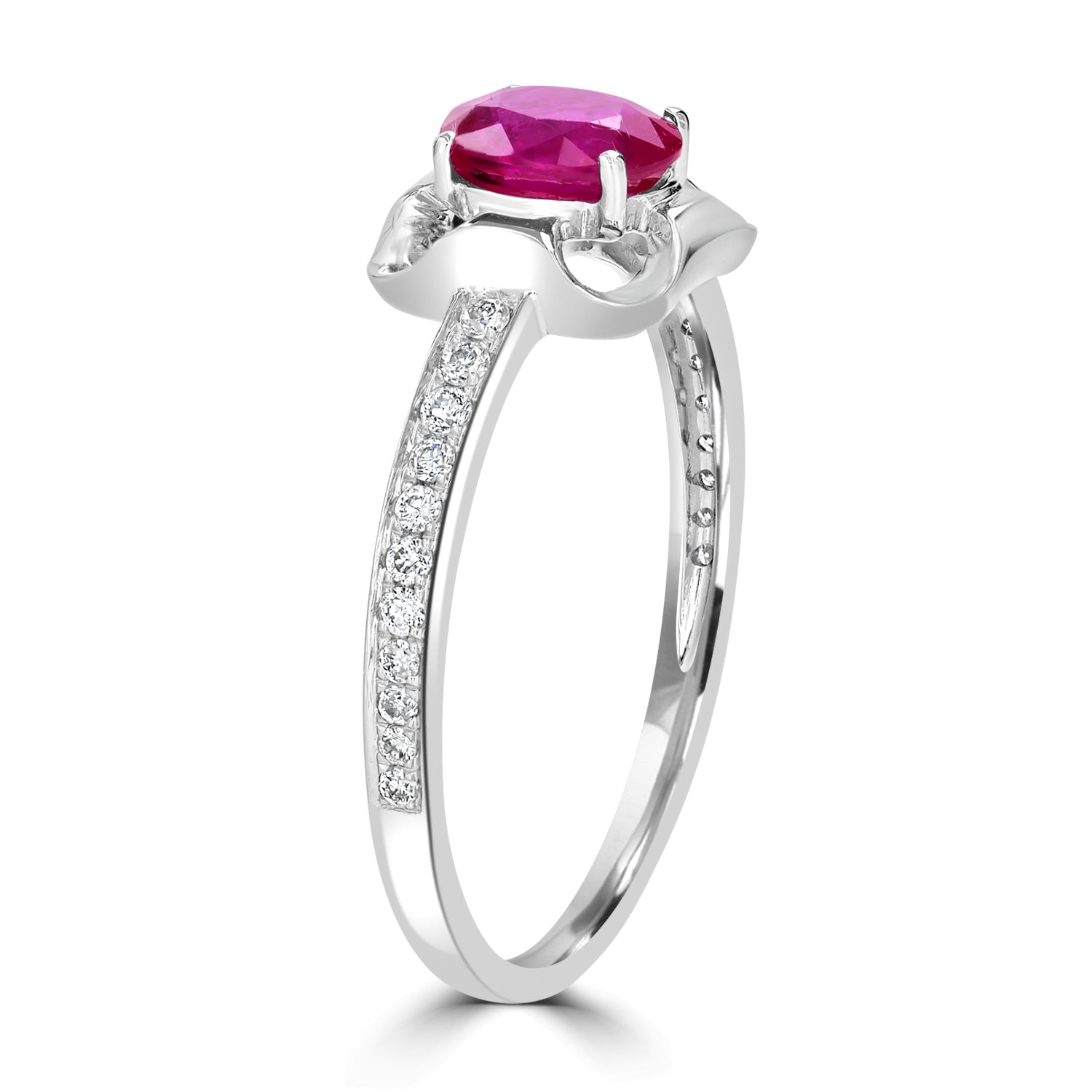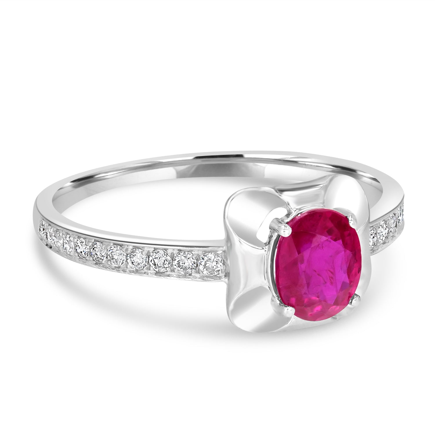 This beautiful ring provides is designed from 18k white gold and set with oval-cut Ruby and round Diamonds. It's sure to get you compliments.