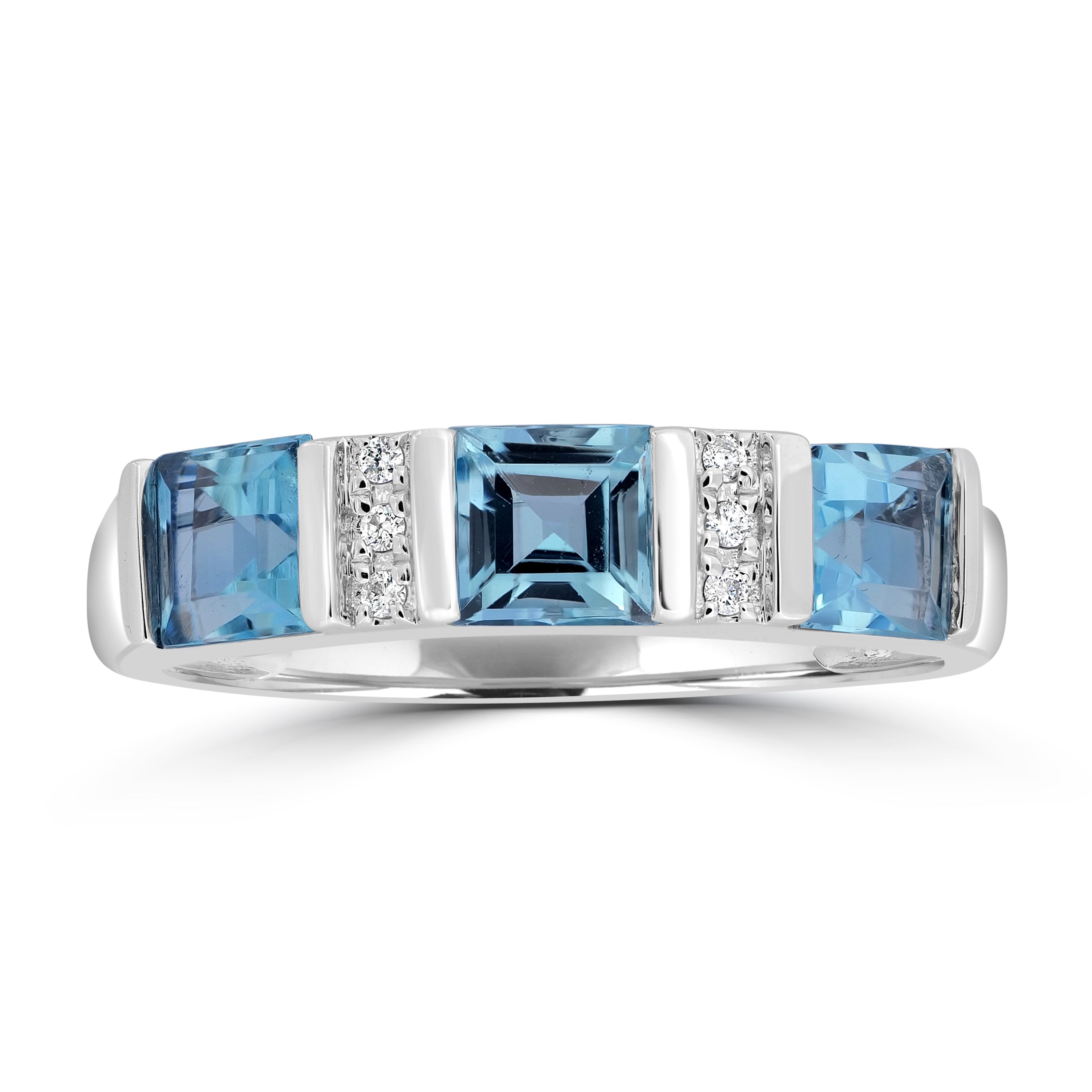 This excellent 18K white gold ring showcases ethereal charm, adding mystique and glamour to your personality. The ring gives a luxury style kick with its high-class design. Expertly fashioned and set with square-cut Aquamarine and round Diamonds, this alluring ring is perfect for parties and special occasions.