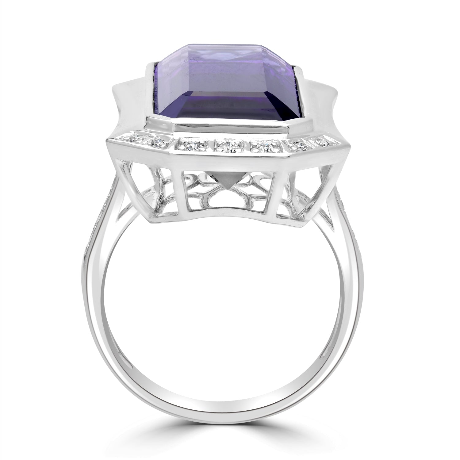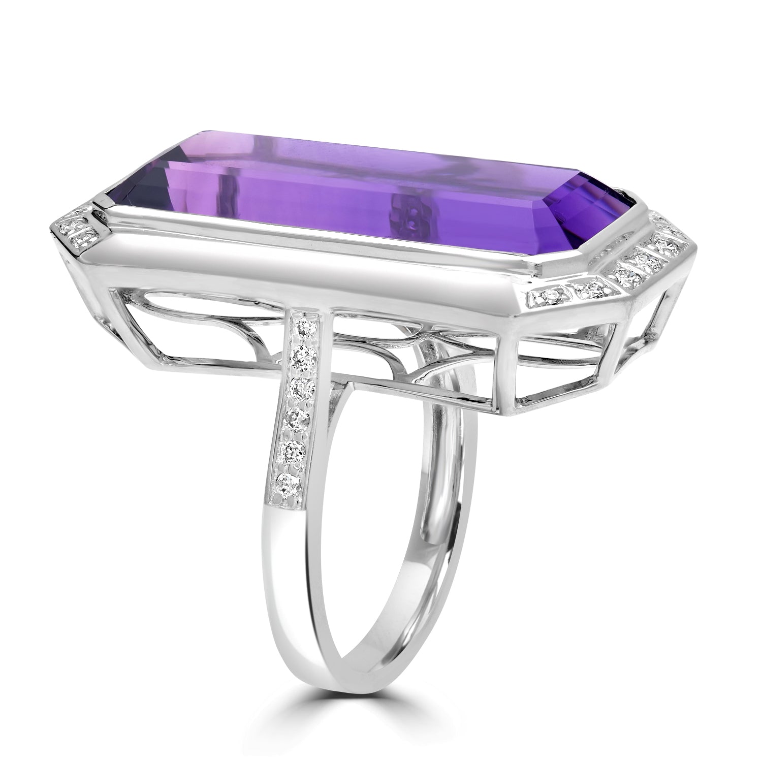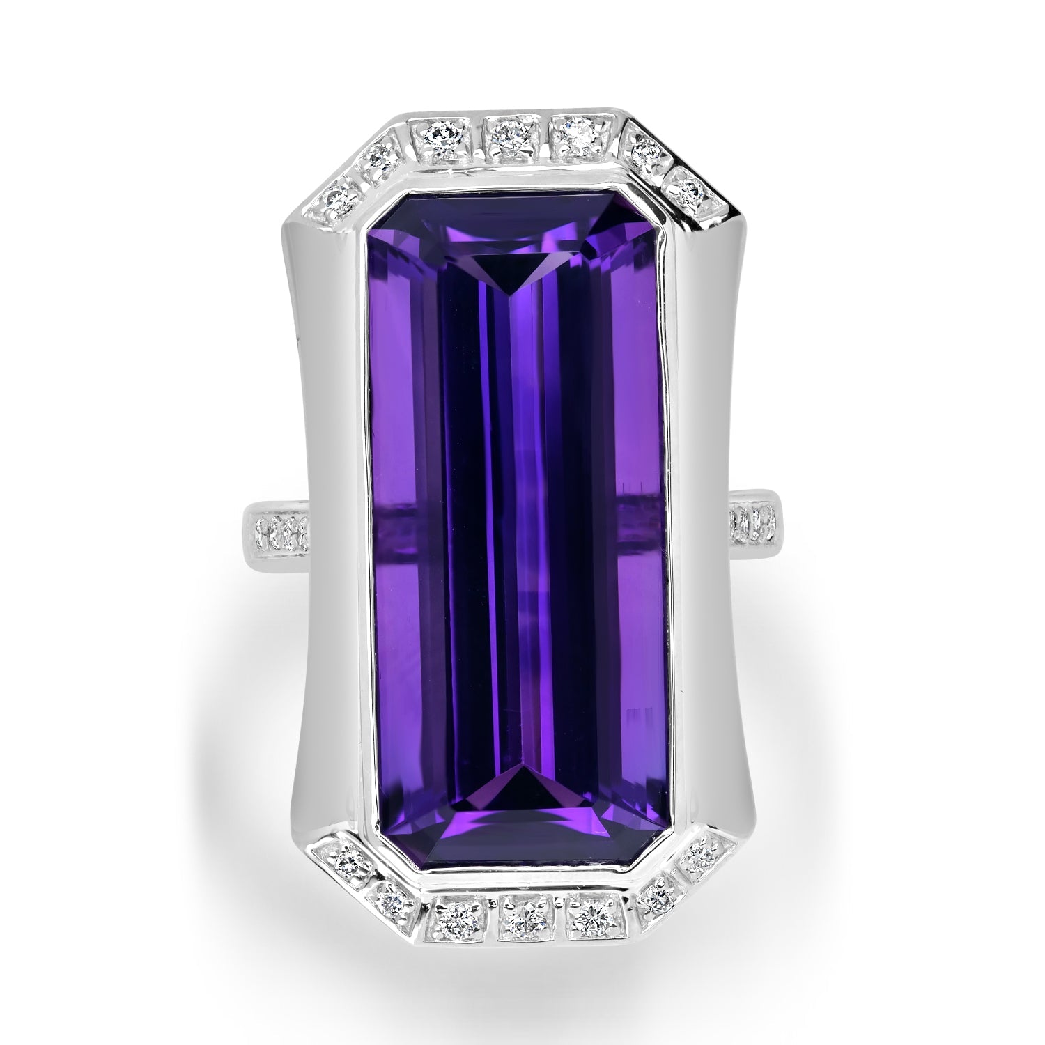 This ring is crafted with 18K white gold and set with emerald-cut Amethyst and round Diamonds.