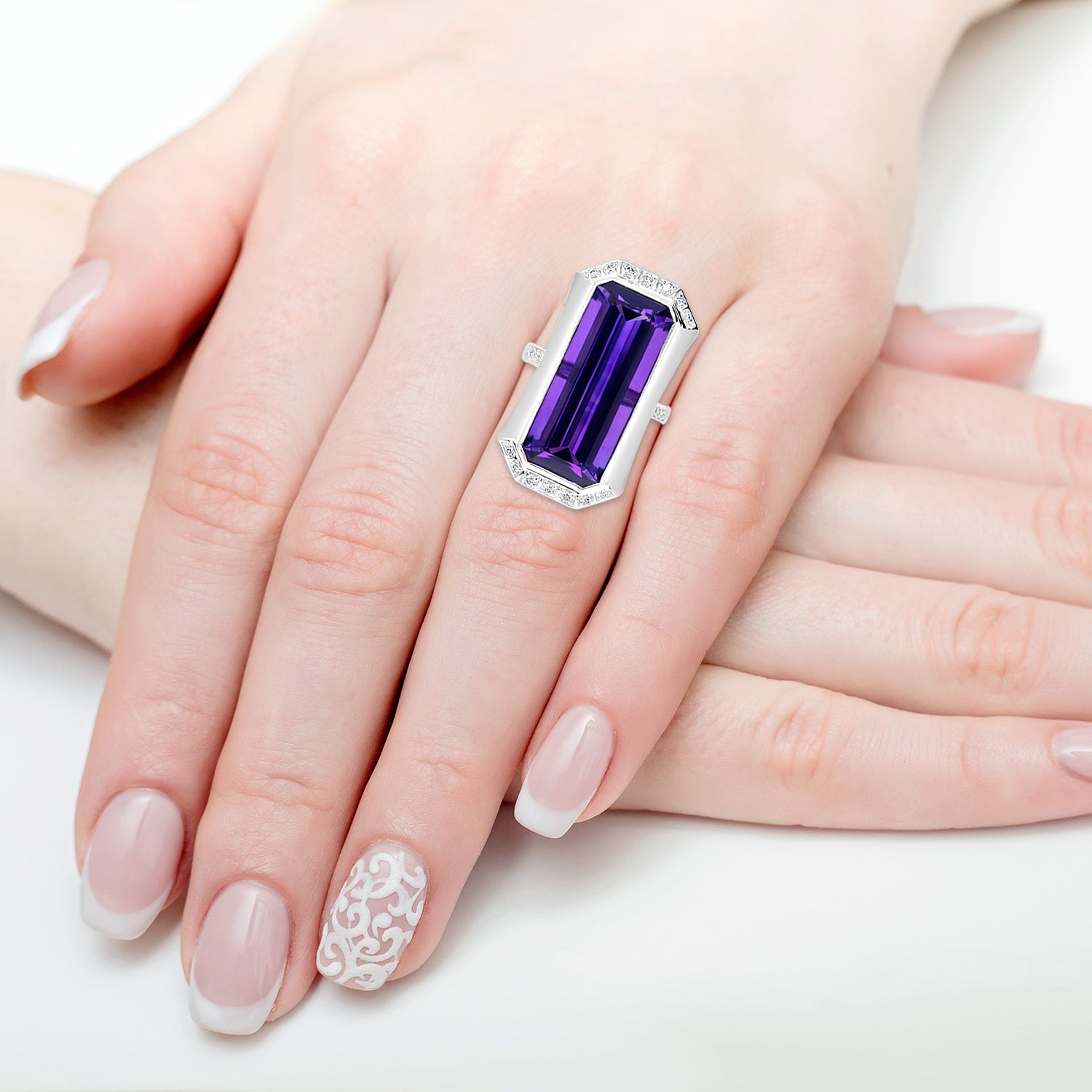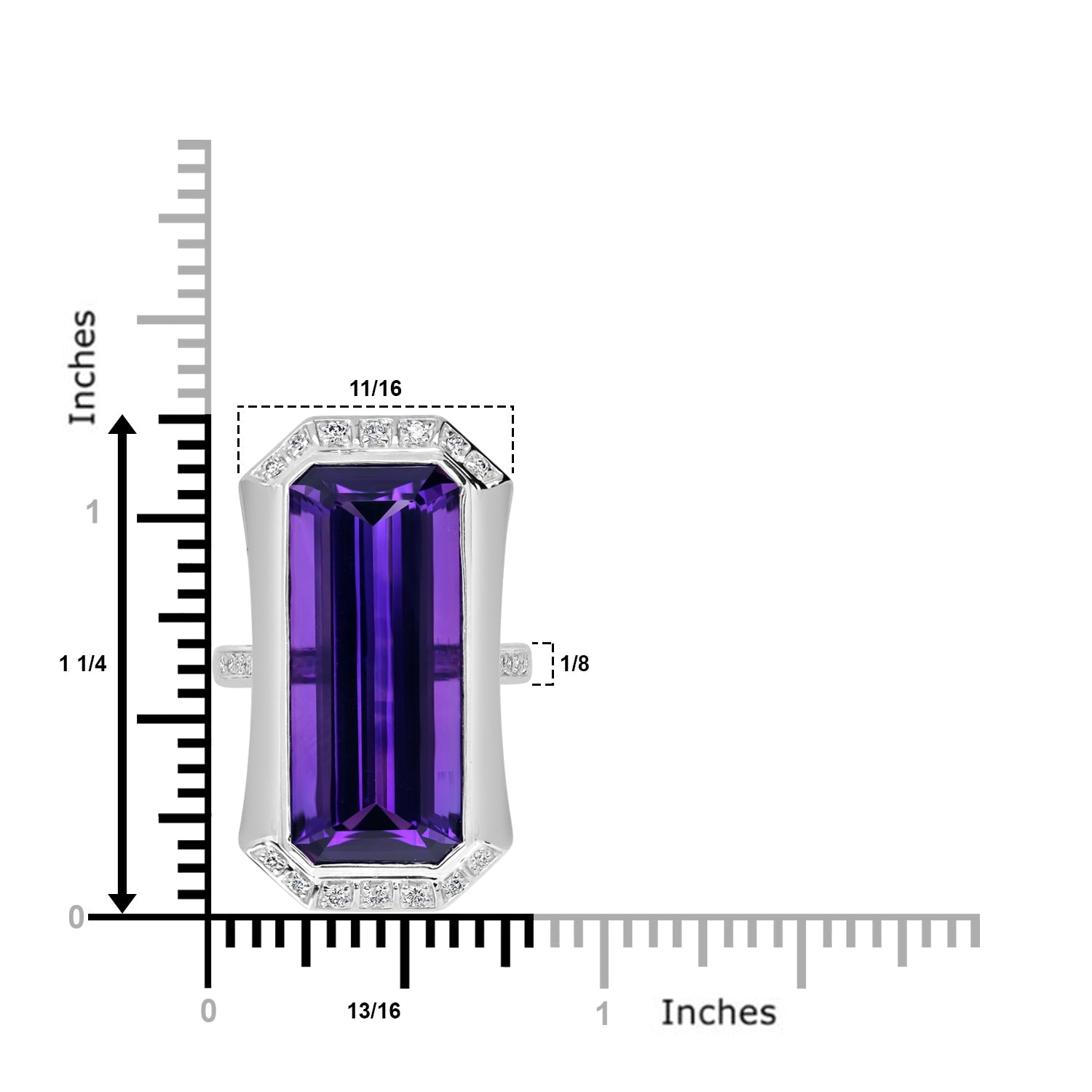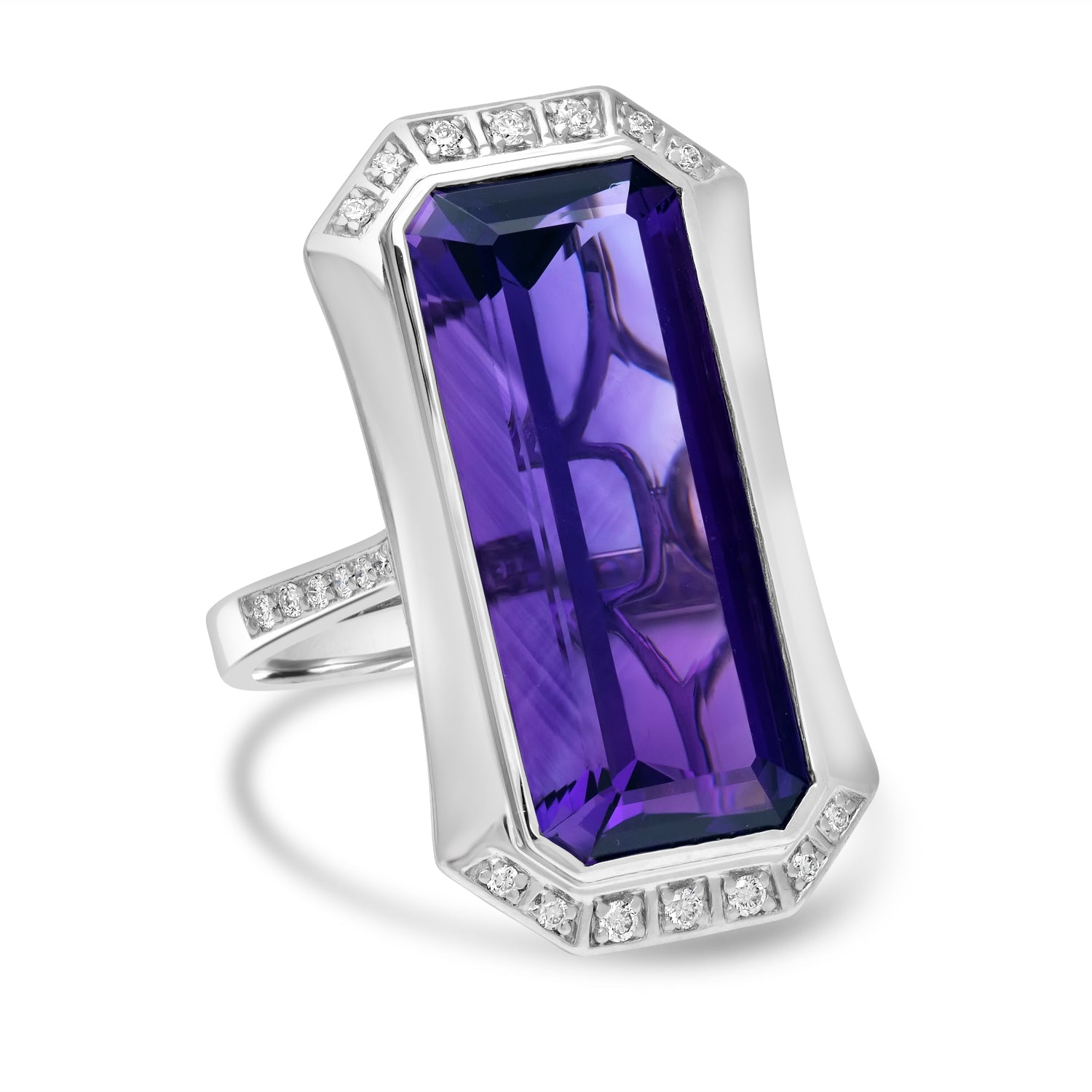 This ring is crafted with 18K white gold and set with emerald-cut Amethyst and round Diamonds.