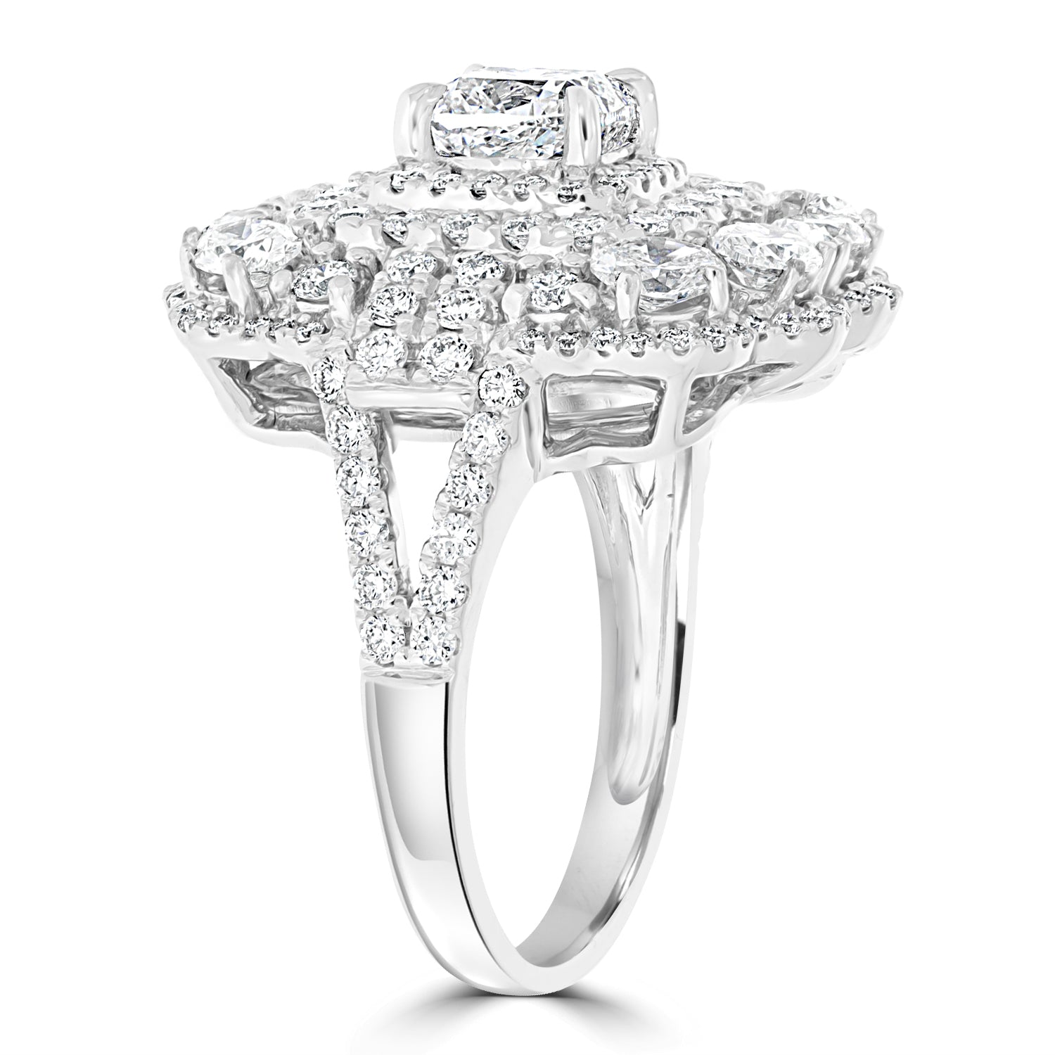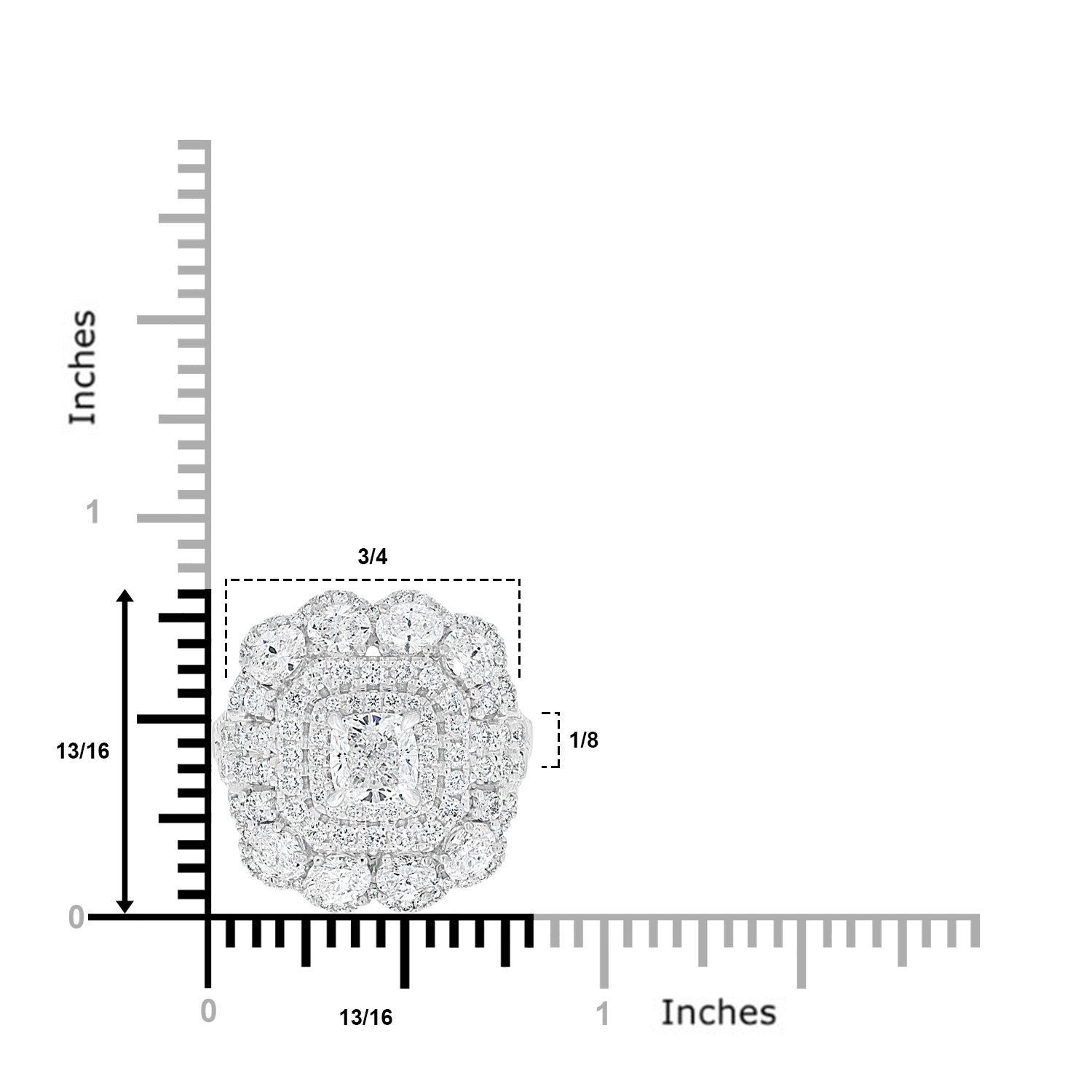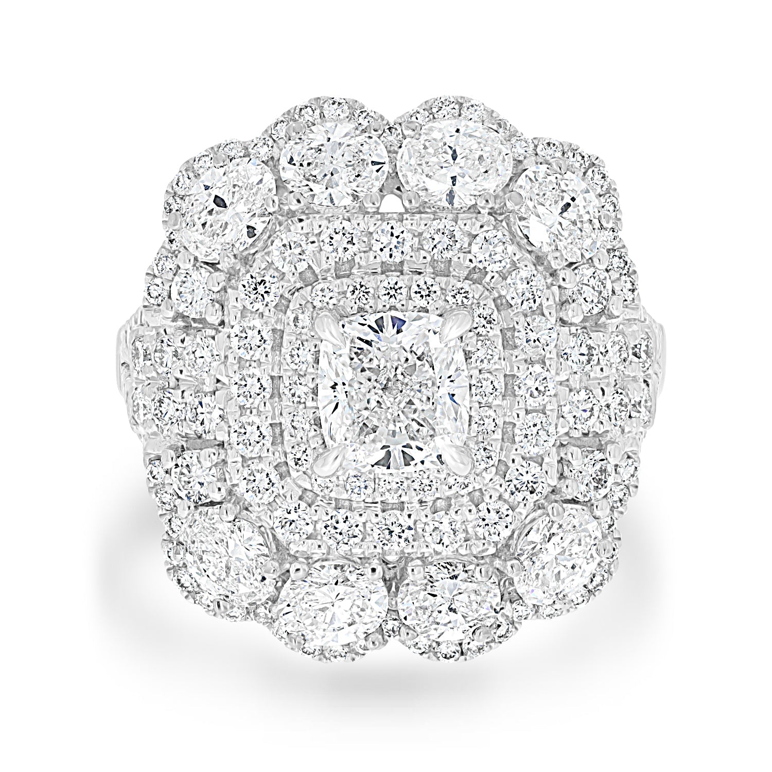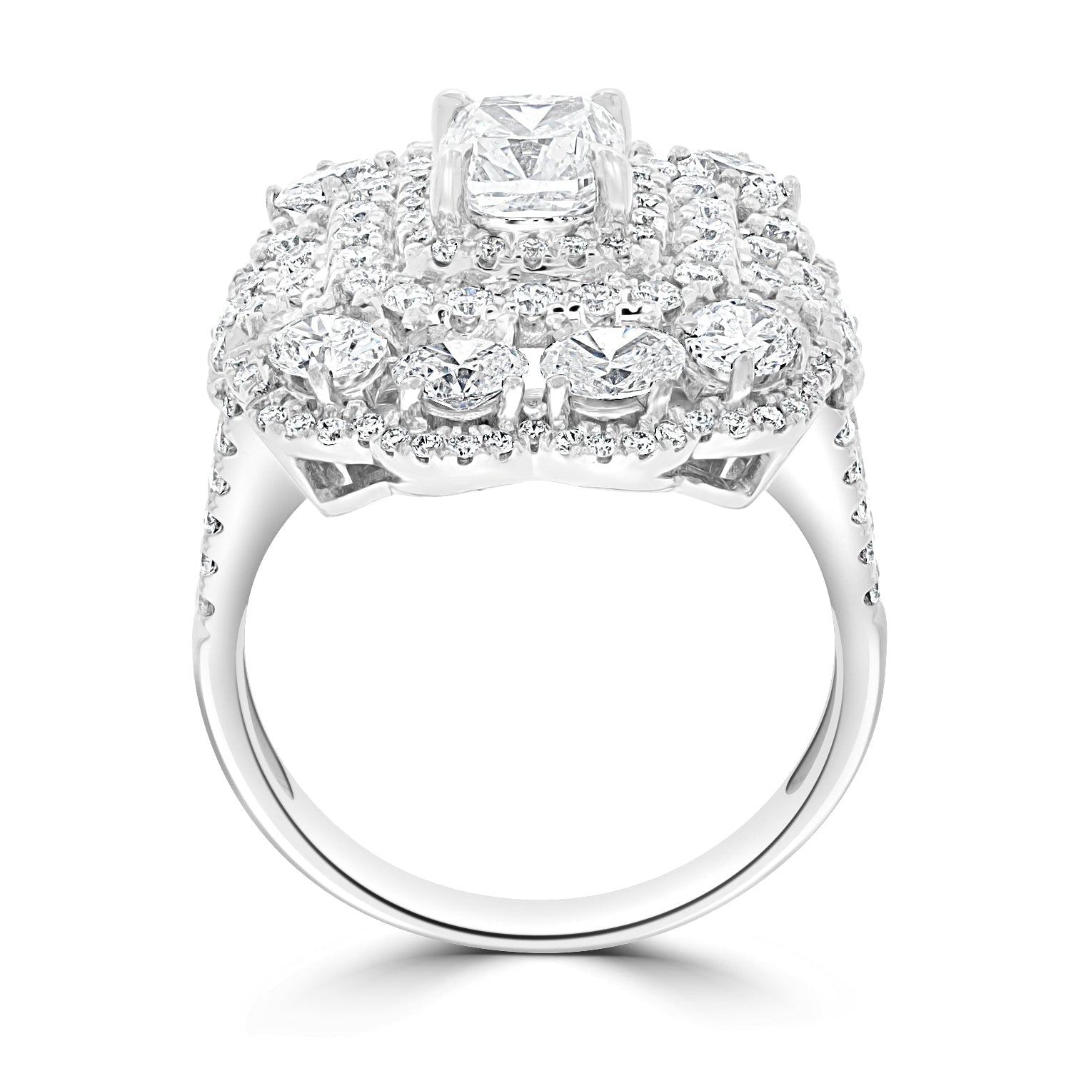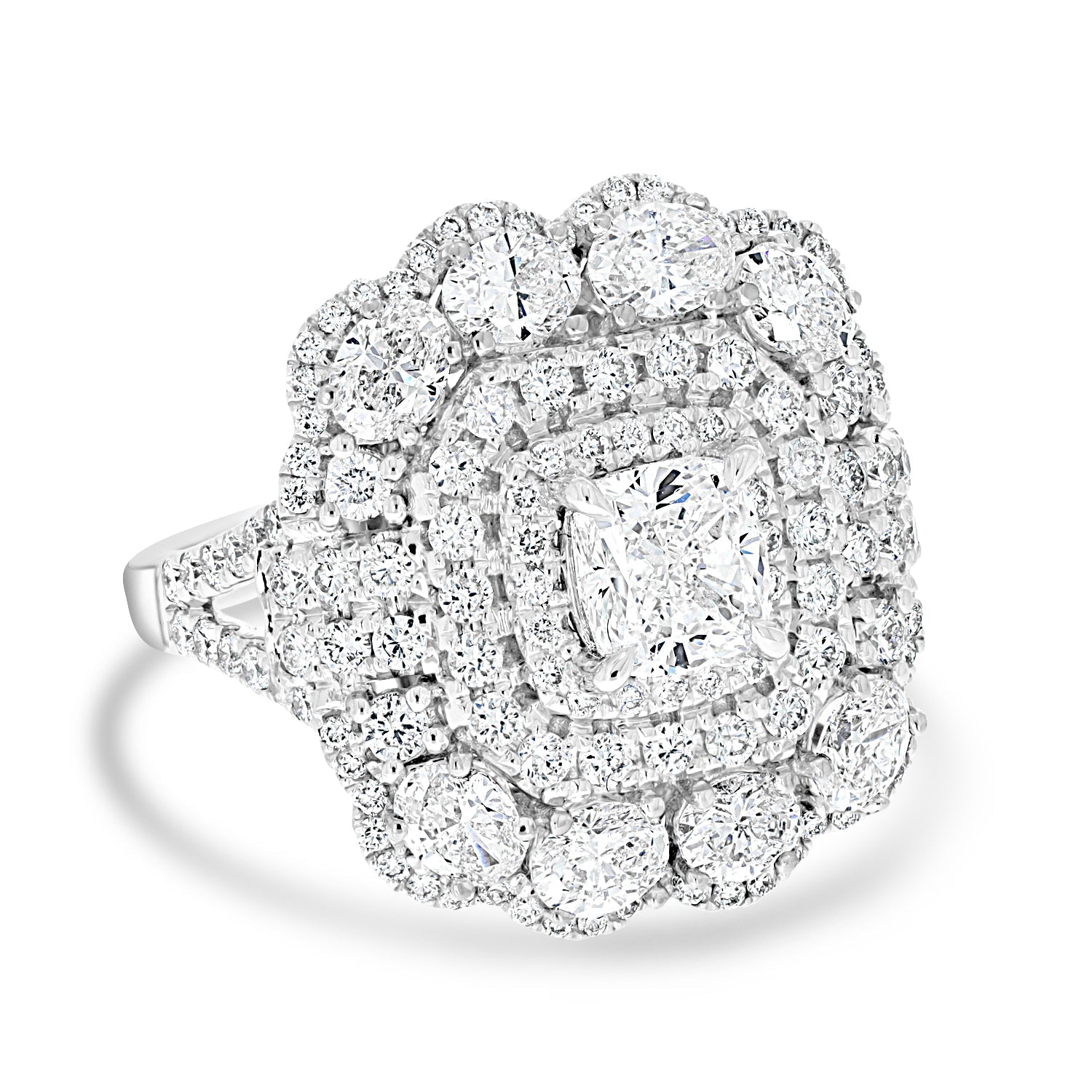 A perfect blend of glamour and elegance, this arresting ring is crafted from luminous 18K white gold. Set with a spectacular cushion cut Diamond, this beautiful piece is encircled with eye-catching round cut Diamonds.