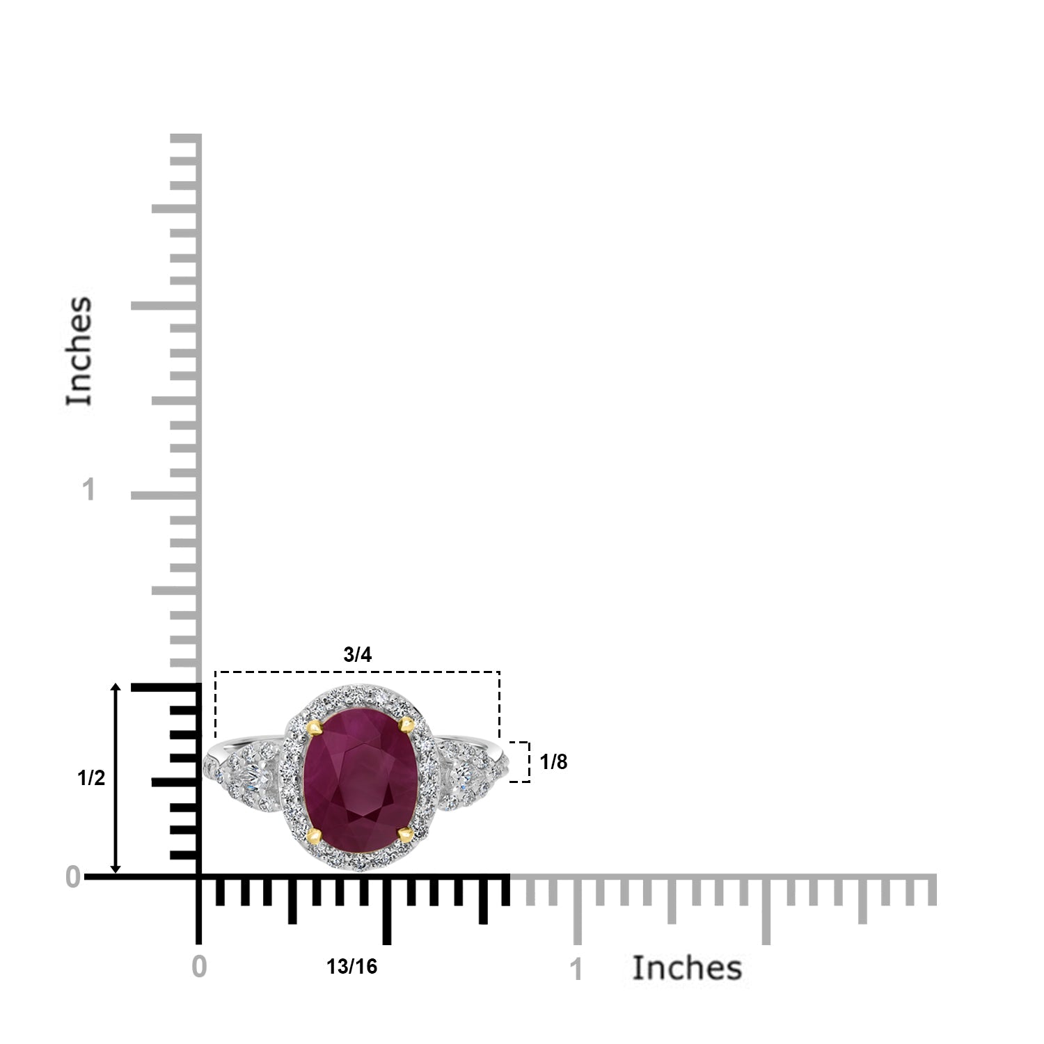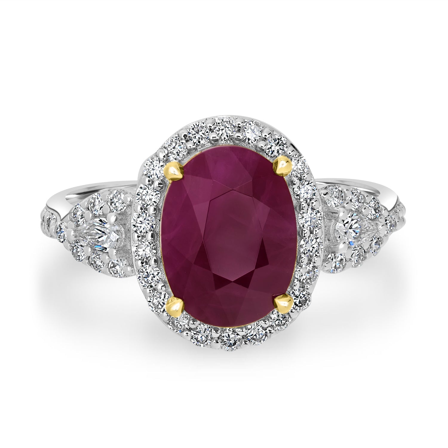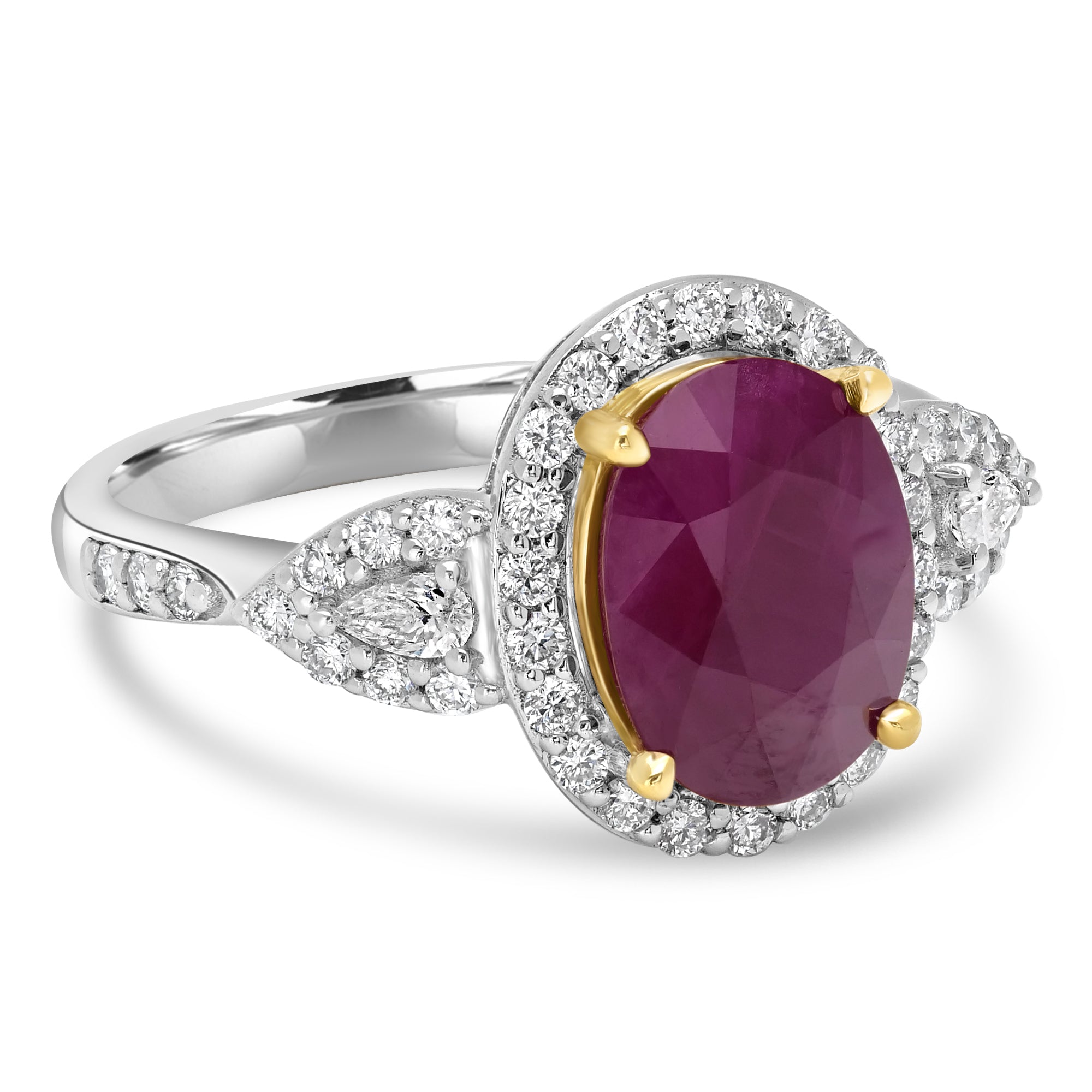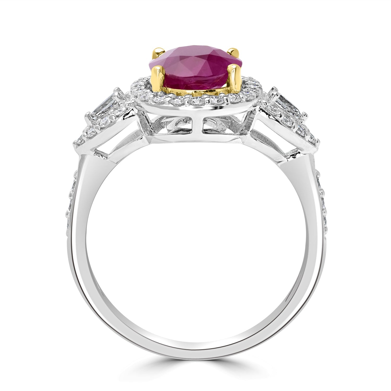 This classy ring is perfect for big and small occasions. Designed with 18K white gold, this ring showcases an oval-cut Ruby and round Diamonds.